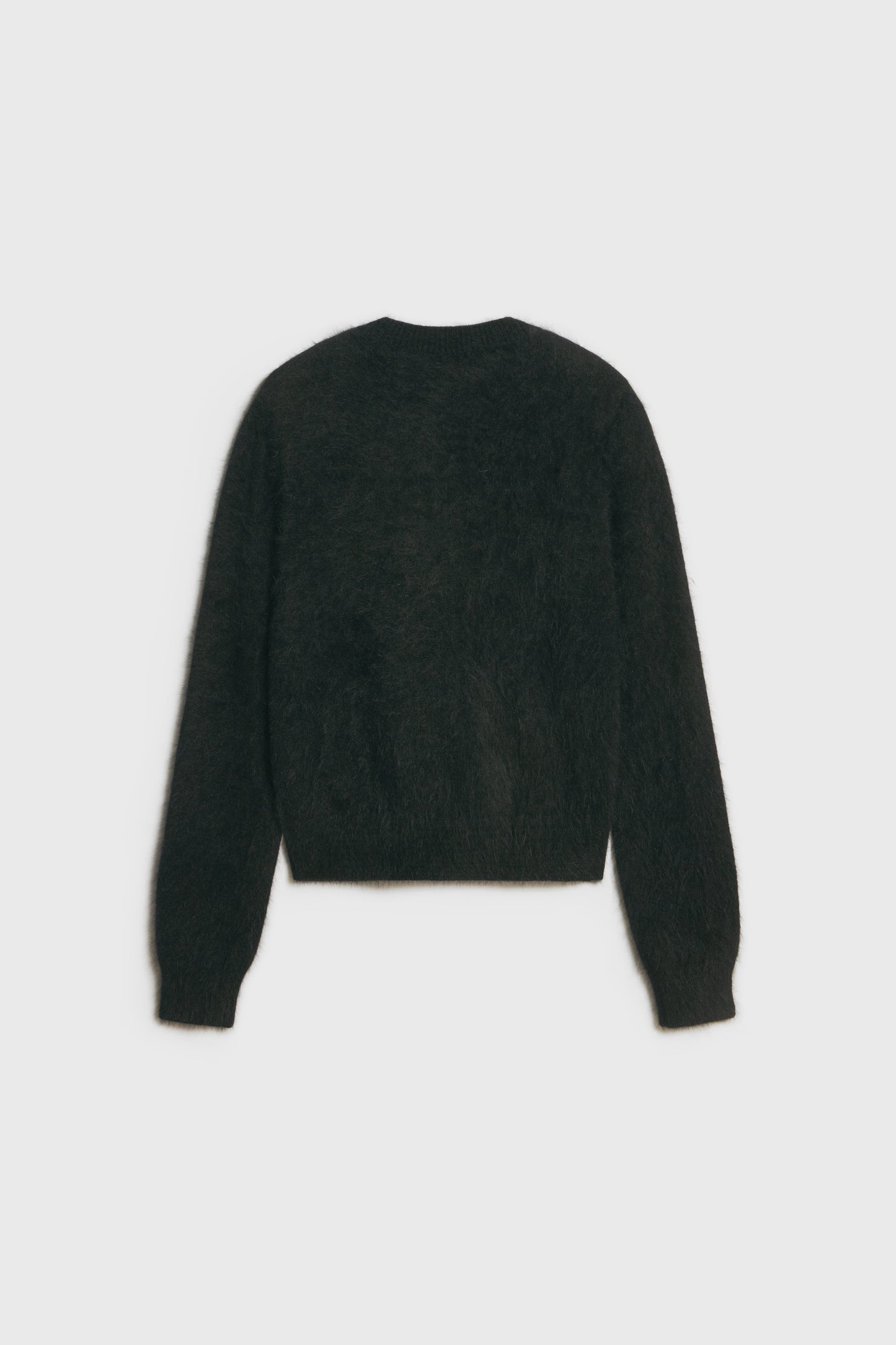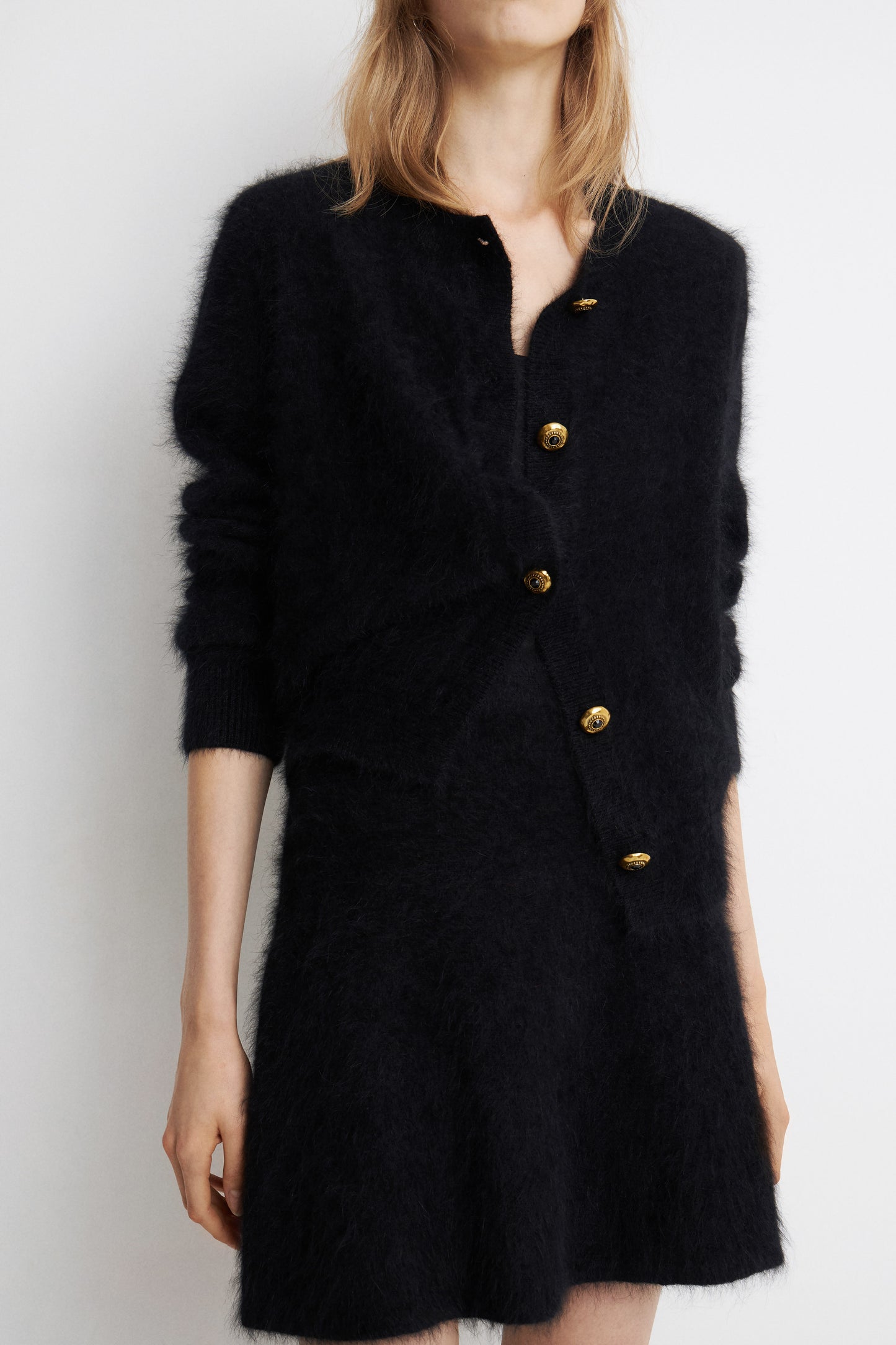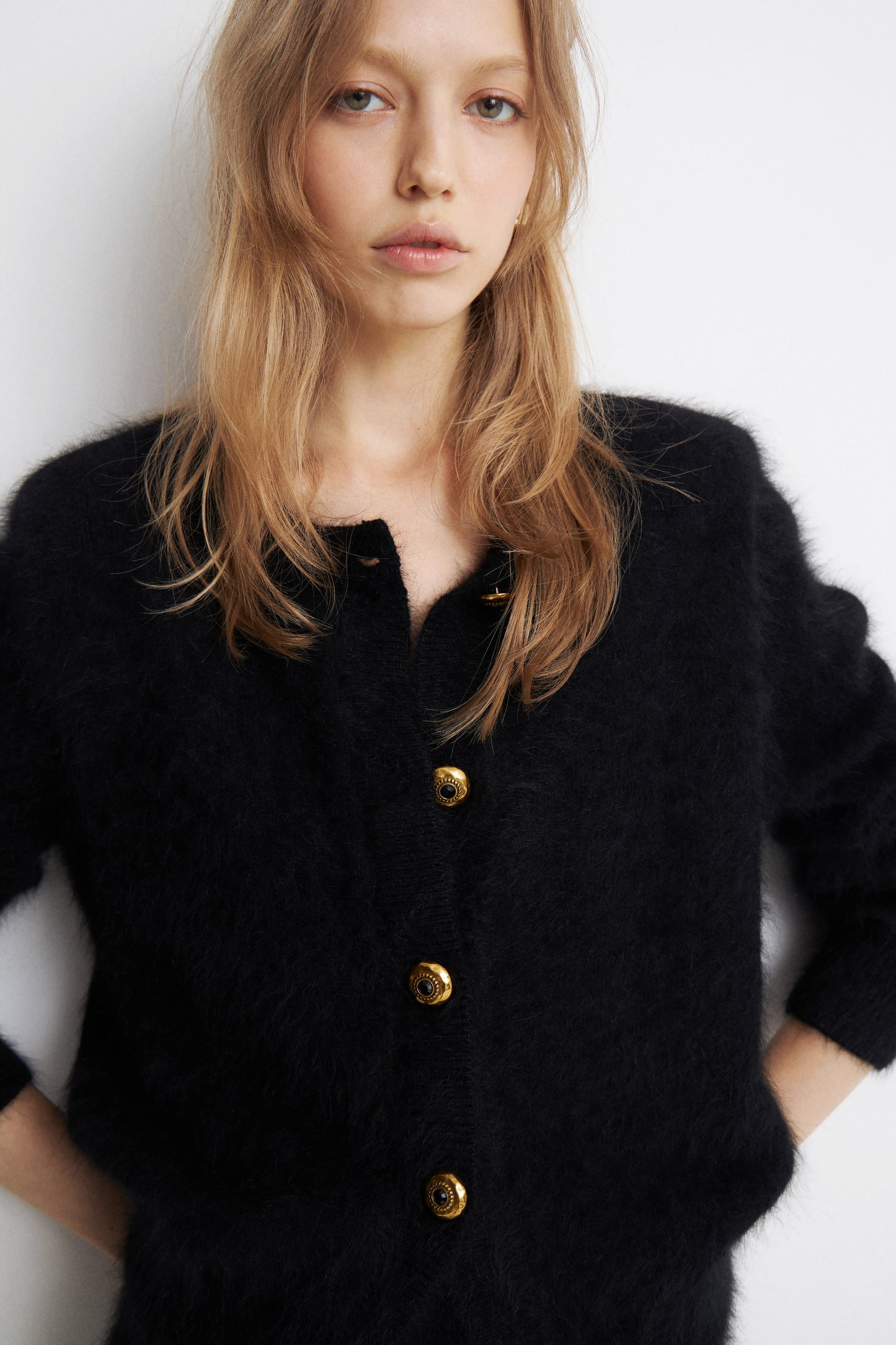 Cardigan in a soft knit with angora wool content. Long sleeves, buttons at front and ribbing at neckline, cuffs, and hem.