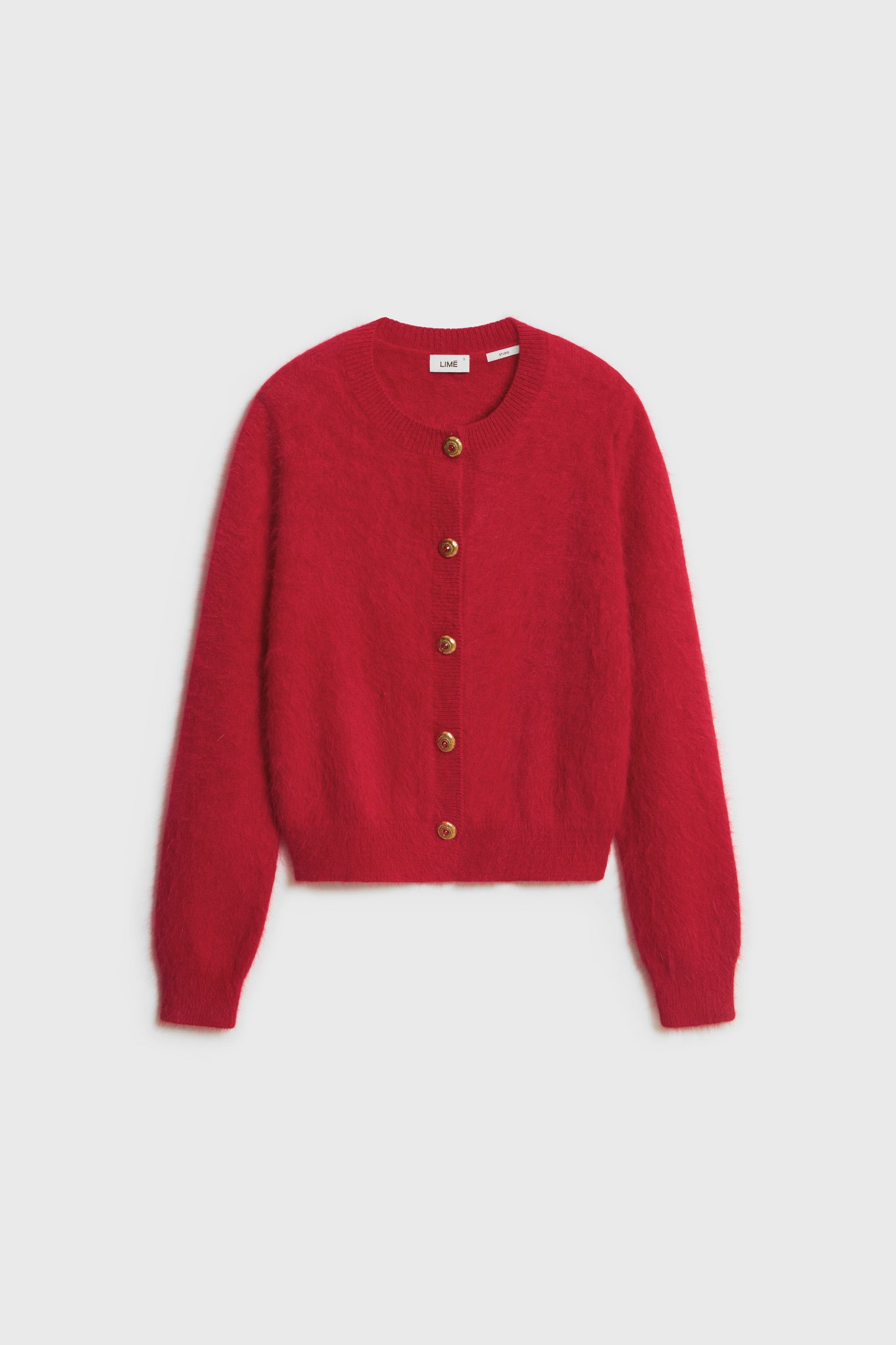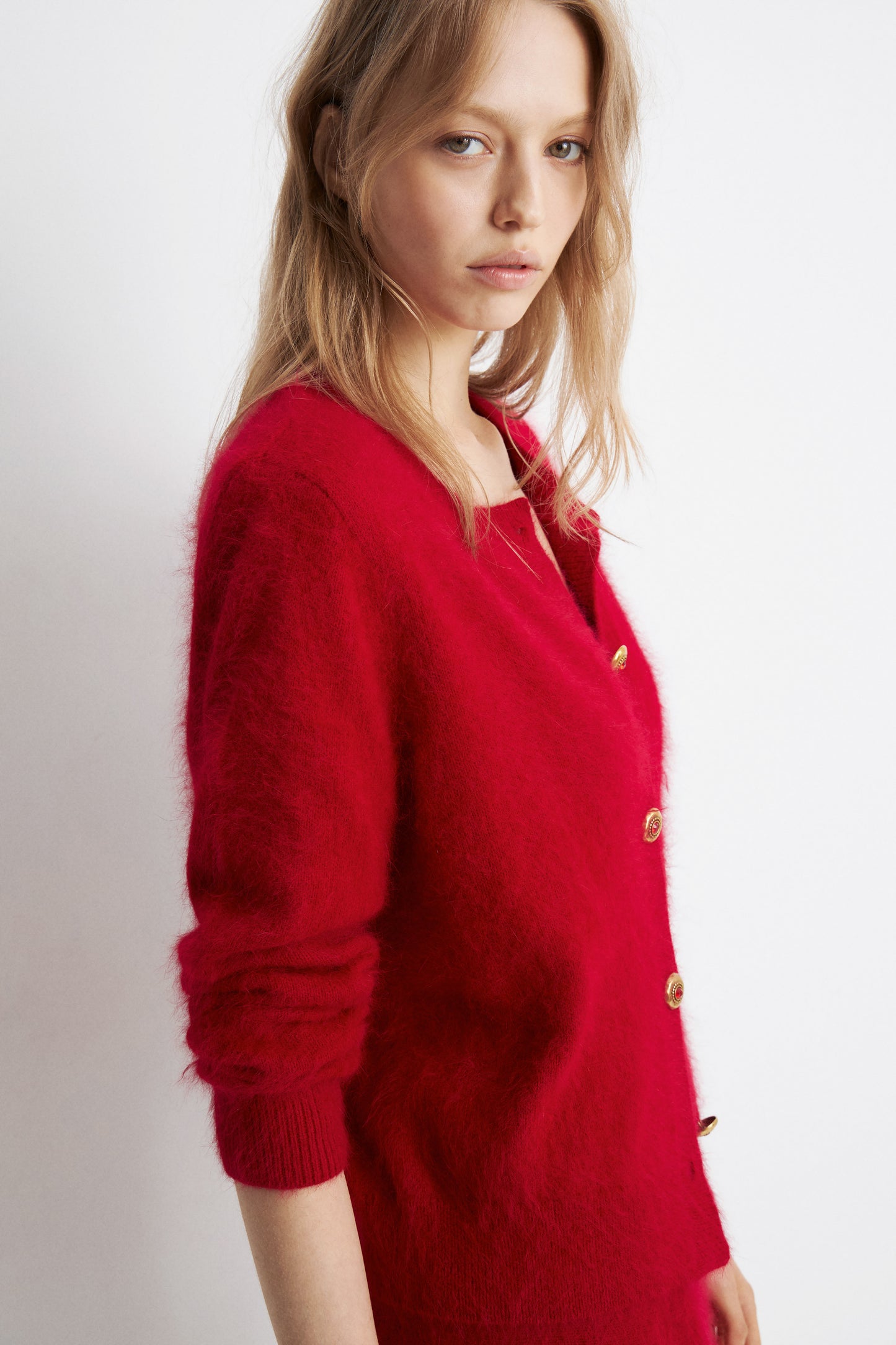 Cardigan in a soft knit with angora wool content. Long sleeves, buttons at front and ribbing at neckline, cuffs, and hem.