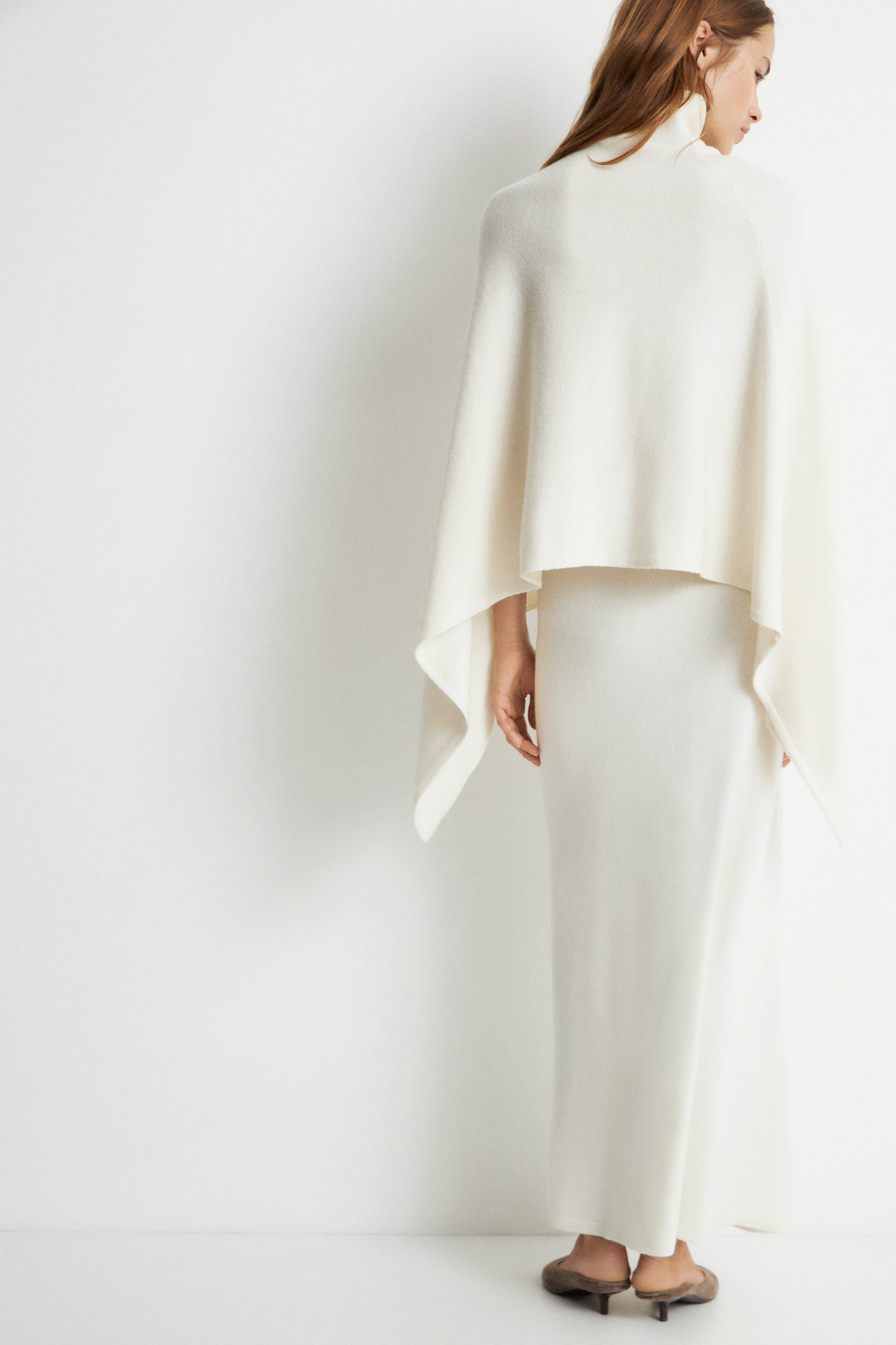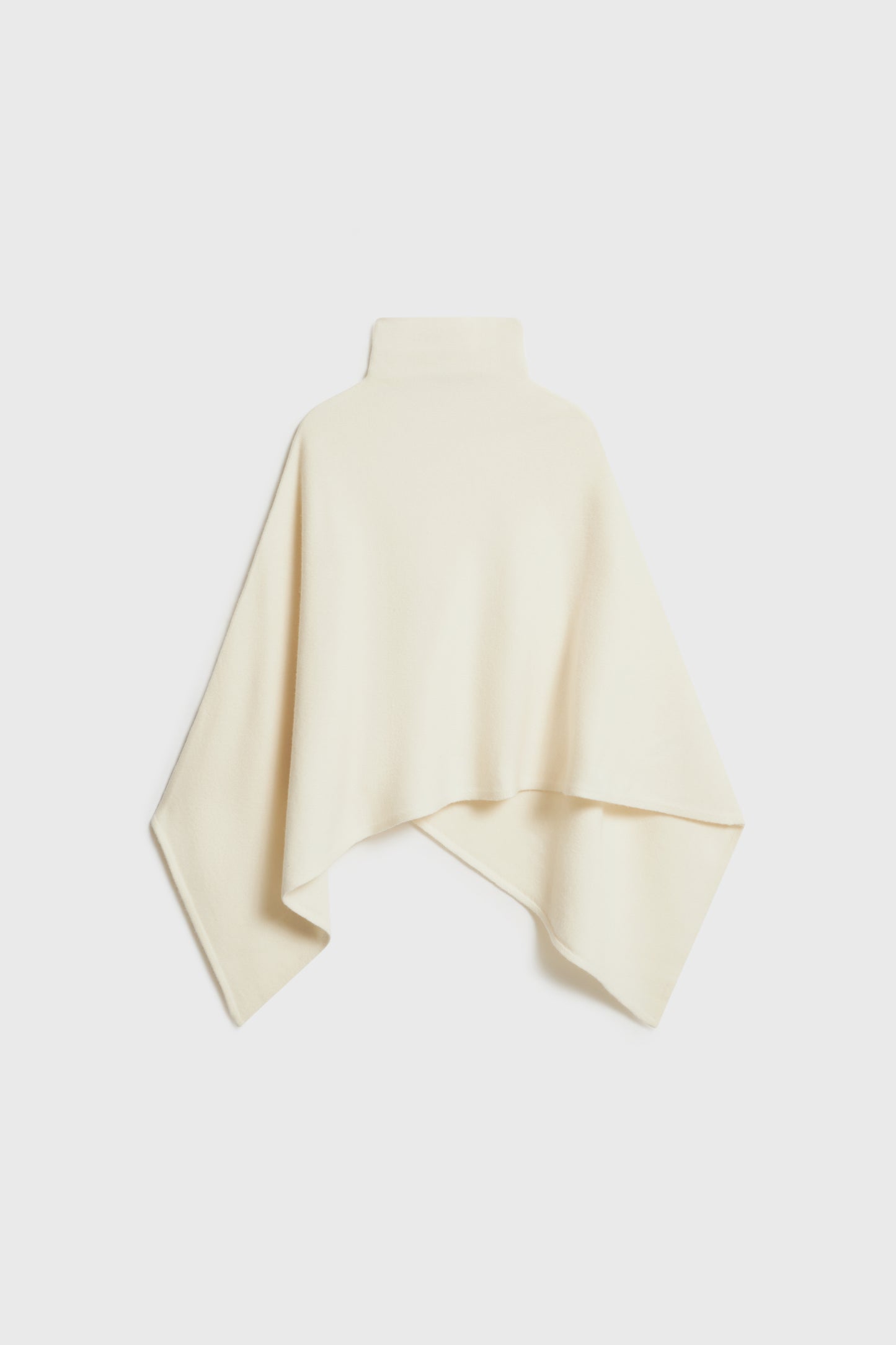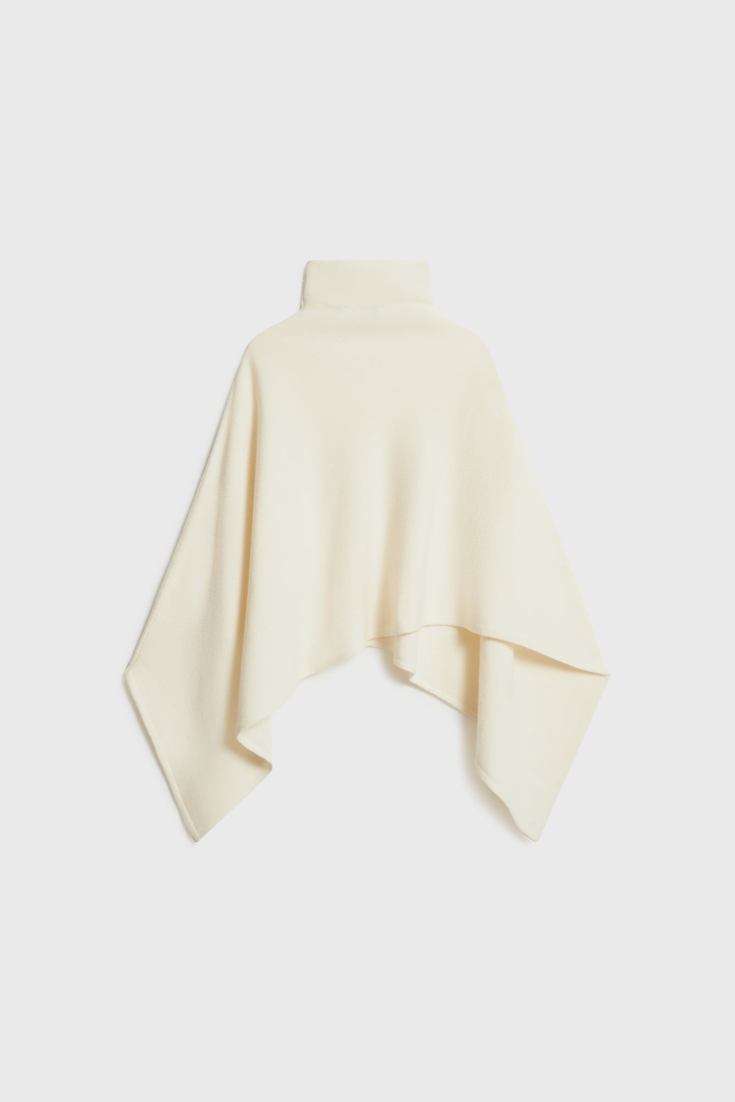 This cape is knitted from a soft wool. It features an enveloping shape with a high collar and pointed asymmetric hems.