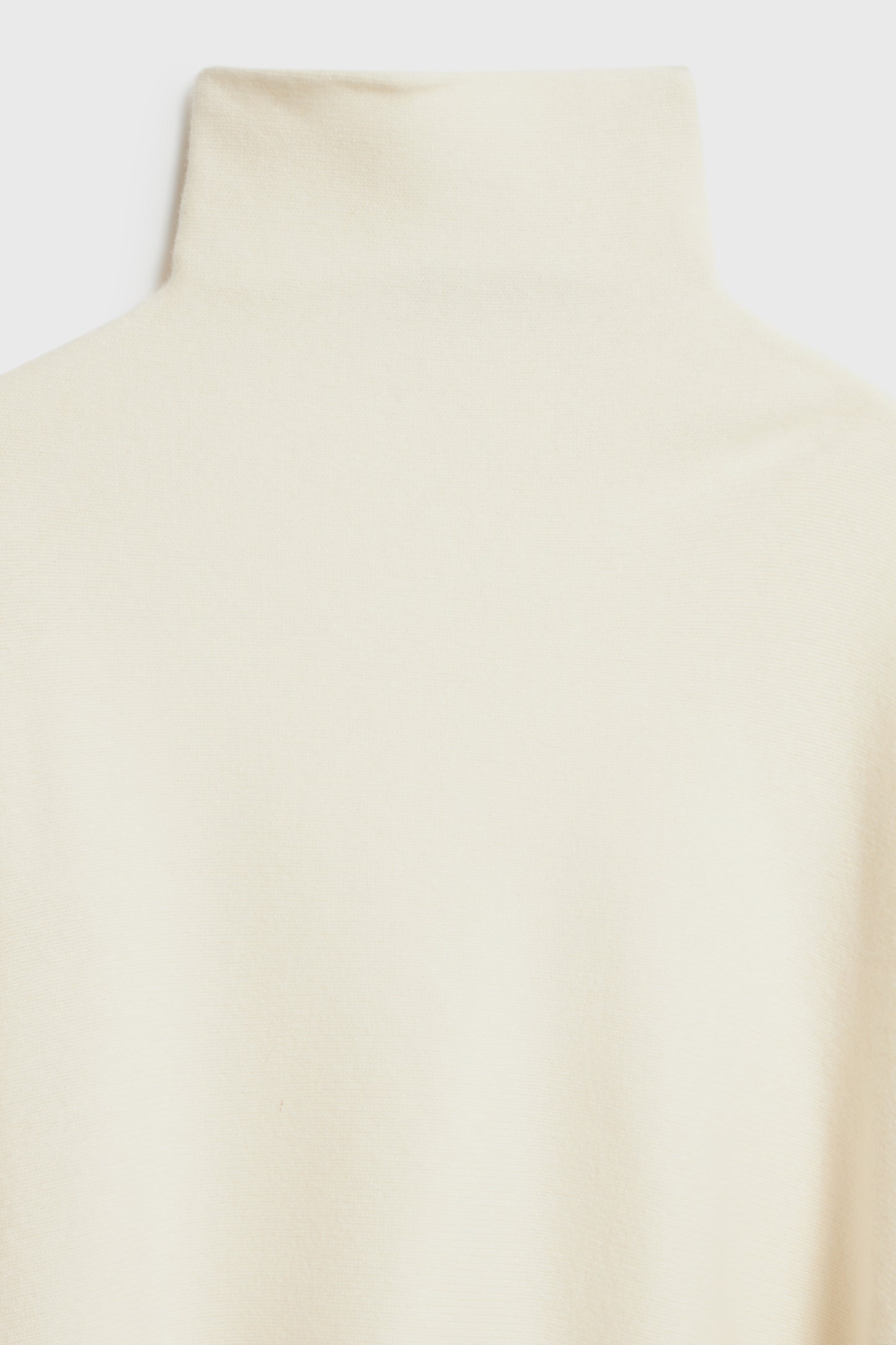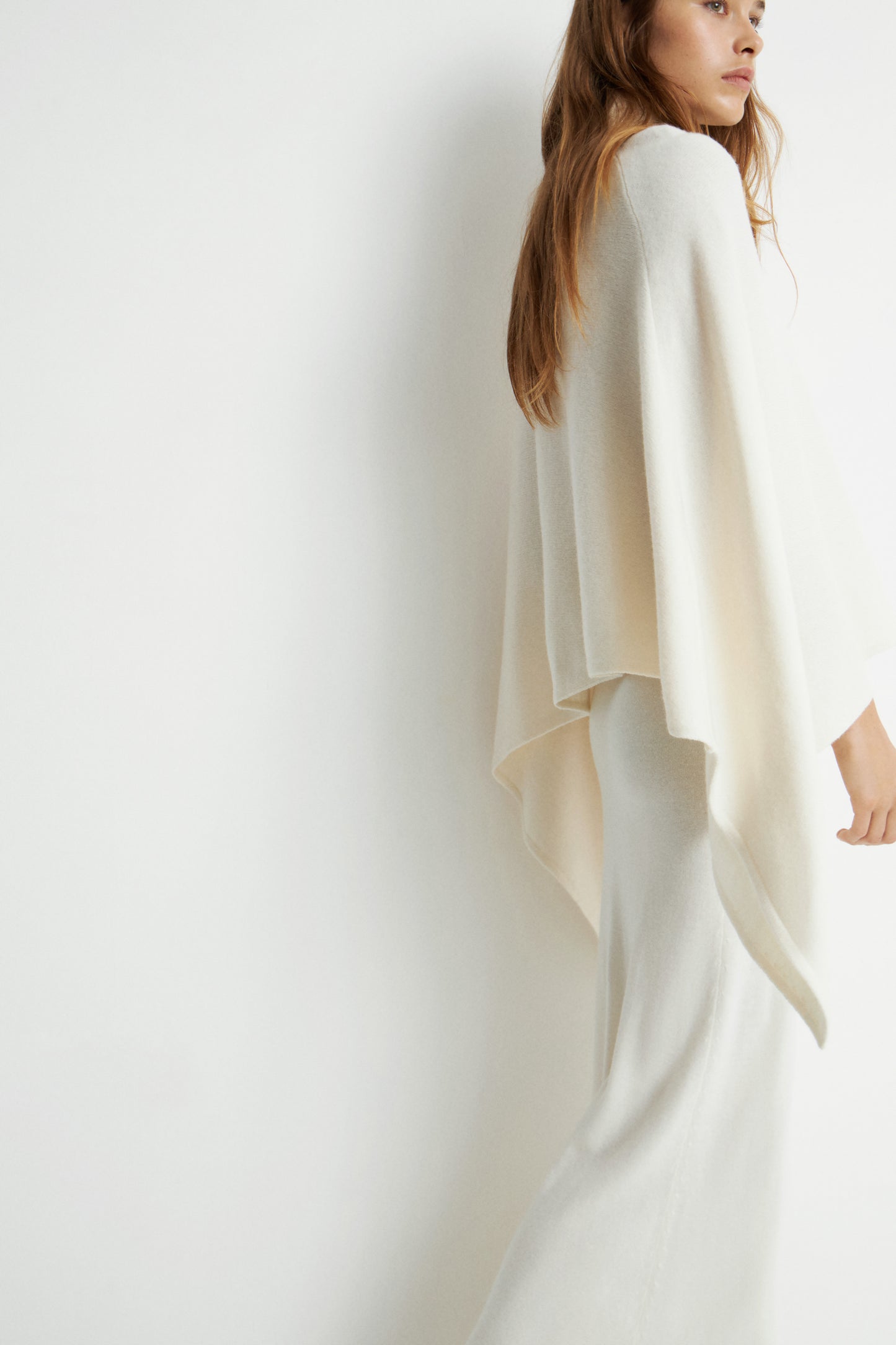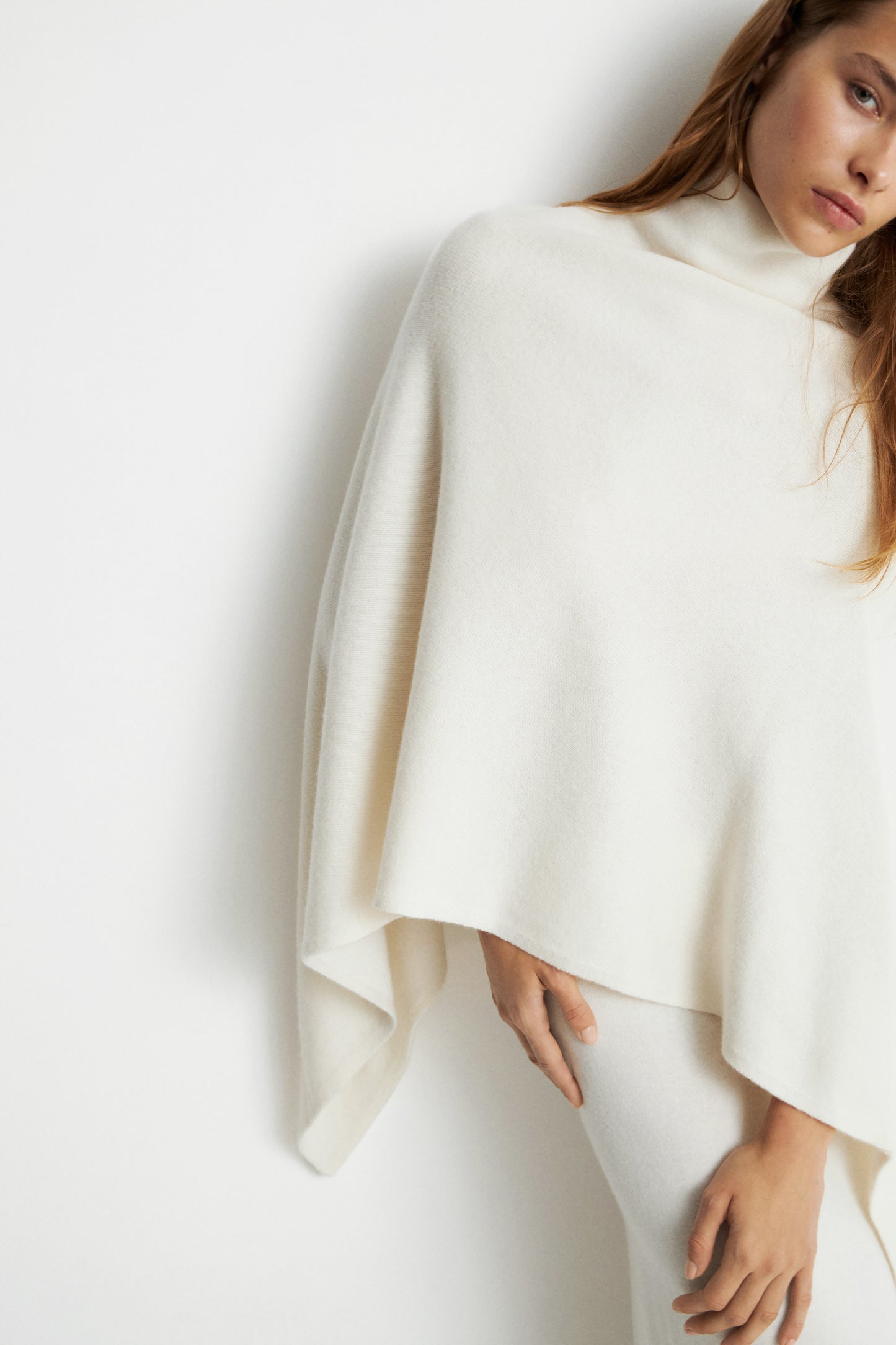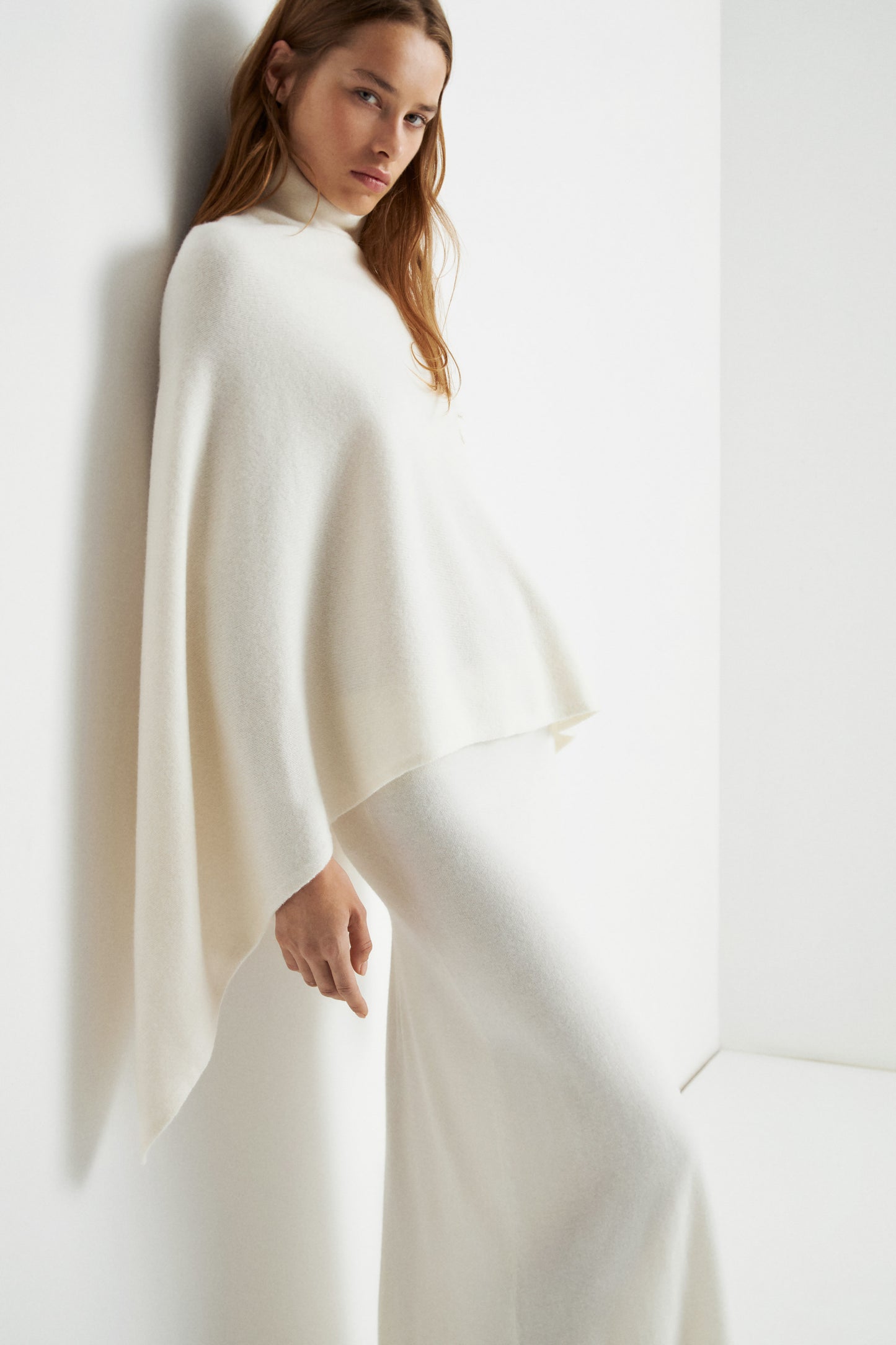 This cape is knitted from a soft wool. It features an enveloping shape with a high collar and pointed asymmetric hems.