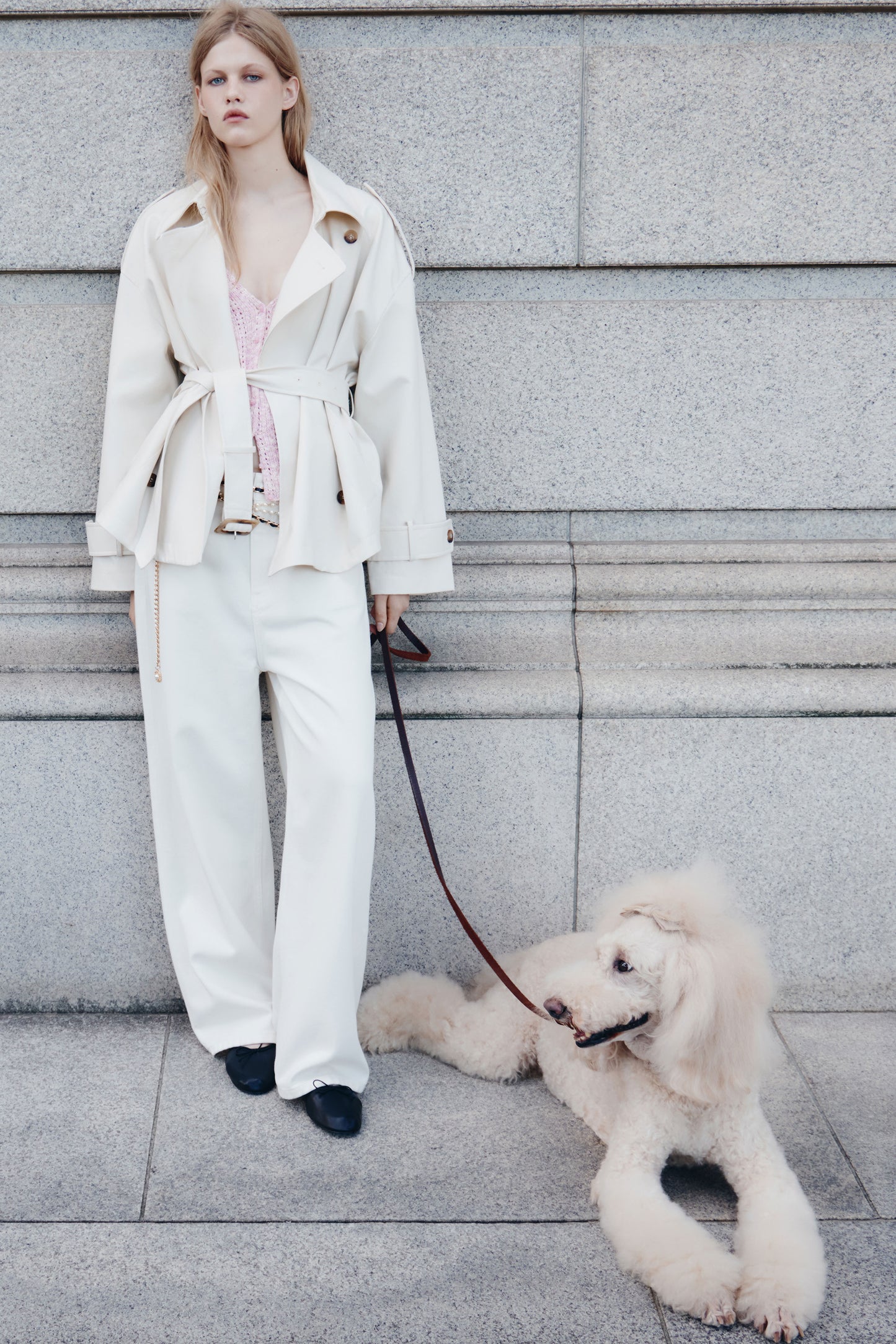 Short, double-breasted trench coat jacket in cotton twill with a collar and buttons at the front. Raglan sleeves, buttoned shoulder tabs and cuffs. Two welt front pockets. Secured with a tonal buckle belt. Lined. Oversize fit.