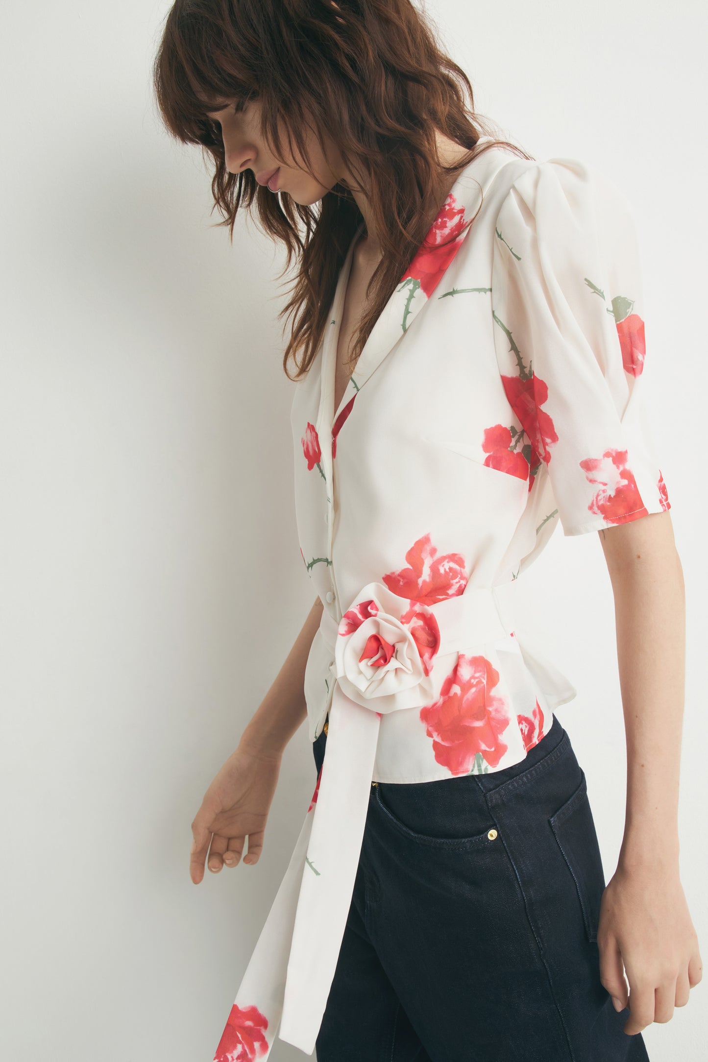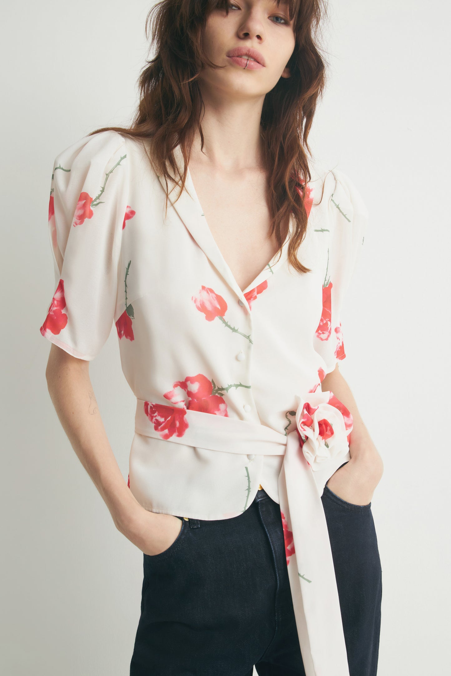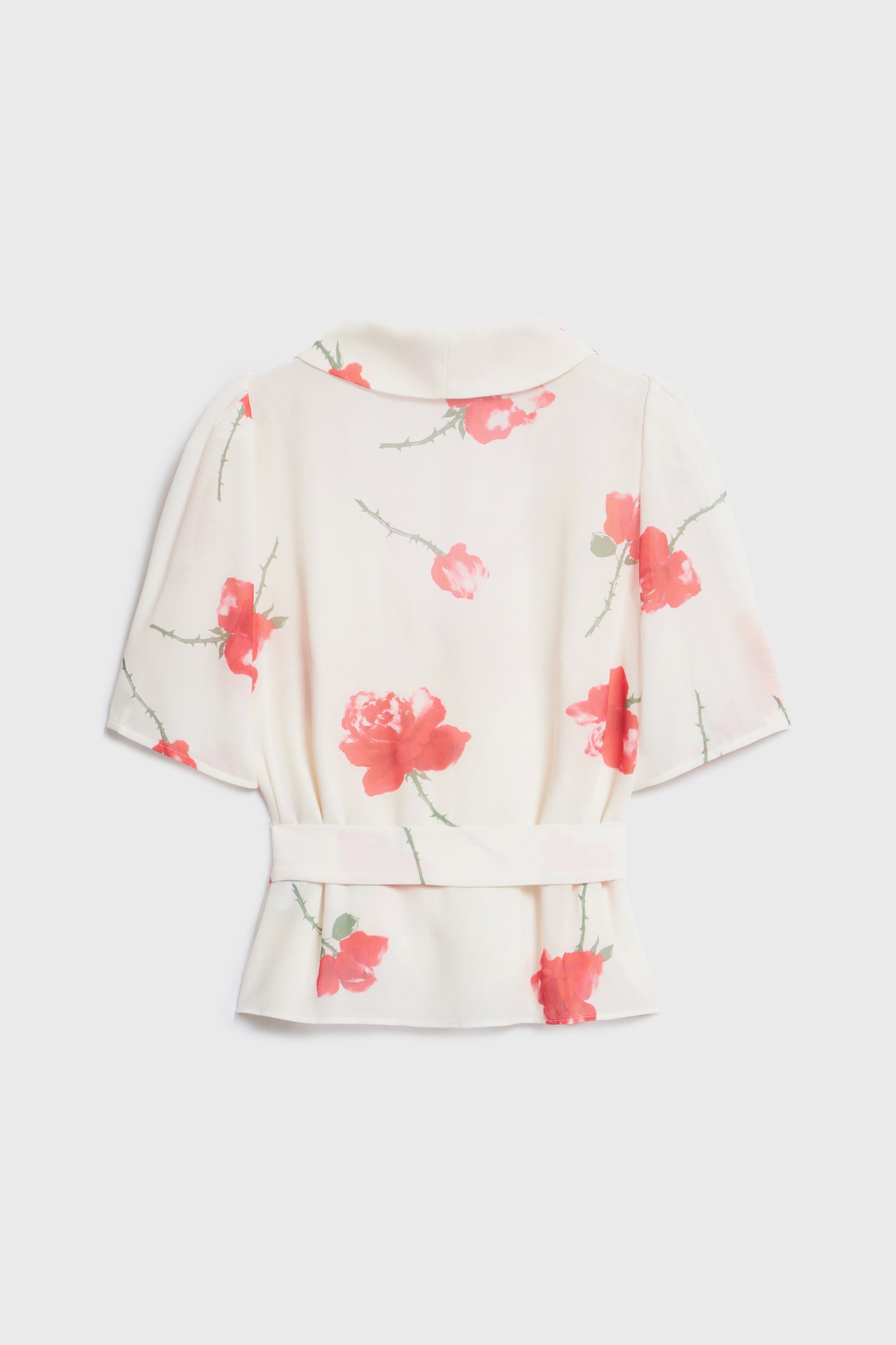 Fitted blouse with a printed design. V-neckline, removable belt with delicate flower appliqué, and short sleeves with shoulder pads. Front closure with buttons.