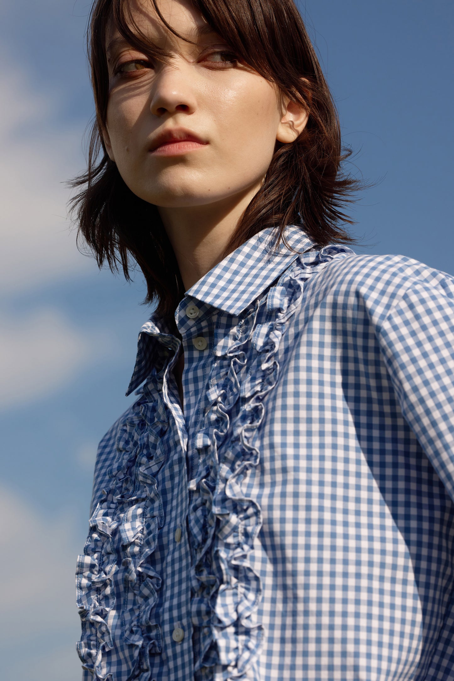 Collared oversize shirt in cotton. Ruffled bib at front. Cuffed long sleeves. Rounded hem. Button-up front.