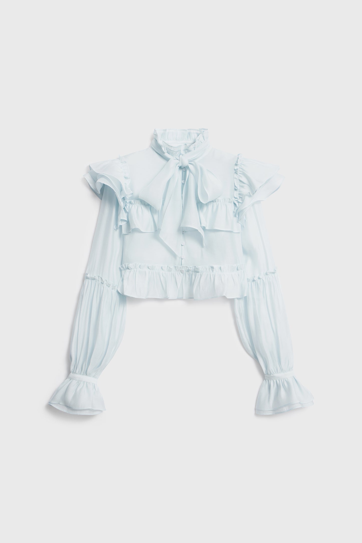 Cropped, fitted blouse in a silky lyocell blend. Vintage-inspired design with long, flowing ribbons that tie into a voluminous bow on the ascot-style collar. Detailed with gathers, long sleeves with elastic inserts for added volume and front covered buttons fastening.