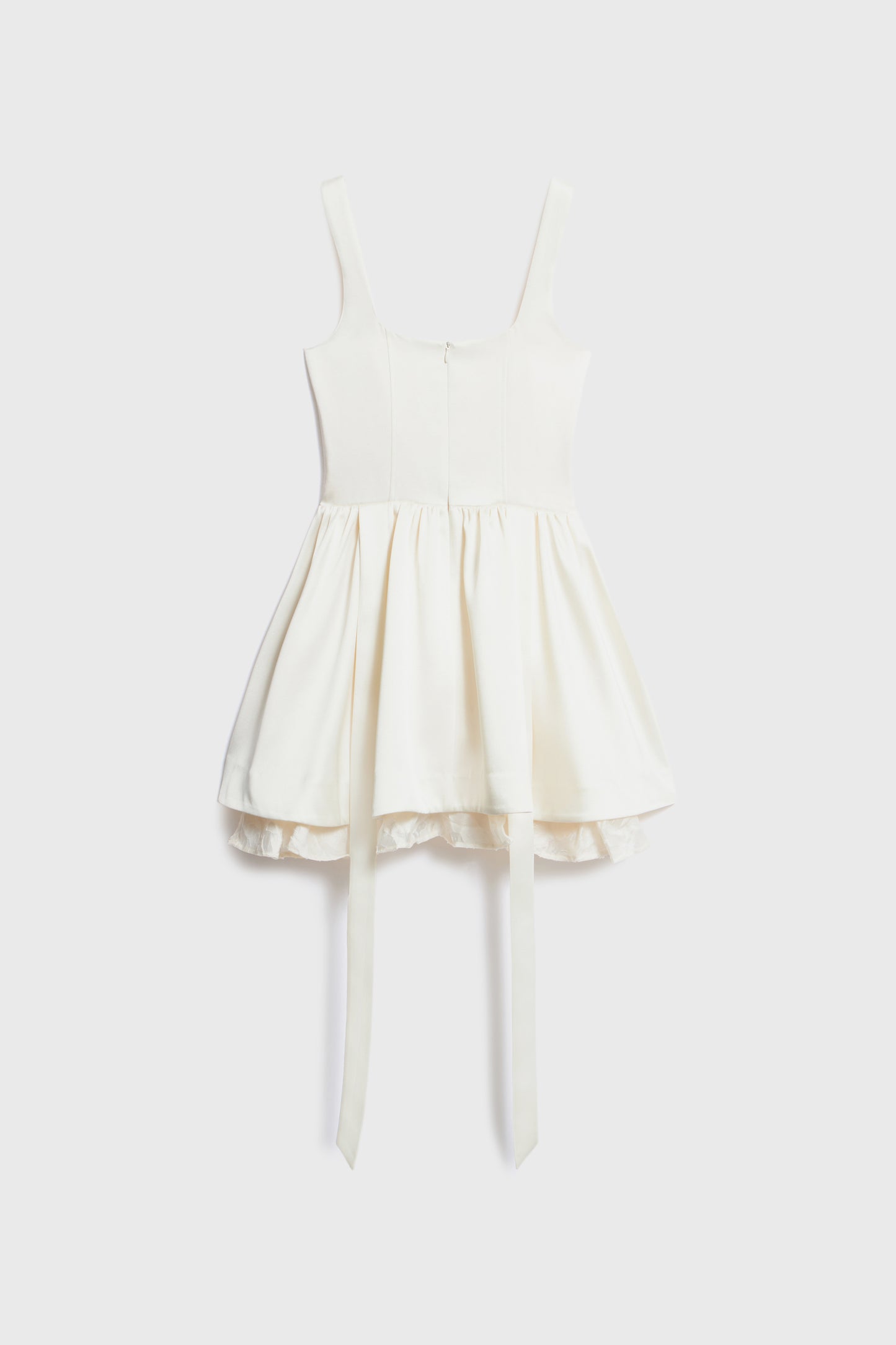 Short bustier dress in woven fabric with a sweetheart neckline and gathered seam at the centre of the bodice. A bubble hem, that creates a puffy silhouette, with decorative long ties. Lined.