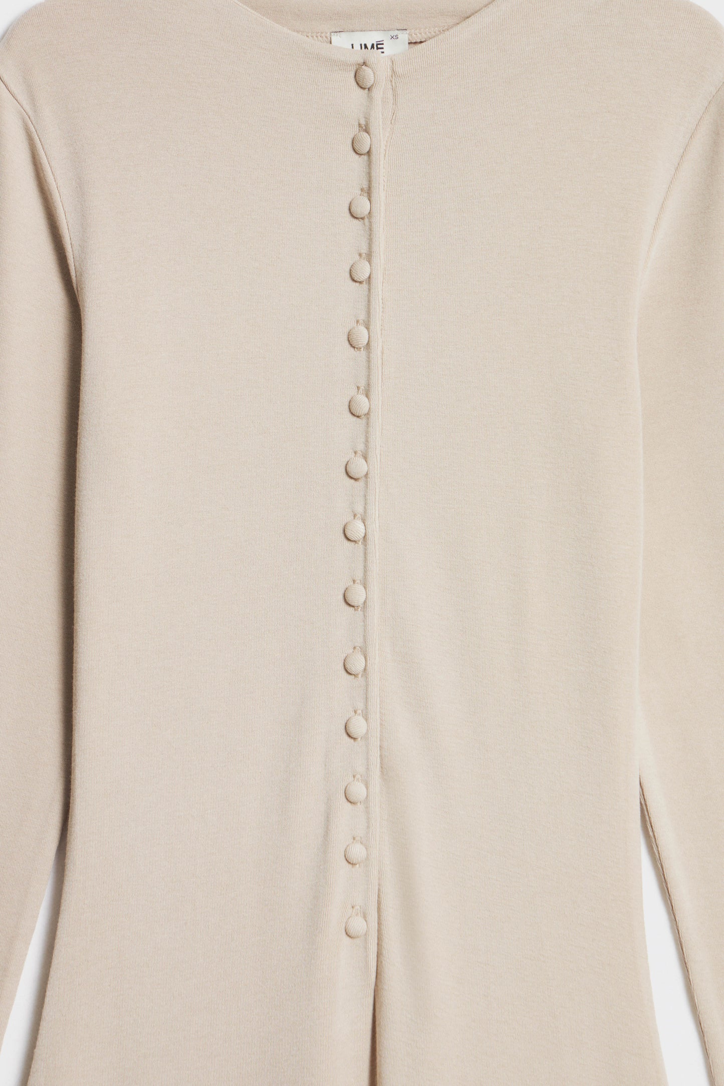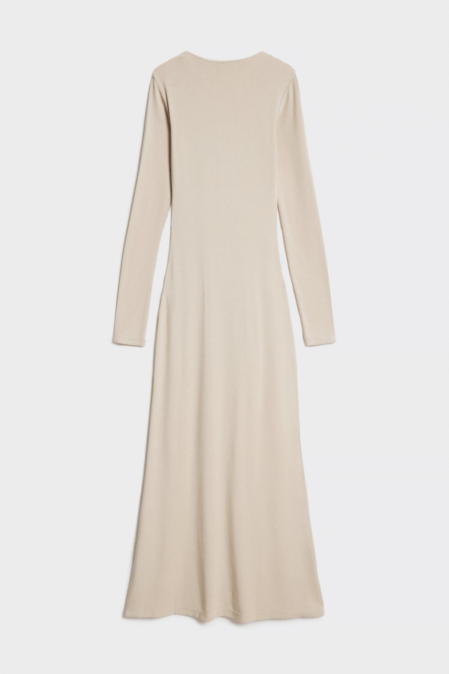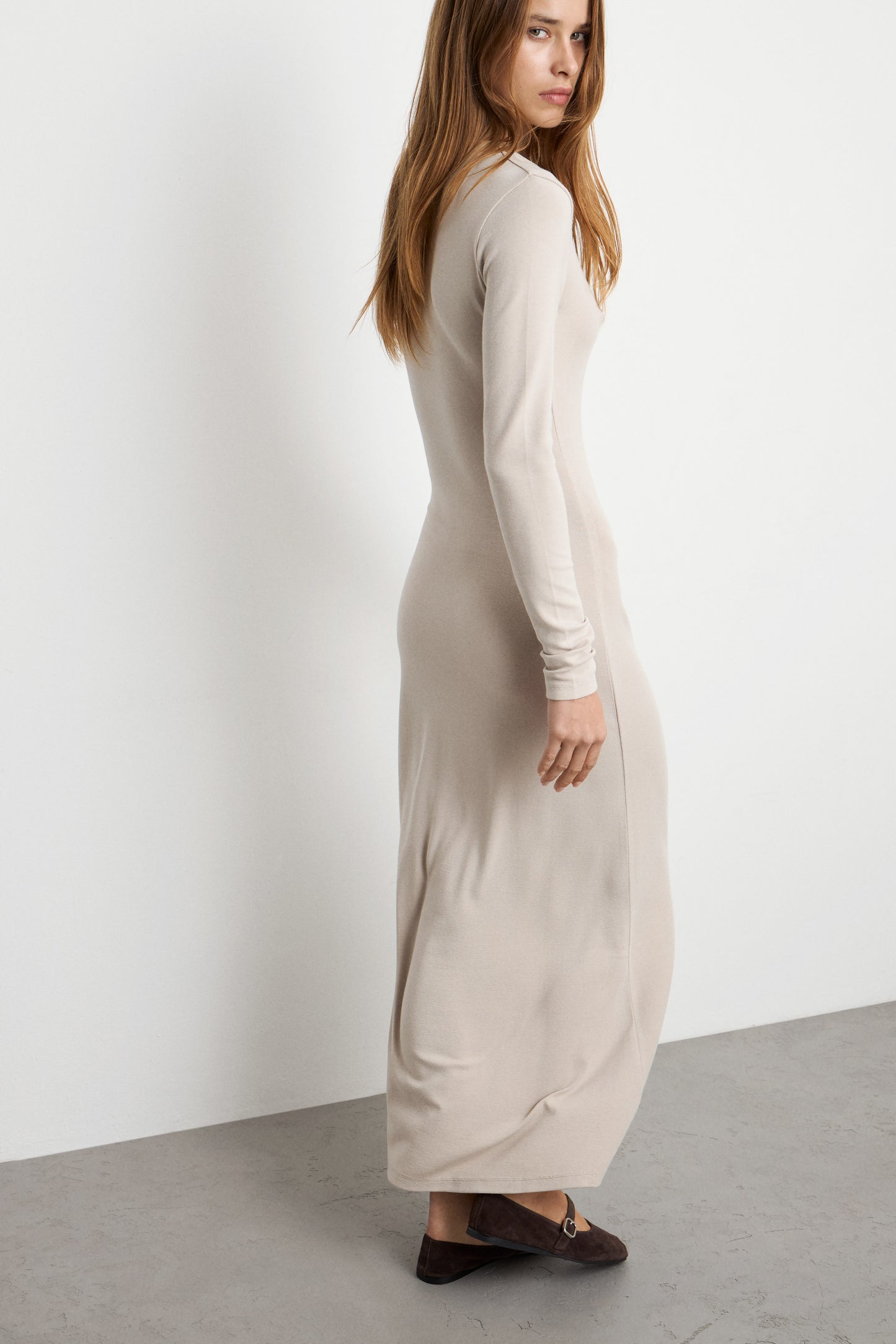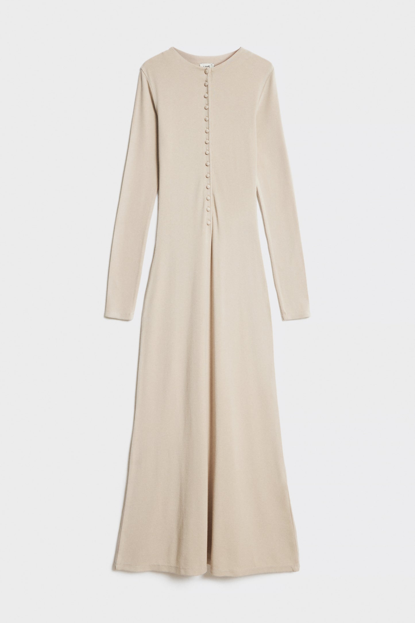 Fitted dress in ribbed jersey made from a viscose and cotton blend. Round neck, front covered button placket, and long sleeves.