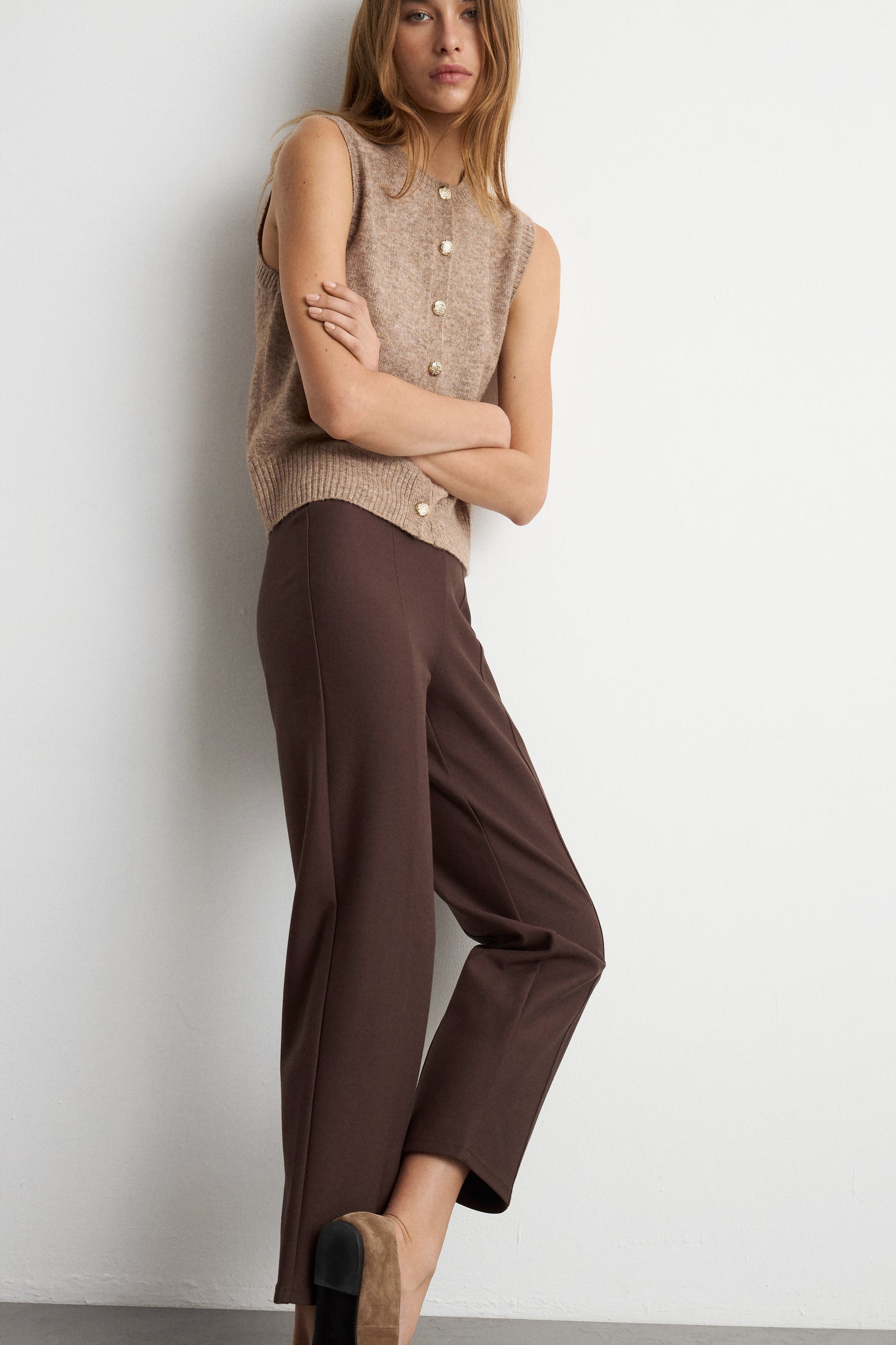Fitted vest in a soft knit blend contains cable wool. Round neckline, textured buttons at front in shimmery metal, and ribbing at edges.