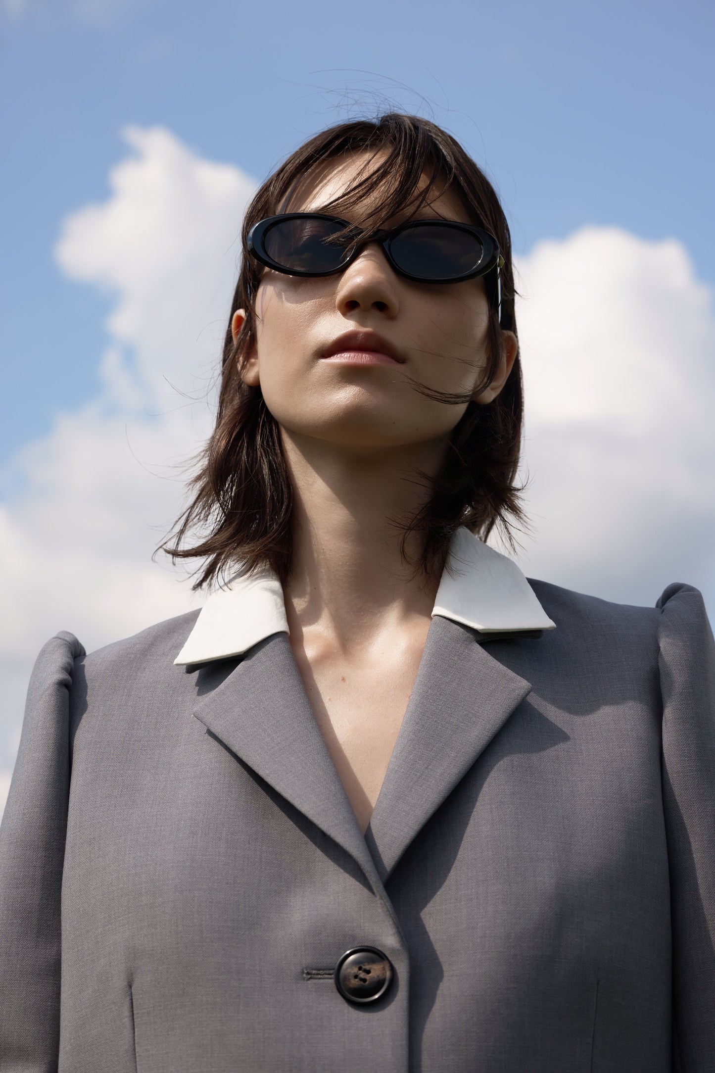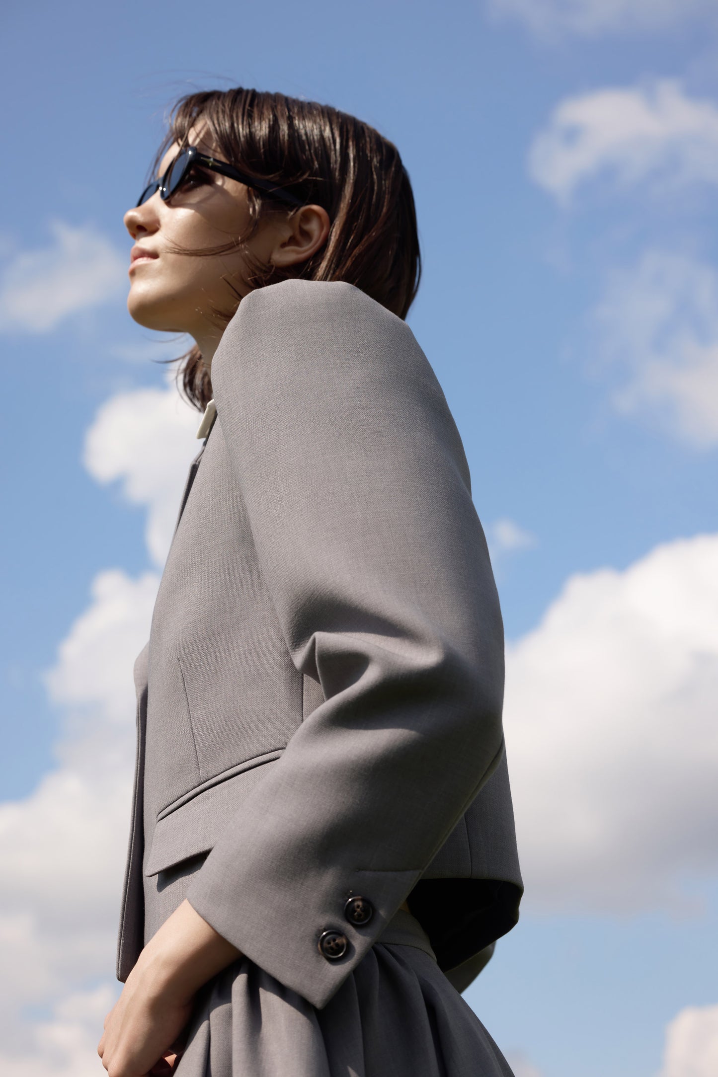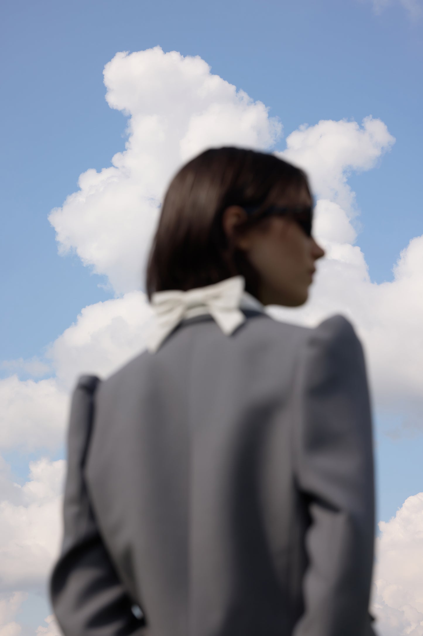 Single-breasted, straight, slightly cropped blazer with long sleeves and two large button at front. Decorative flap pockets and detachable collar with attractive bow. Lined.