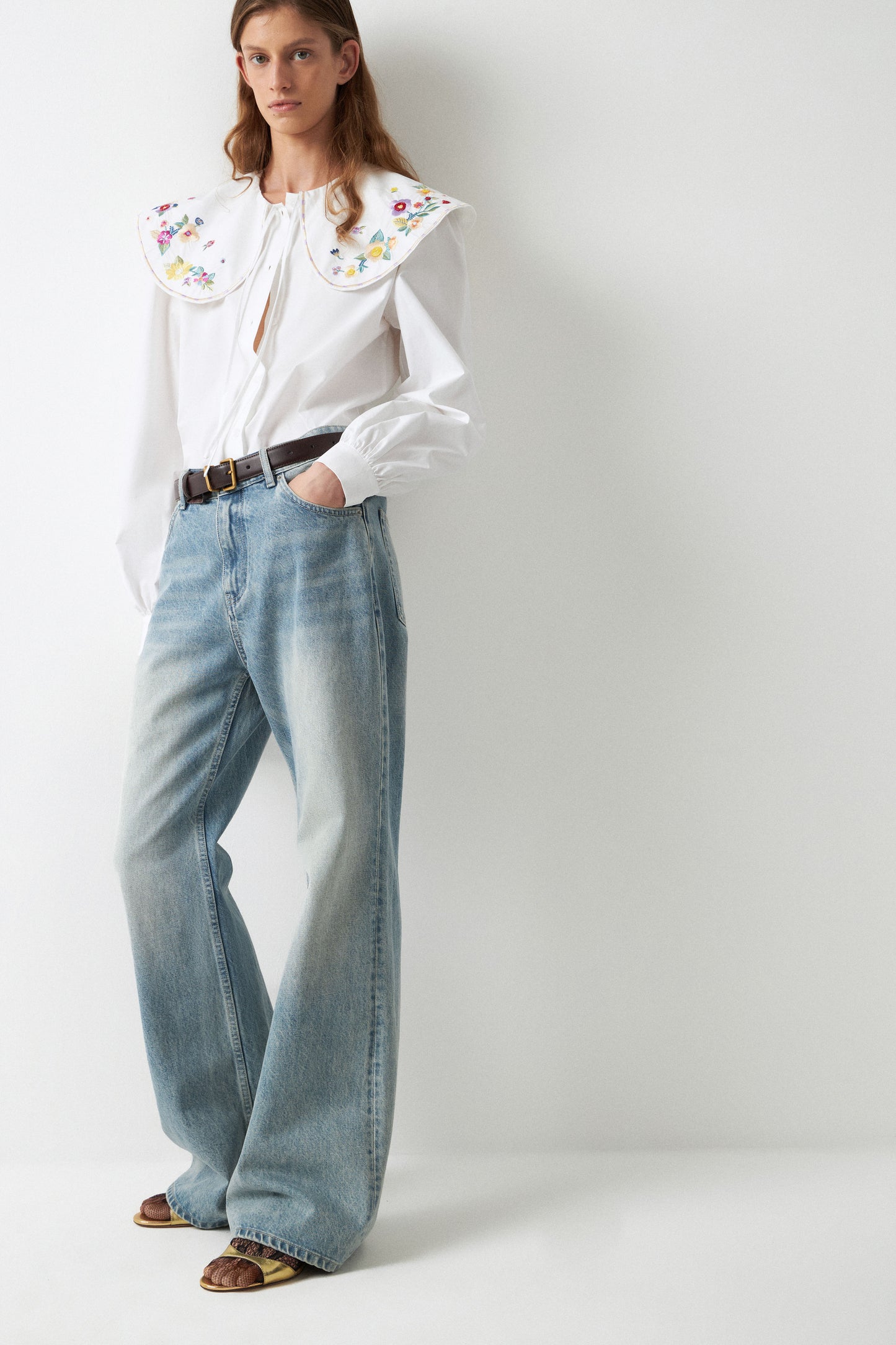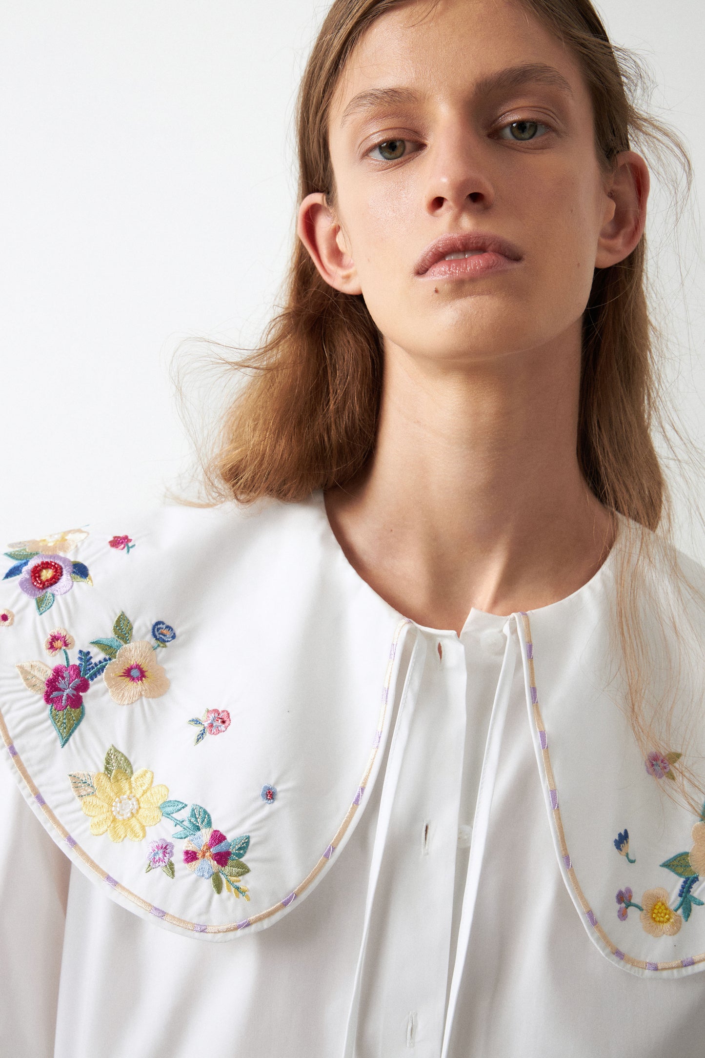 Blouse in crisp cotton with floral embroidery. Peter Pan collar, buttons on the front, and long sleeves with cuffs at wrists.