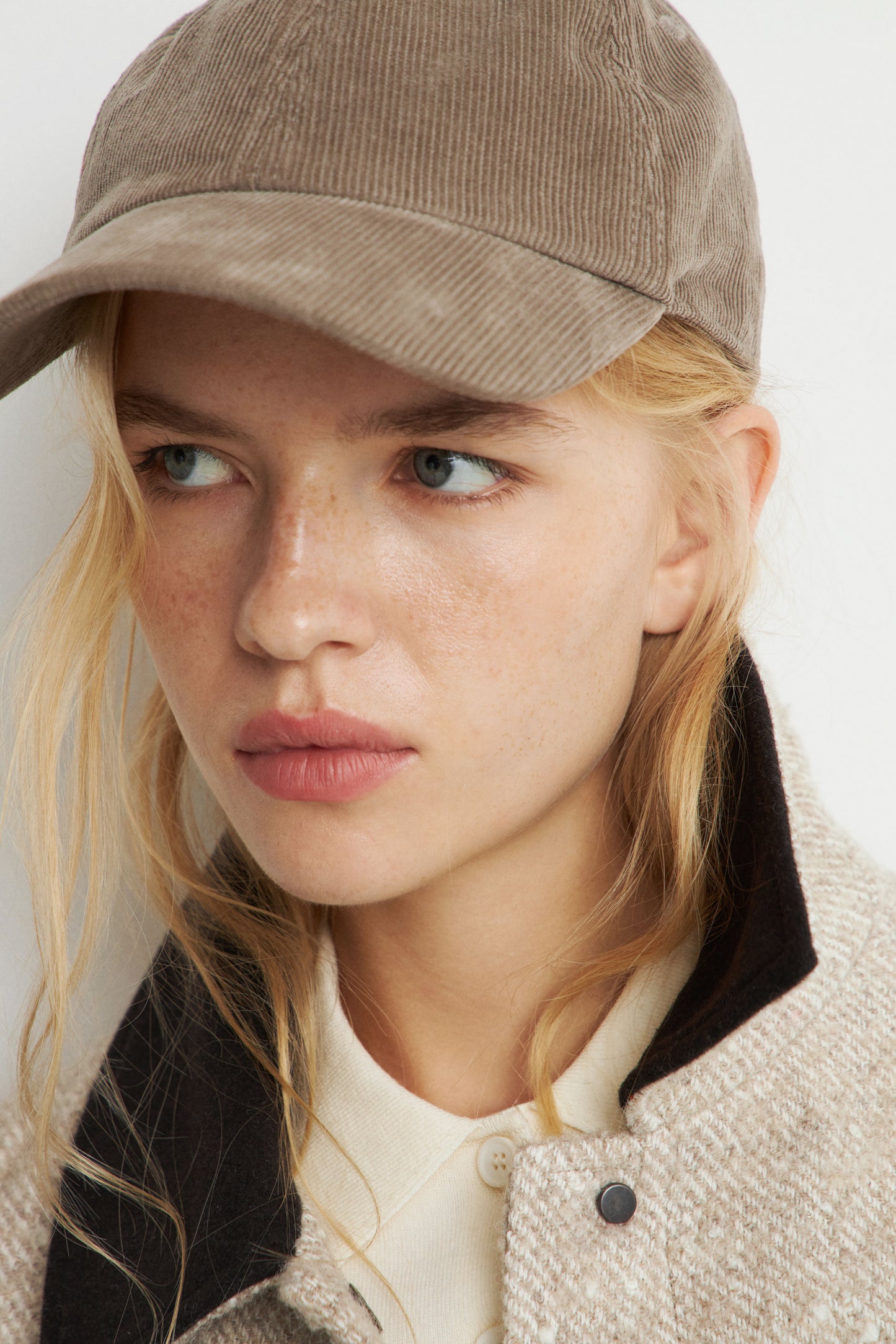 Baseball cap in soft corduroy made from high-quality cotton. Embroidered eyelets on the top. Adjustable tab at the back with metal fastener.