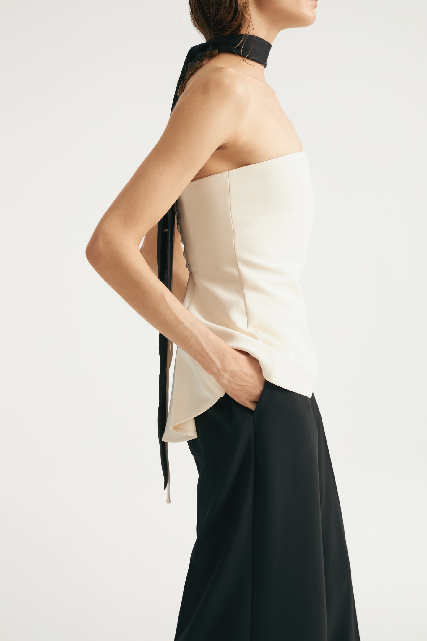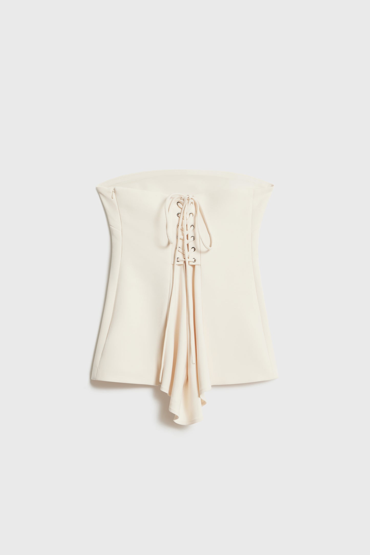 Short, corset-style bandeau top. Wide section at the back with lace-up fastening. Hidden zip side closure. Lined.