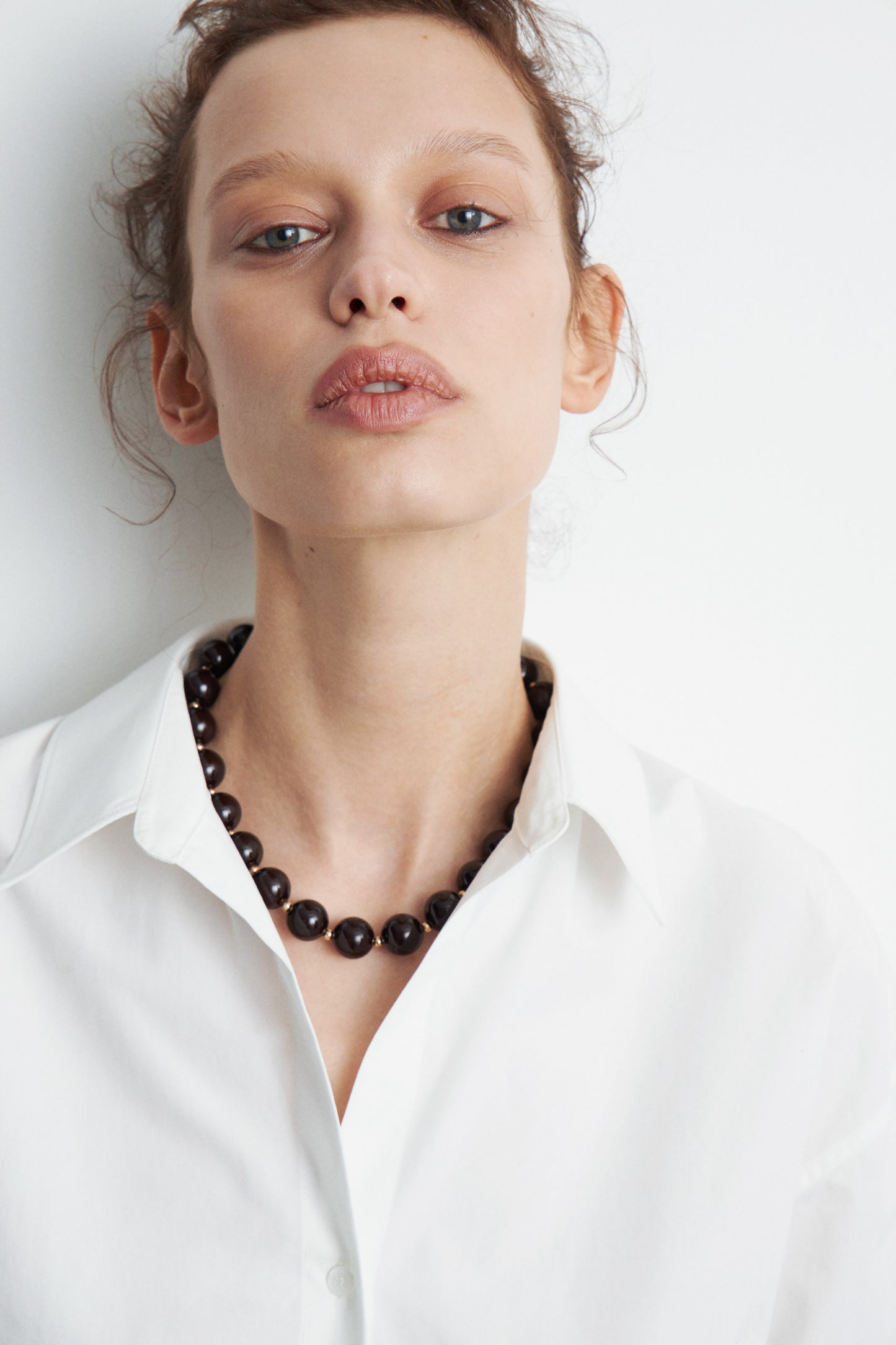 Straight-fit shirt in crisp cotton poplin. Collar, buttons at front, and a V-shaped front opening. Gently dropped shoulders, long sleeves with button at cuffs. Straight-cut hem with curved side vents.