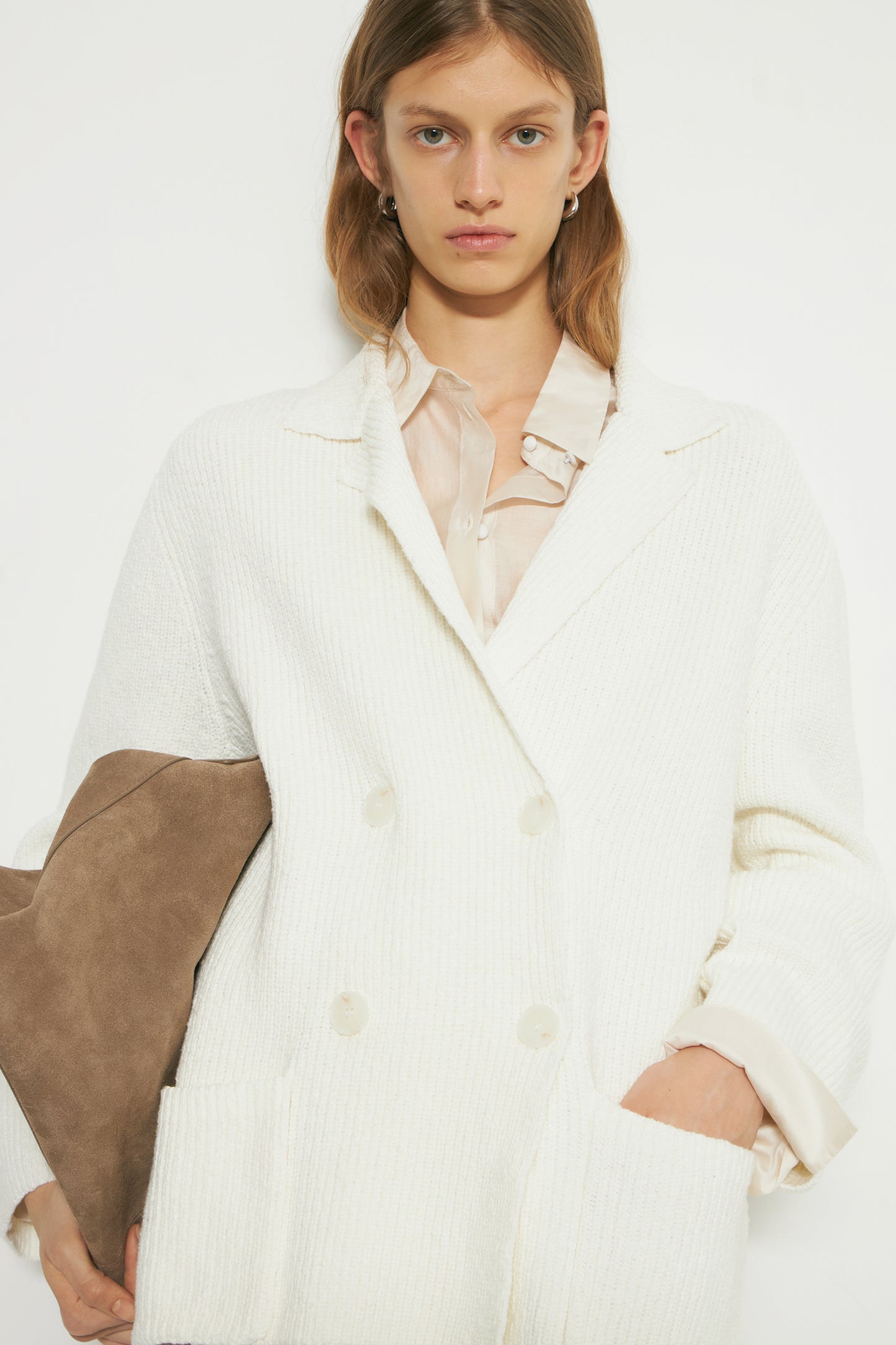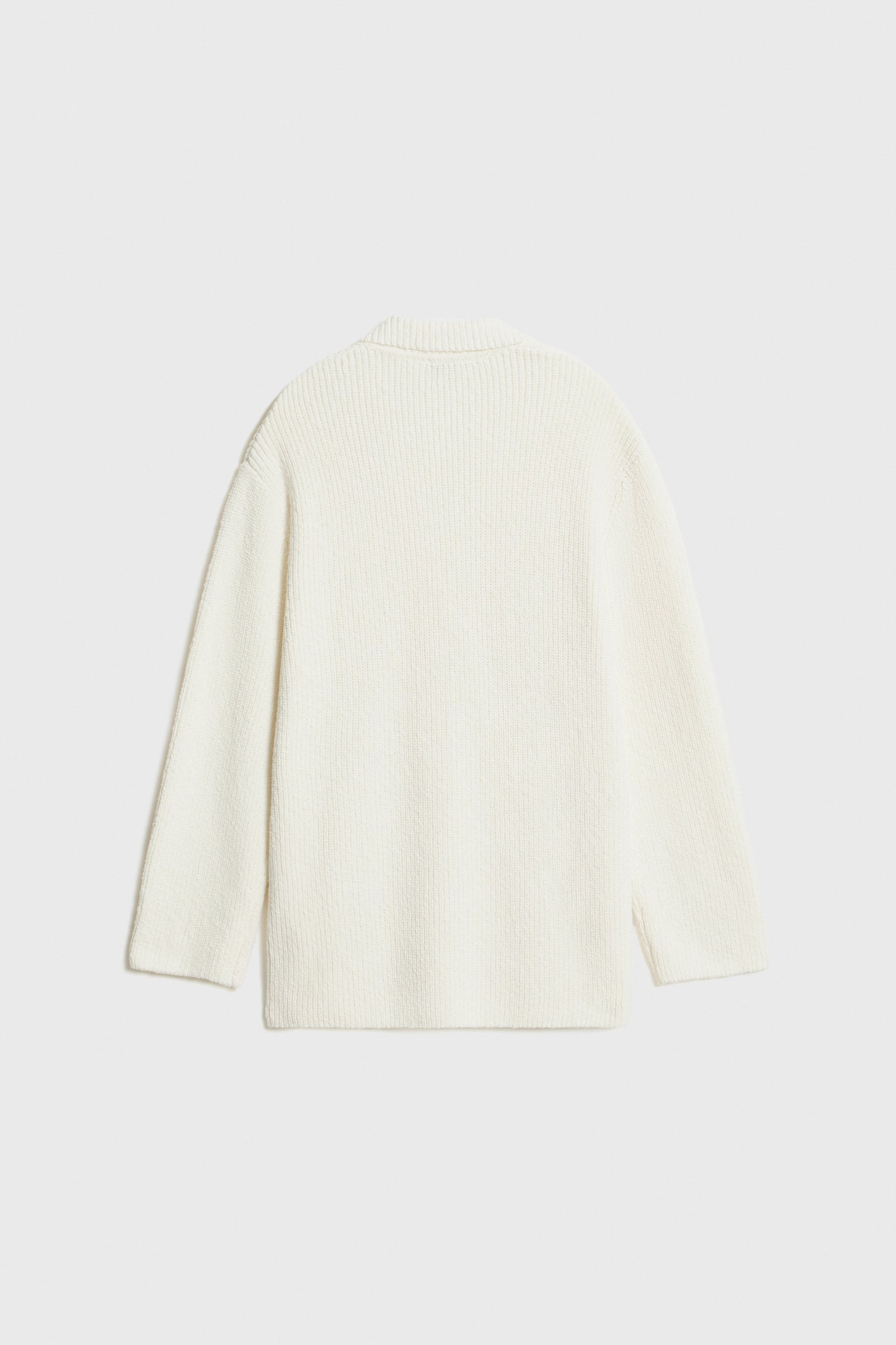 Blazer-style cardigan crafted from a knit cotton. This style has a straight fit with long sleeves, notch lapels, double-breasted front with buttons and two patch pockets at the front.