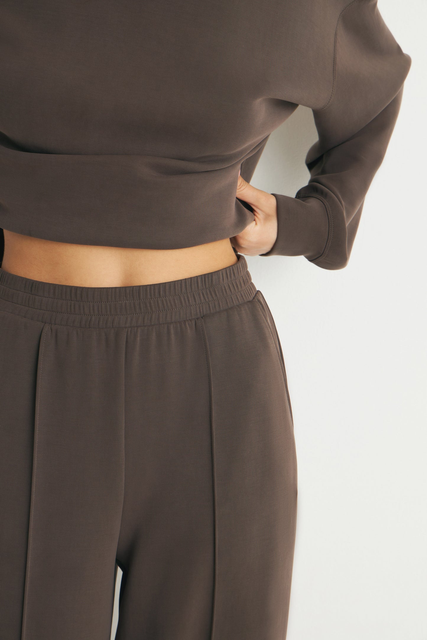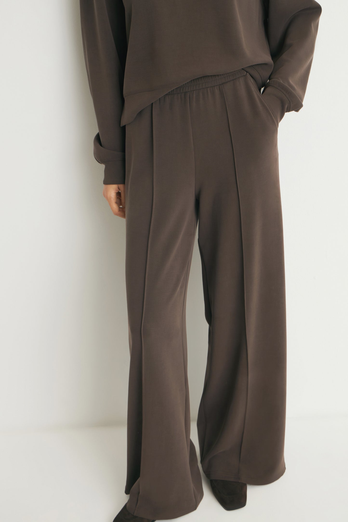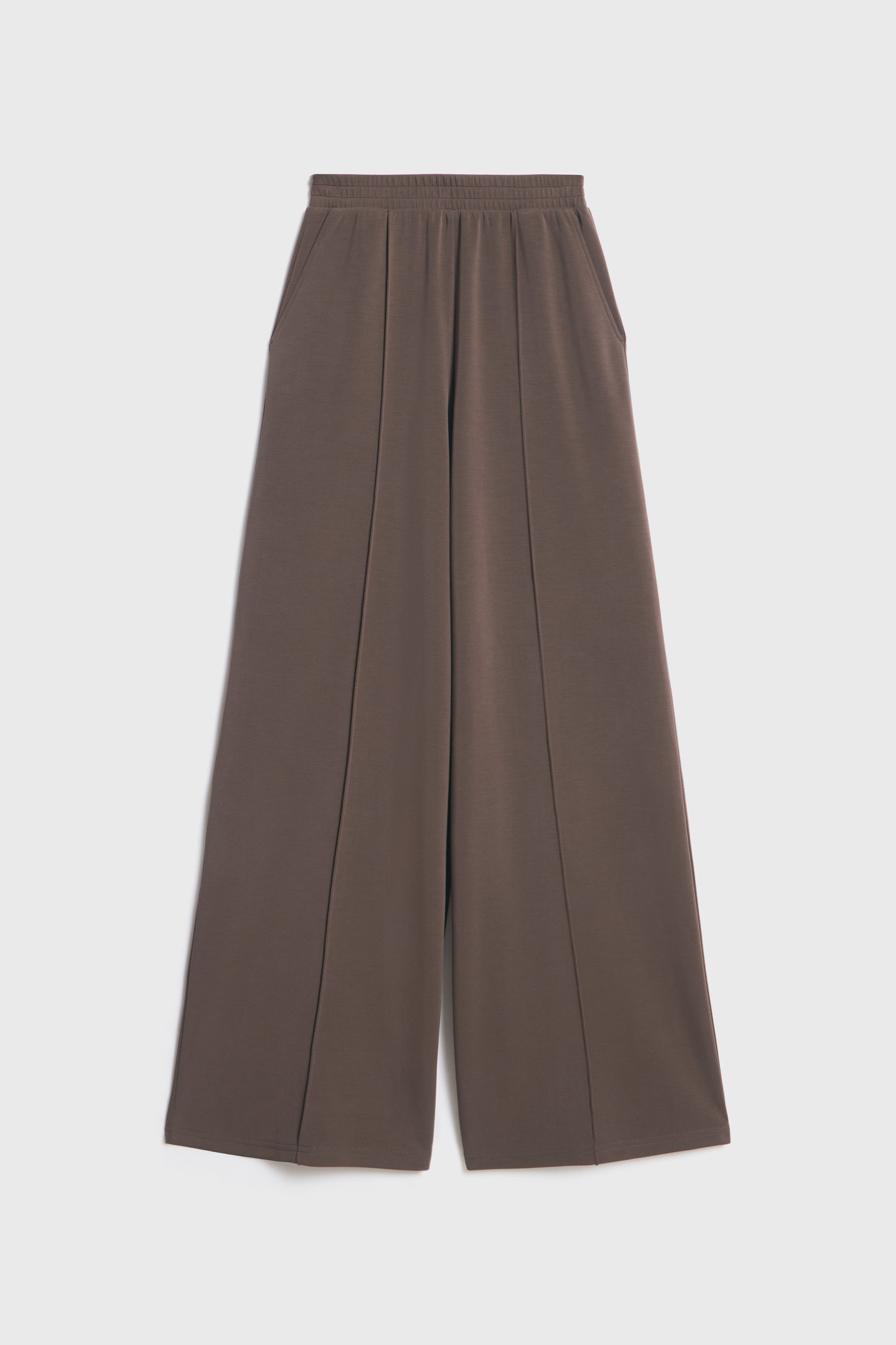 Full-length trousers featuring front creases. Wide-leg design. Detailed front pockets and elastic waistband.