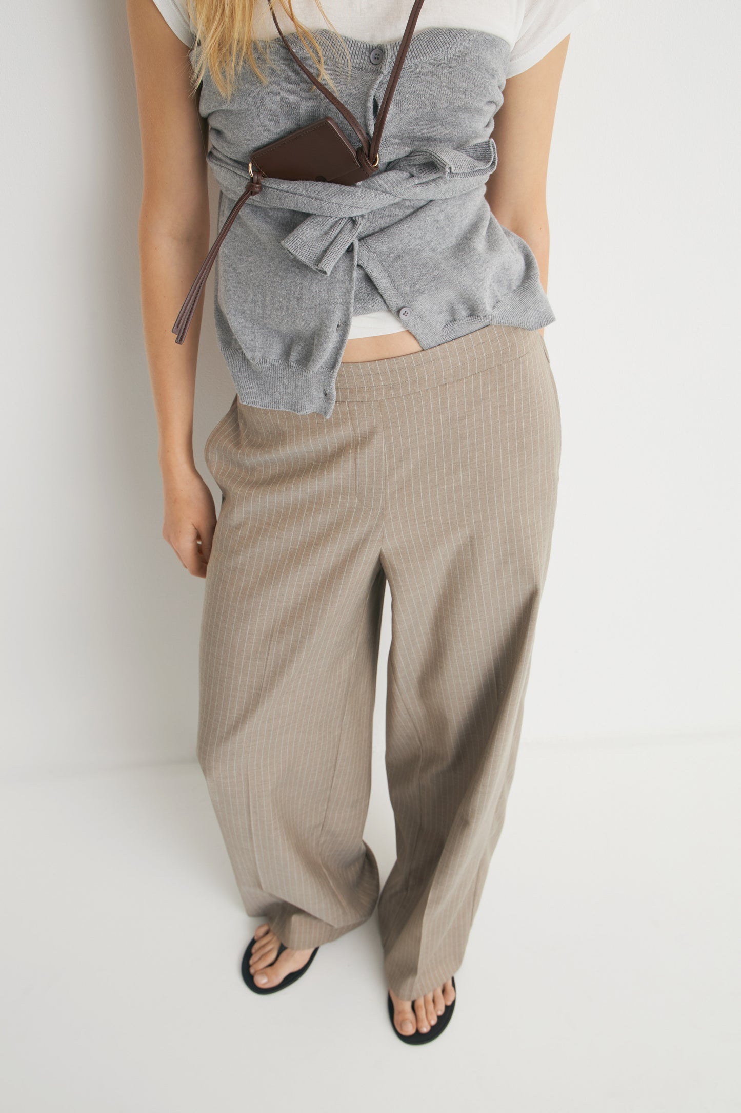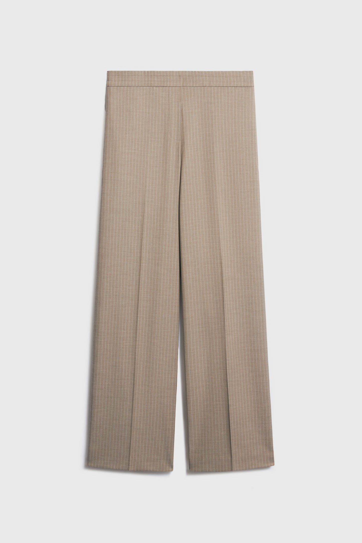 Full-length trousers. Wide-leg design with creases. Featuring front pockets and decorative welt pocket.