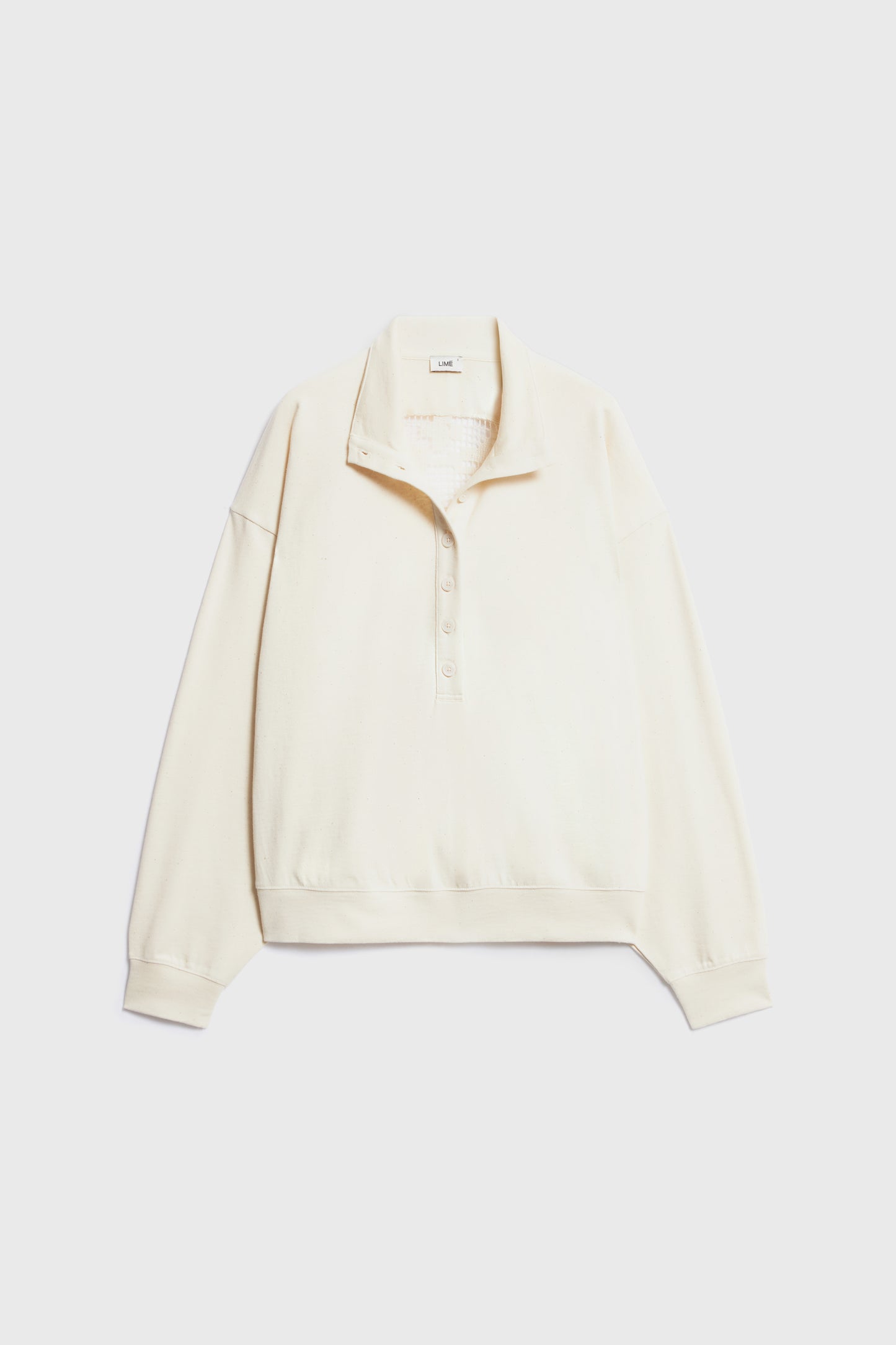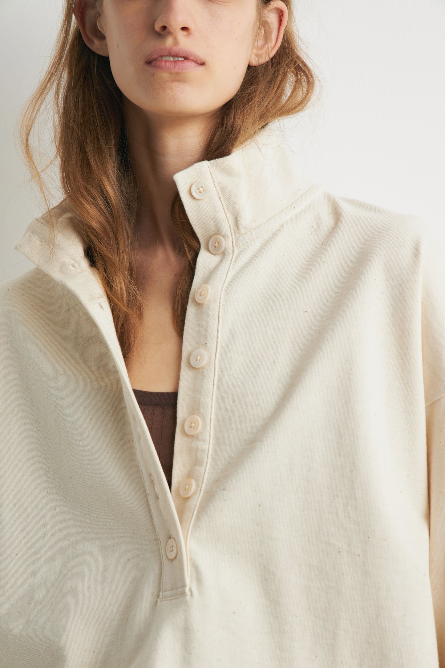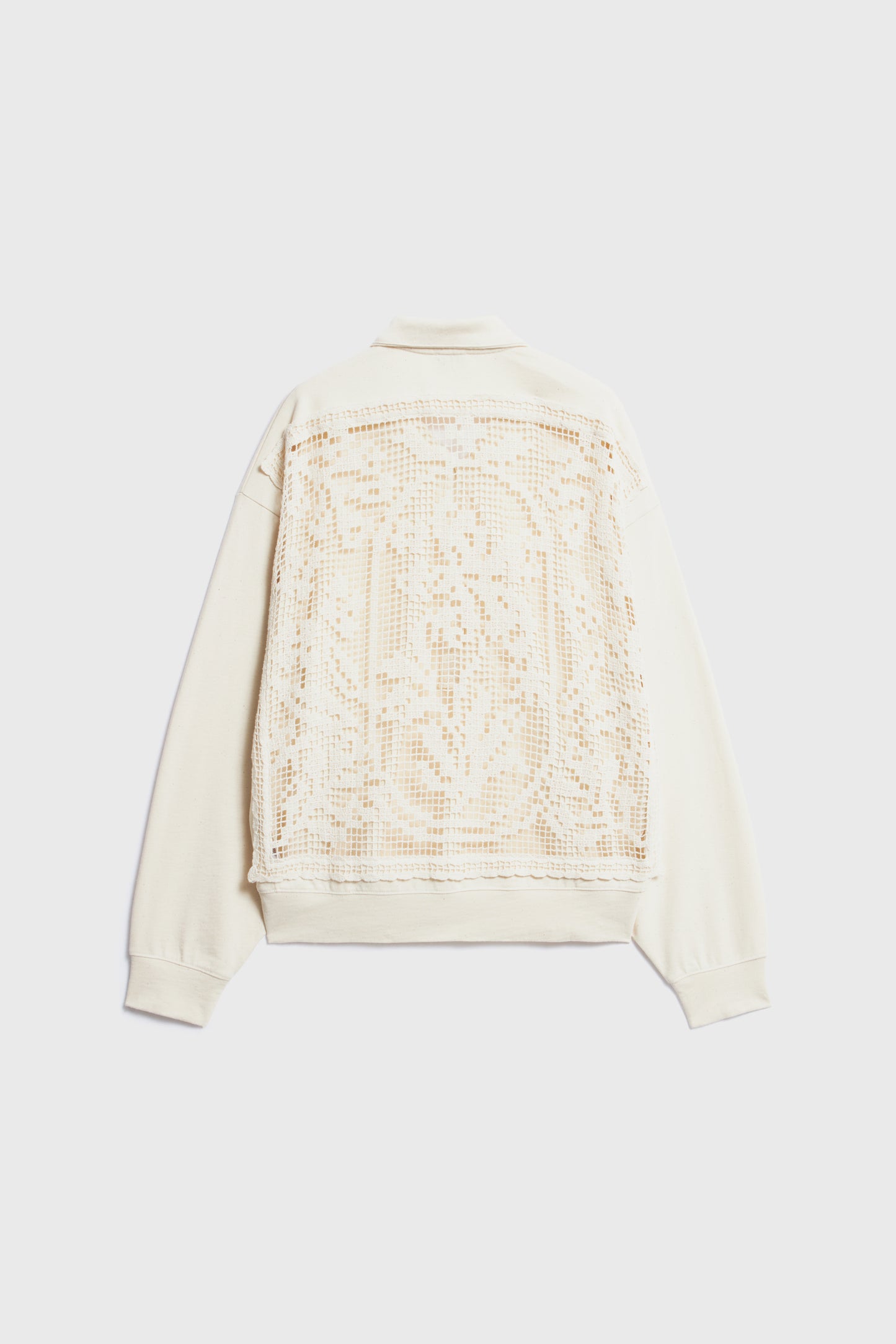 Oversized sweatshirt in melange cotton fabric containing some exotic cotton-like kapok fibers. Featuring a collar, button placket and long sleeves. Decorated with back crochet-look detail.