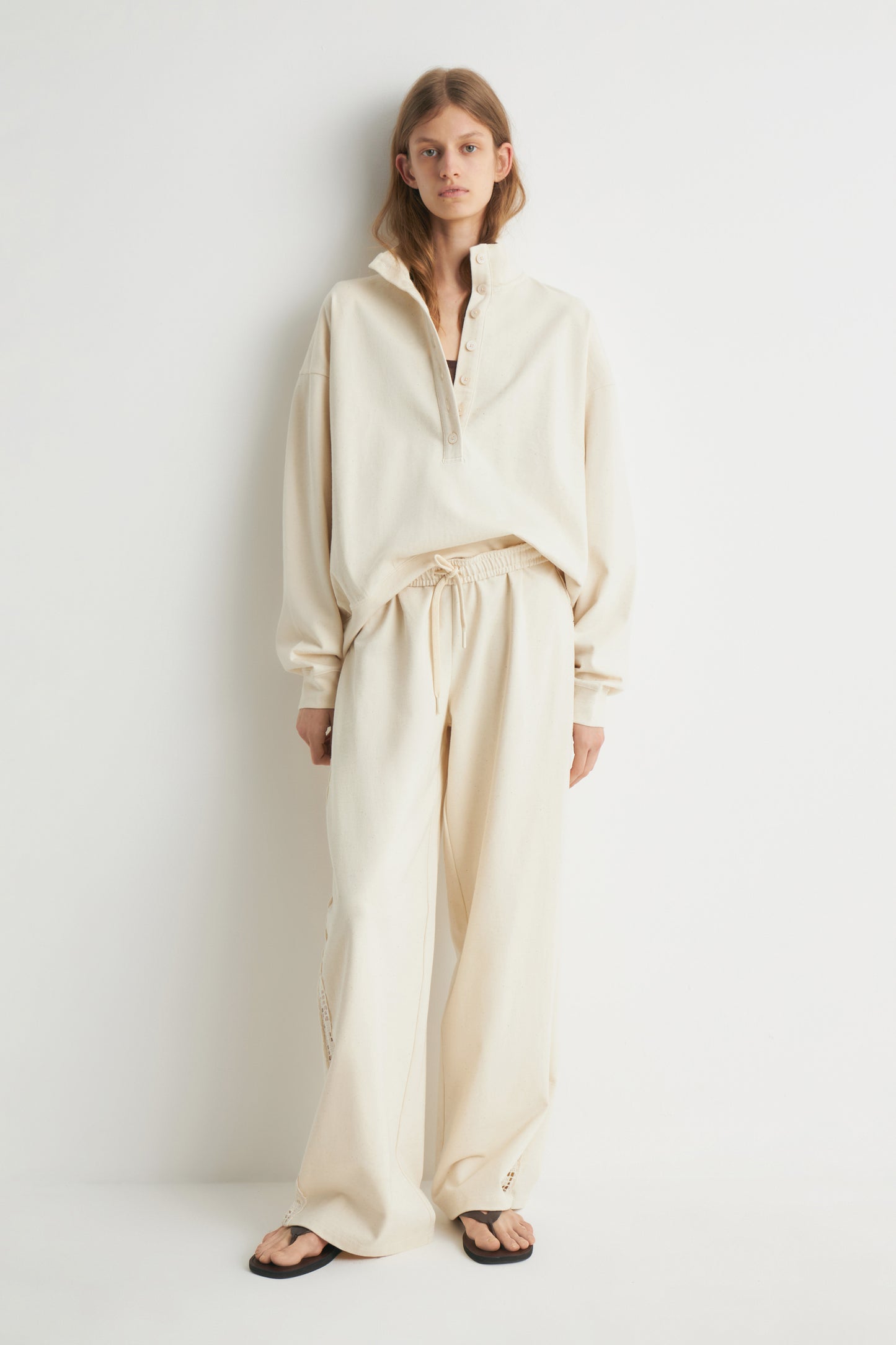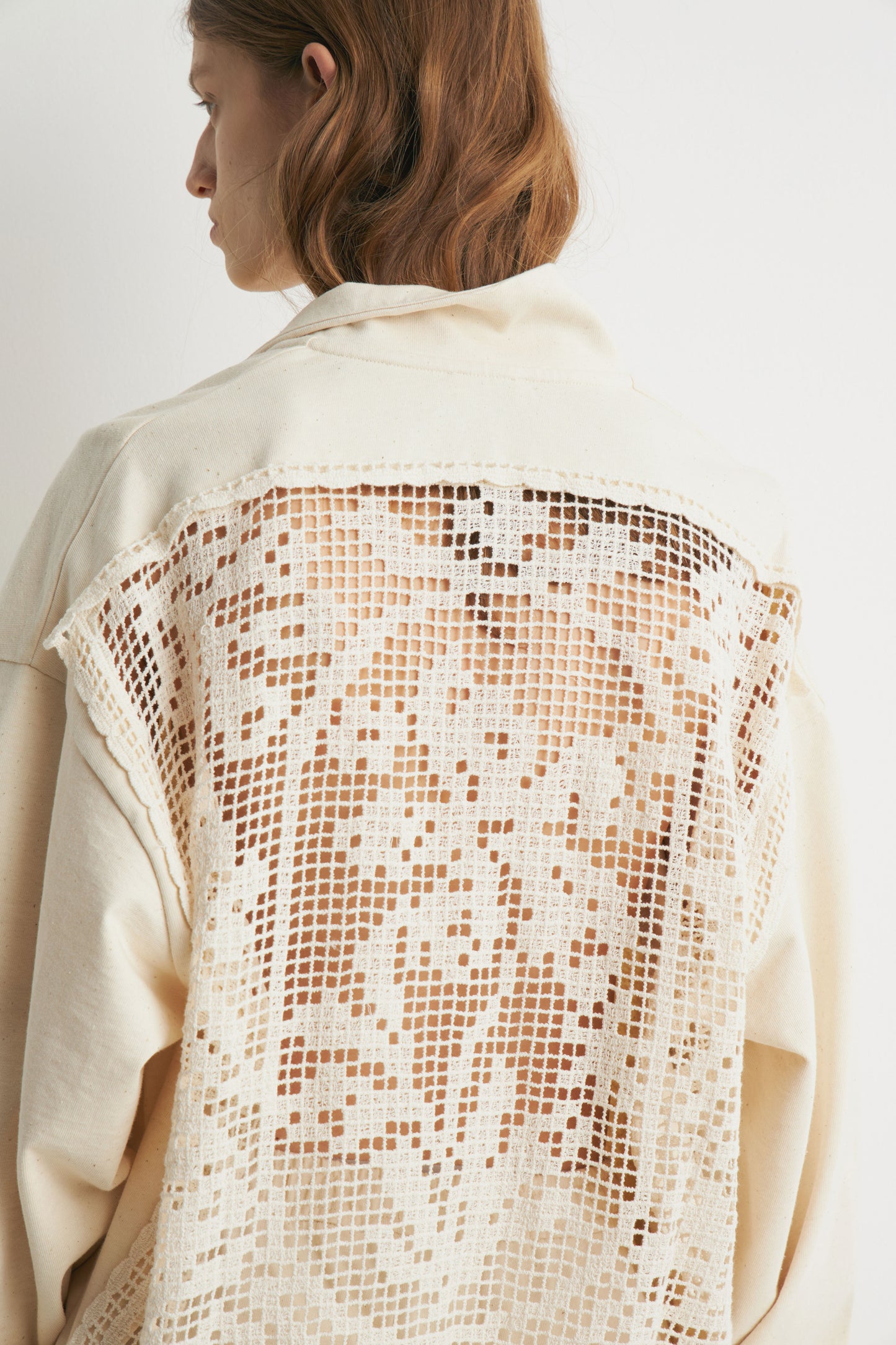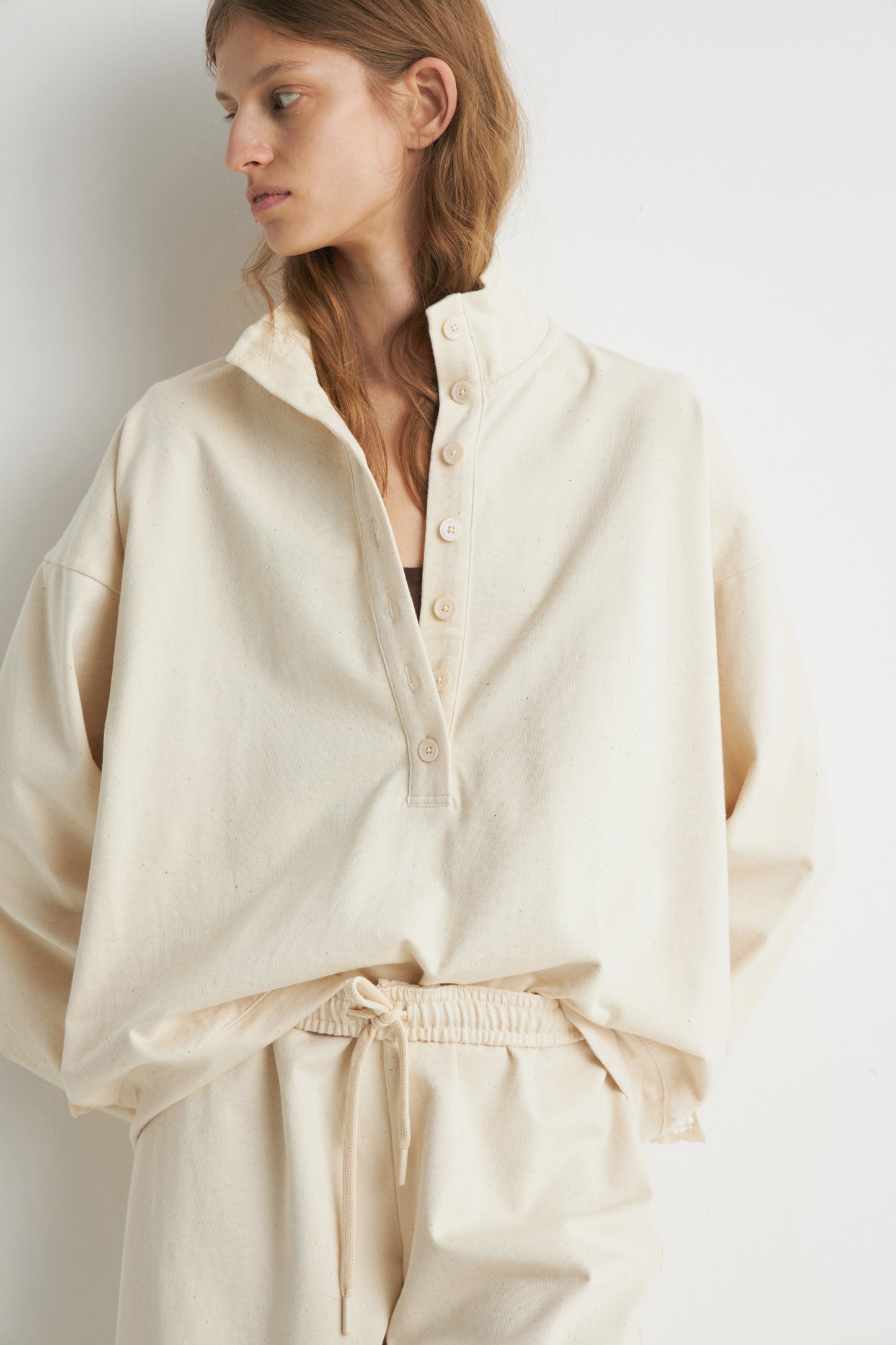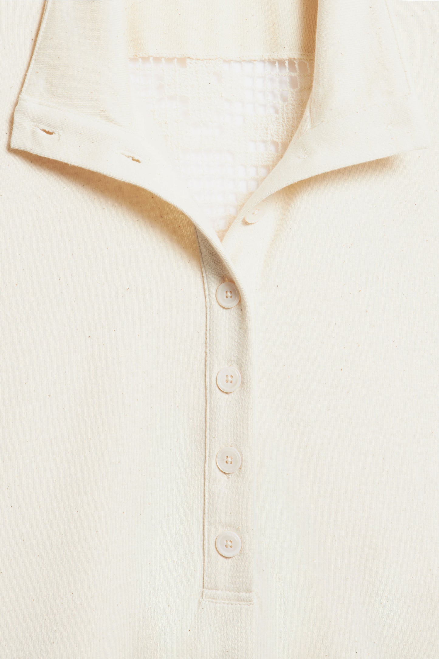 Oversized sweatshirt in melange cotton fabric containing some exotic cotton-like kapok fibers. Featuring a collar, button placket and long sleeves. Decorated with back crochet-look detail.