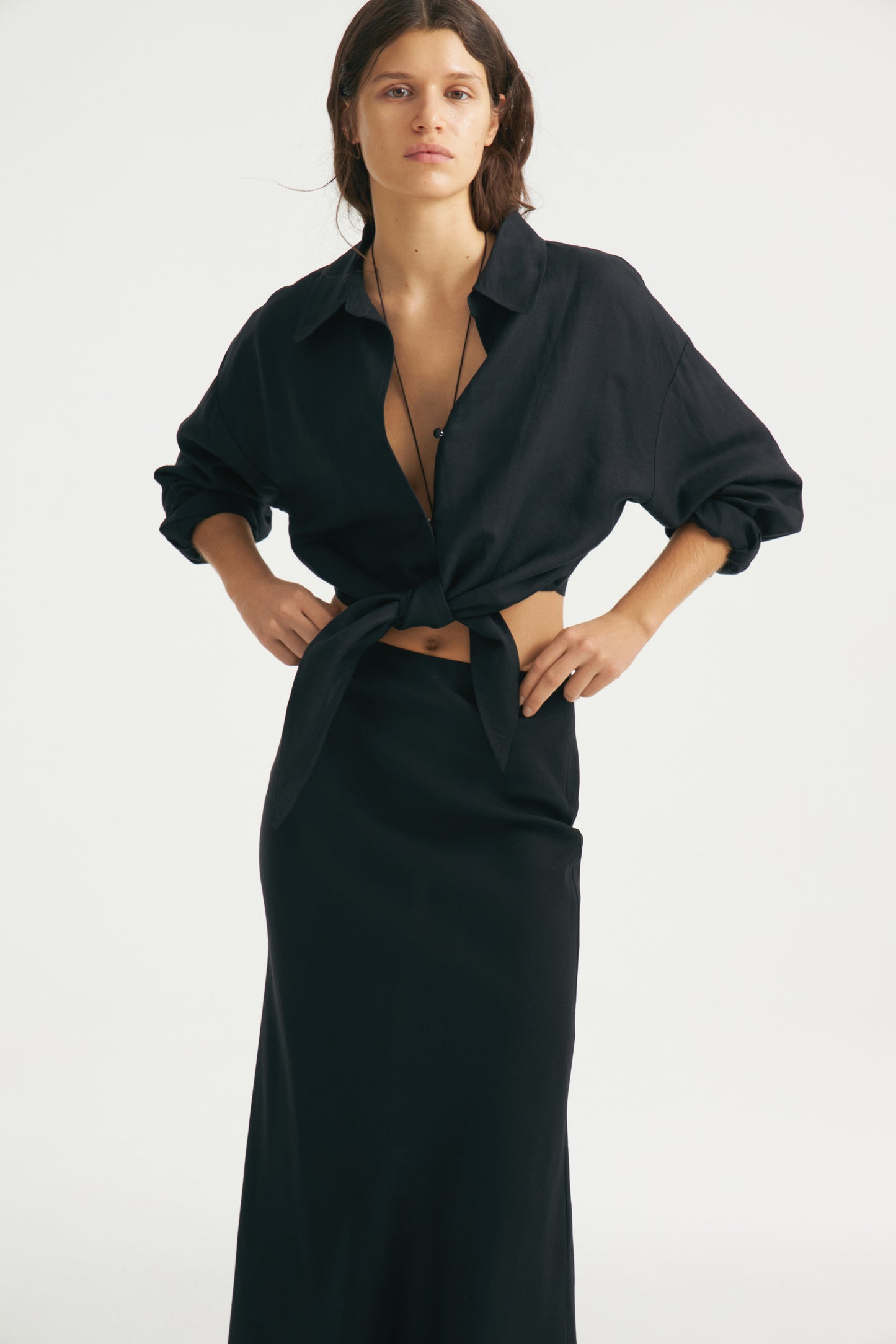Collared shirt with tied detail and long sleeves made of natural linen-viscose blend. Cropped. Button-up front.
