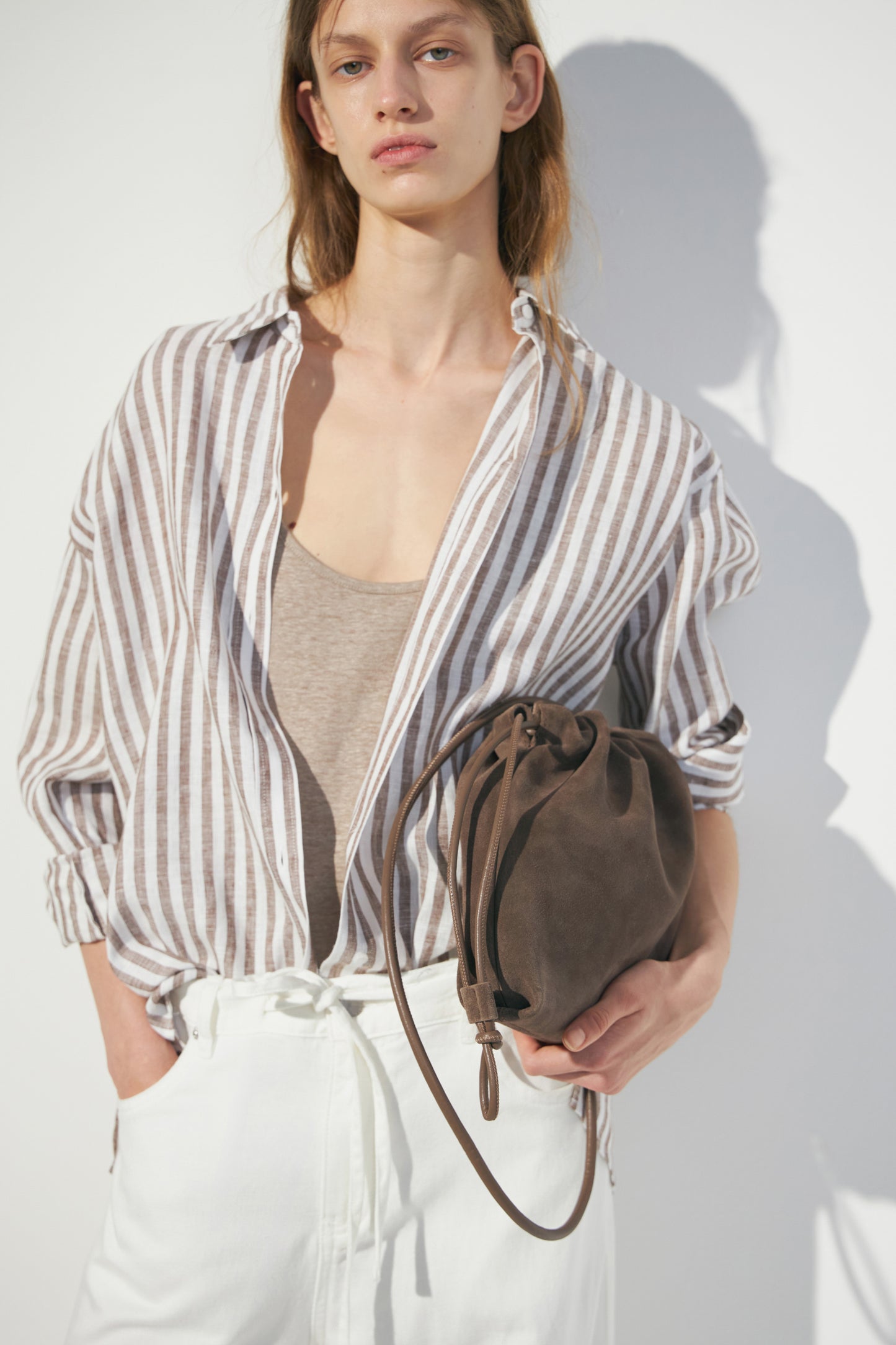 Crossbody suede bag. Features a shoulder strap and drawstring. Magnetic closure. Lined. Size: 28 х 6 х 25 cm (length х width х height).