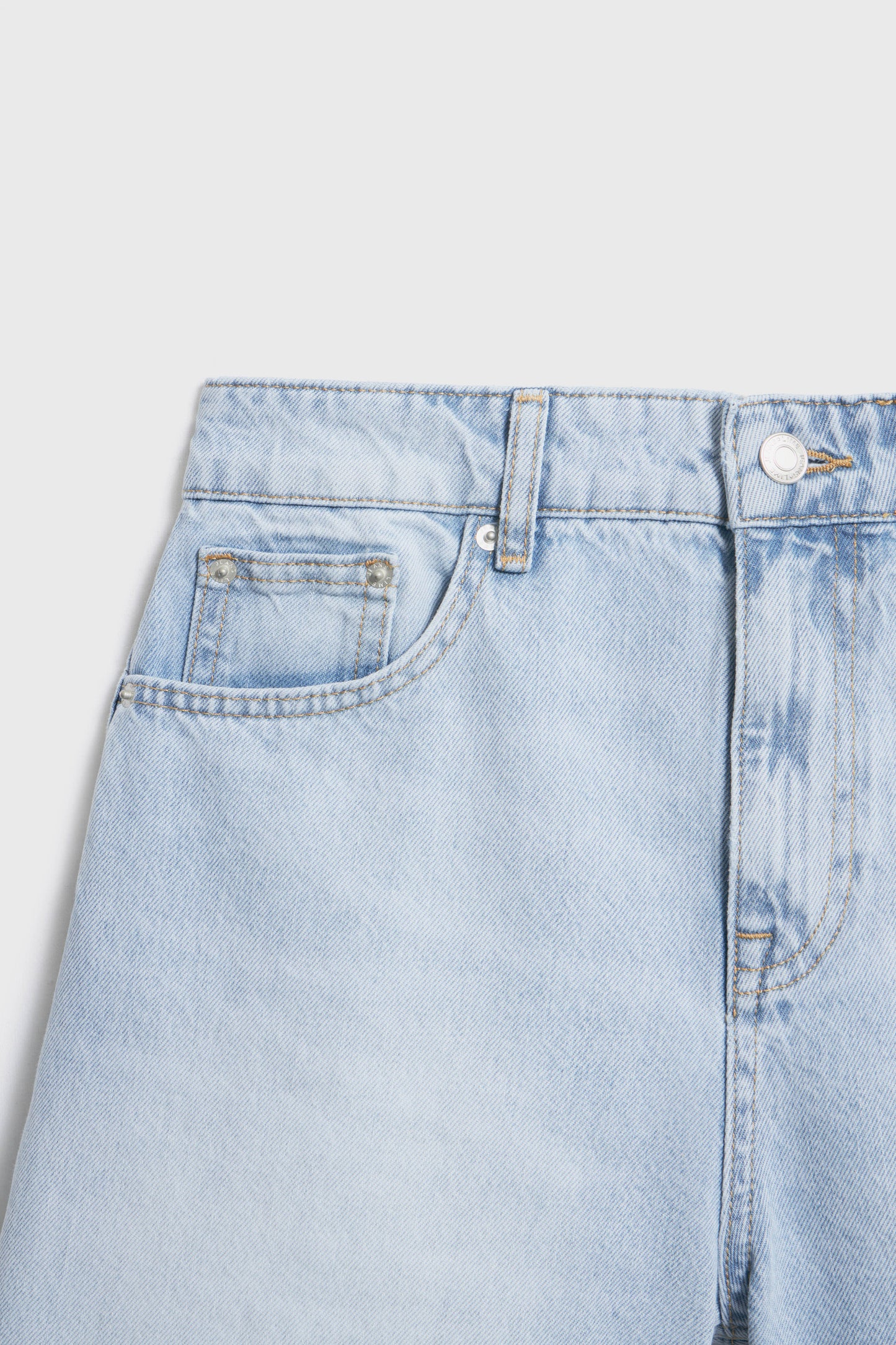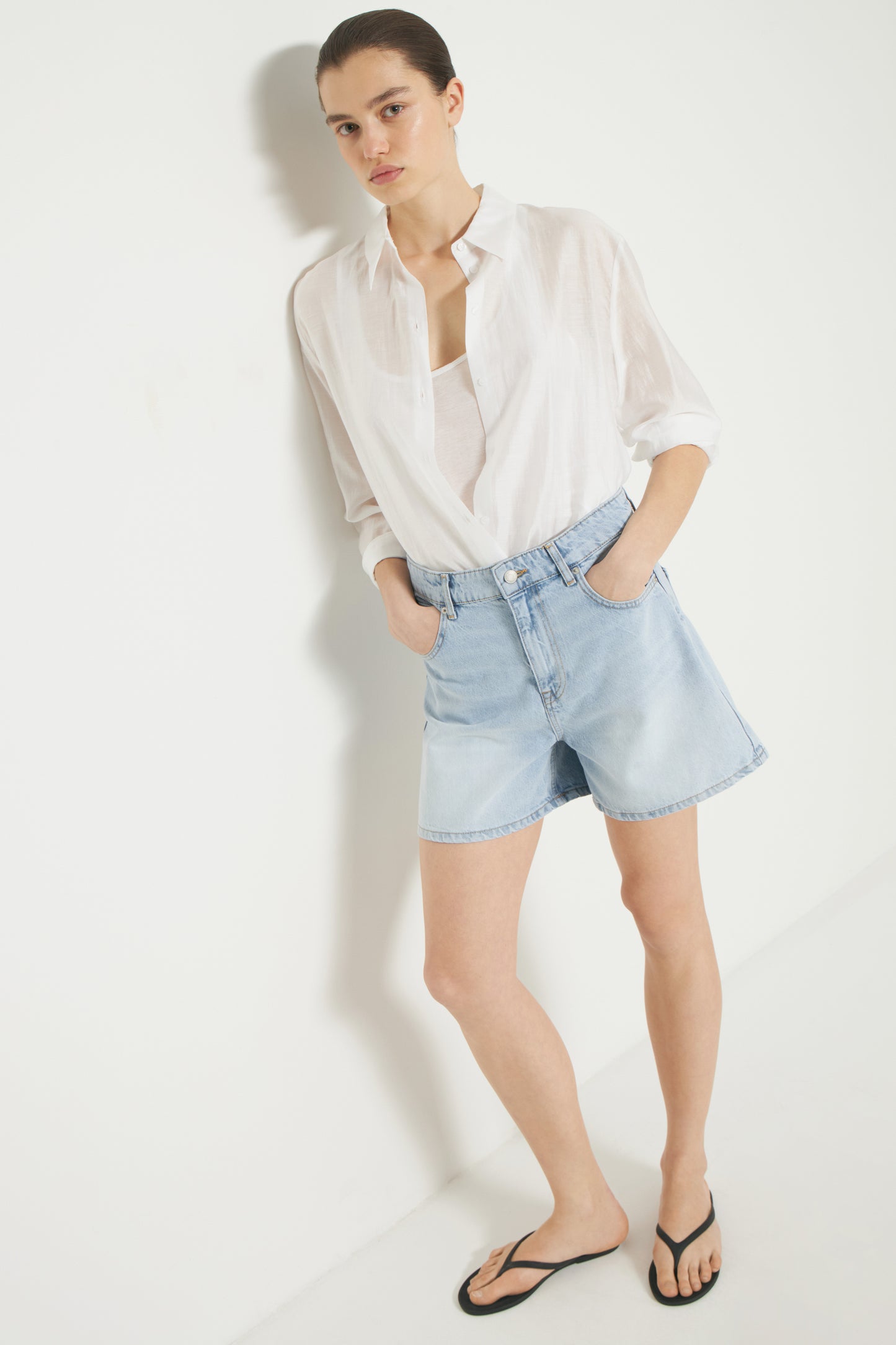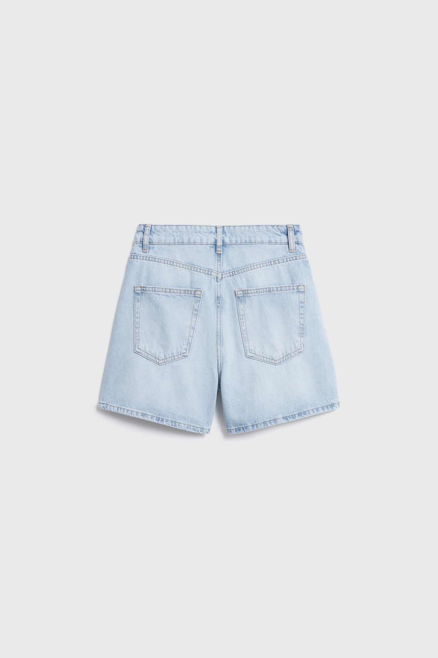 High-waist mini shorts with five pockets. Made from washed cotton denim. Zip fly and metal button fastening.