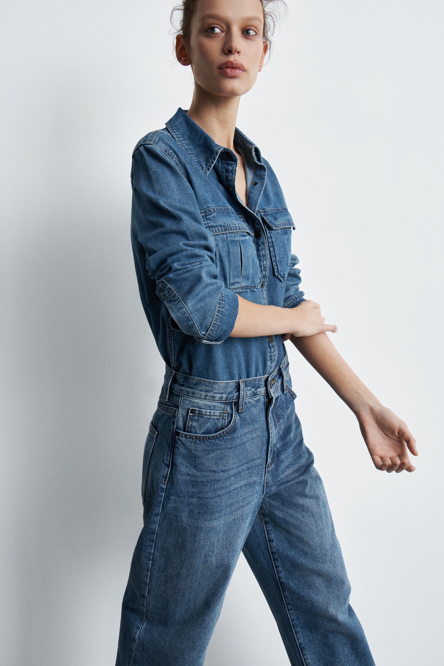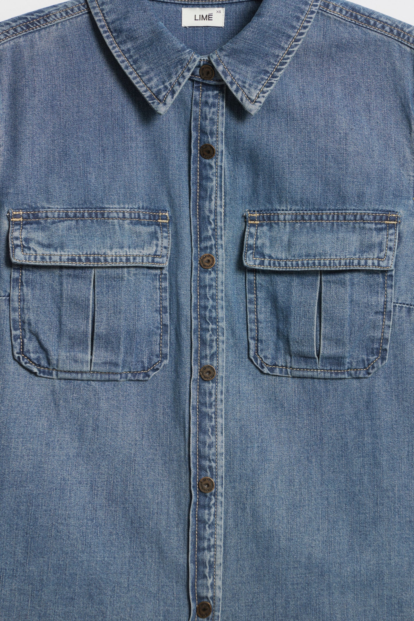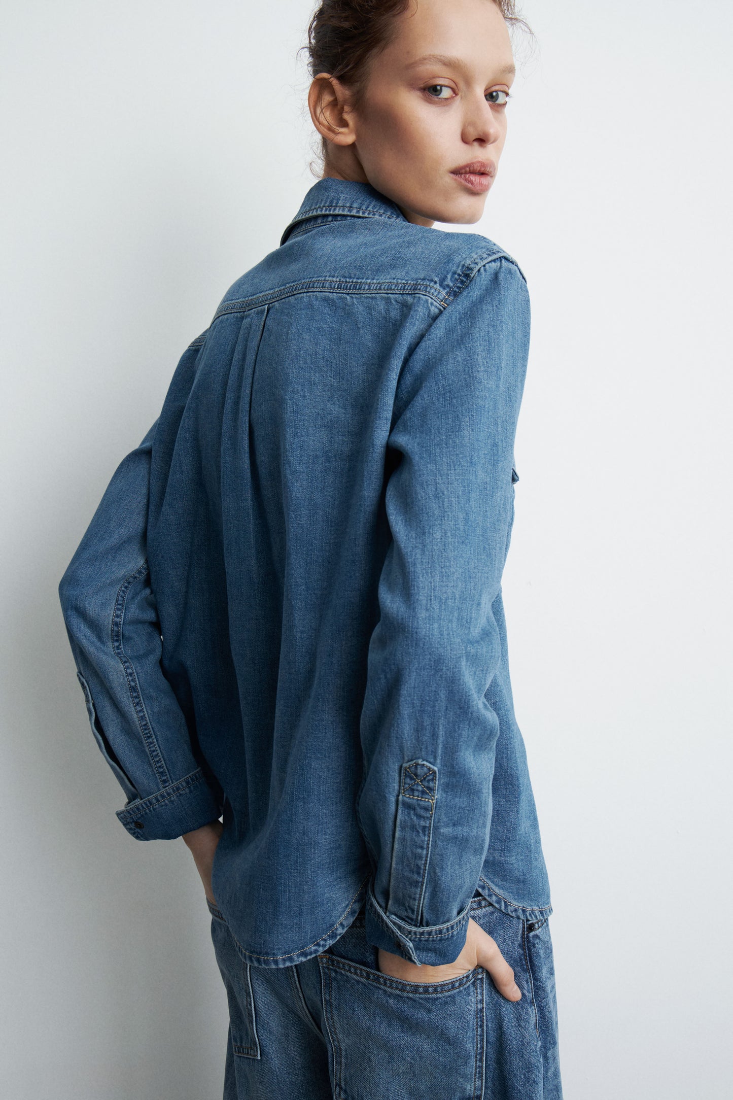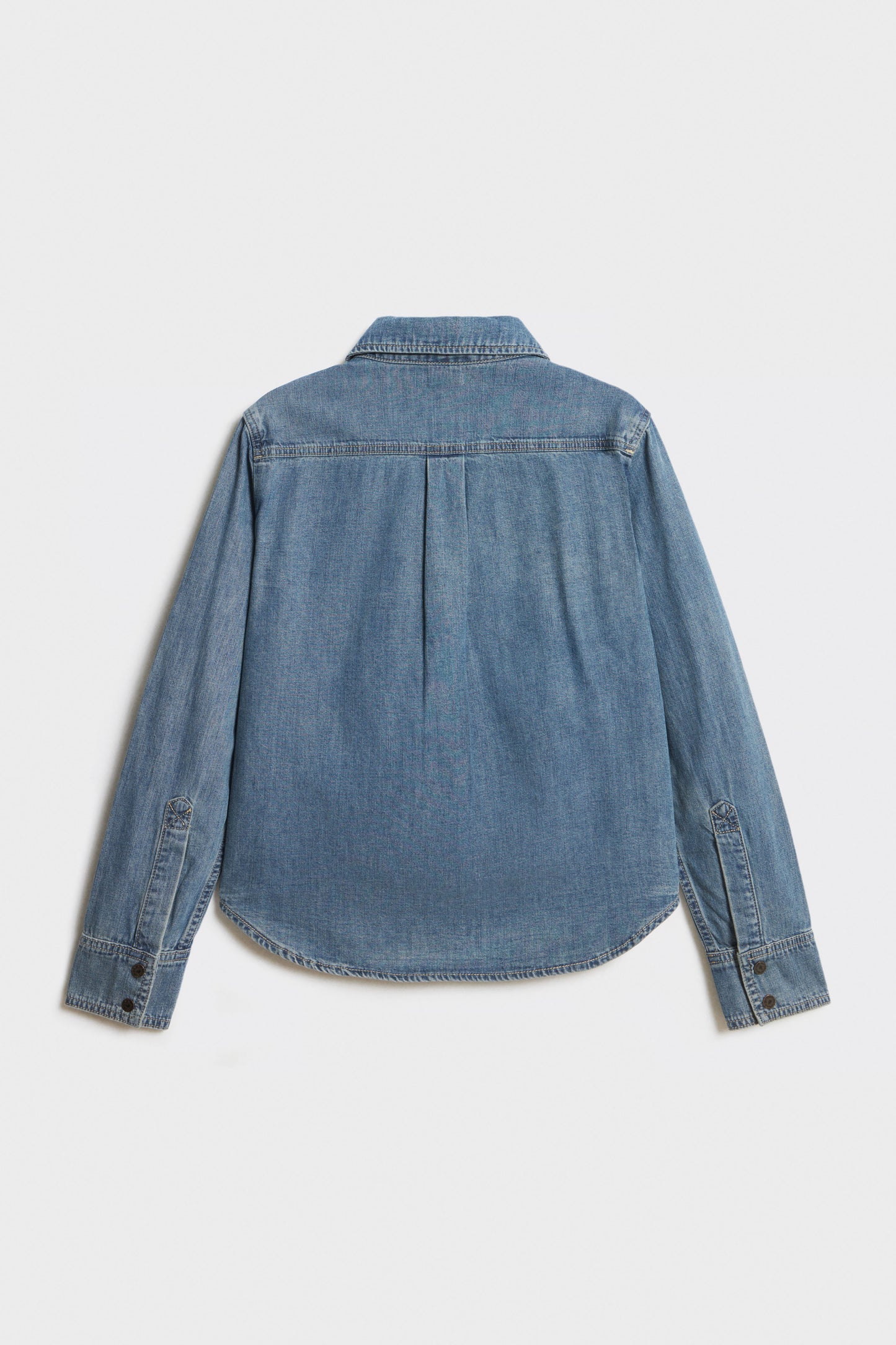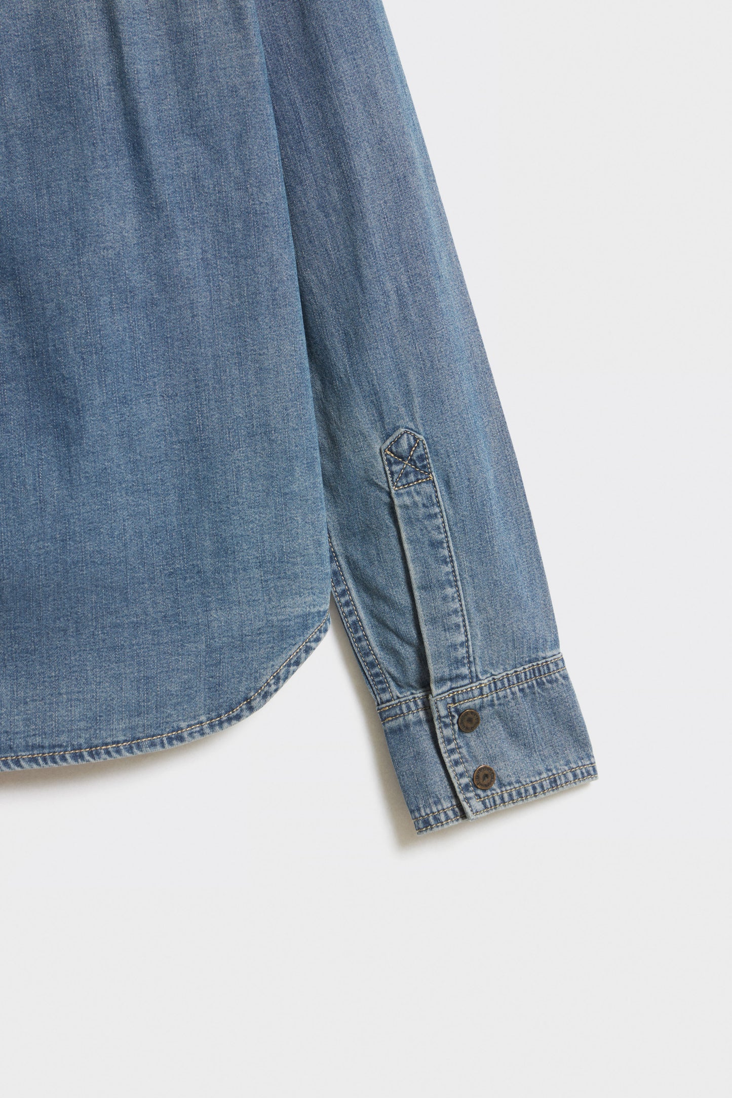 Shirt in cotton denim with a collar. Featuring long sleeves buttoned cuffs and chest pockets. Rounded hem. Slim fit. Front snap button fastening.