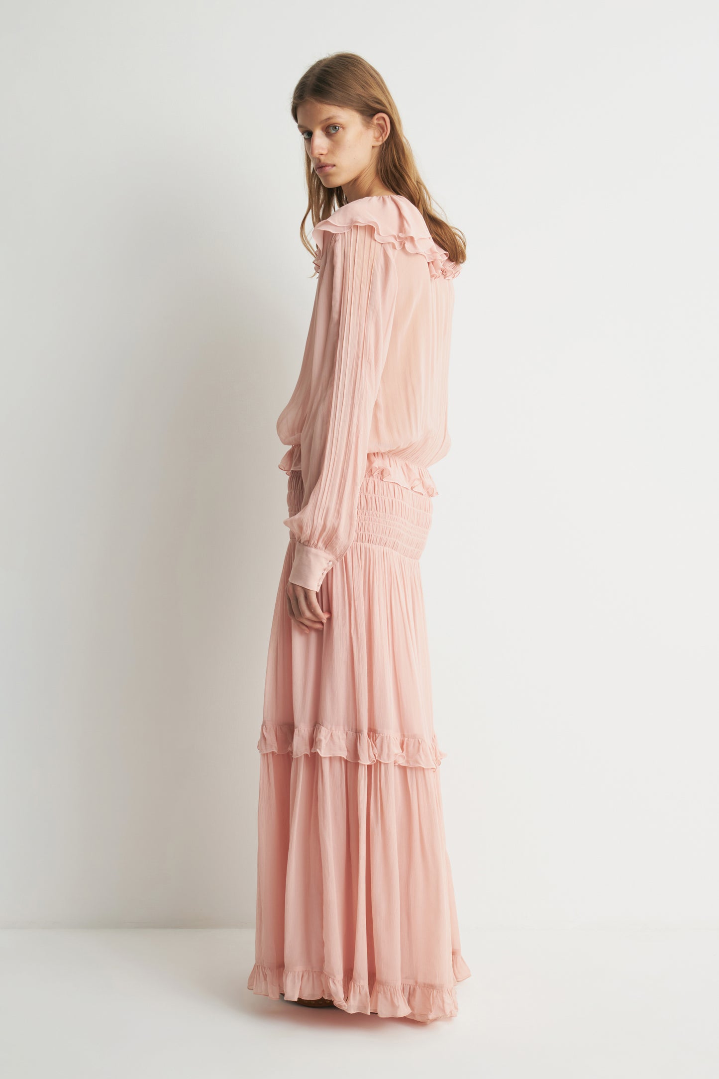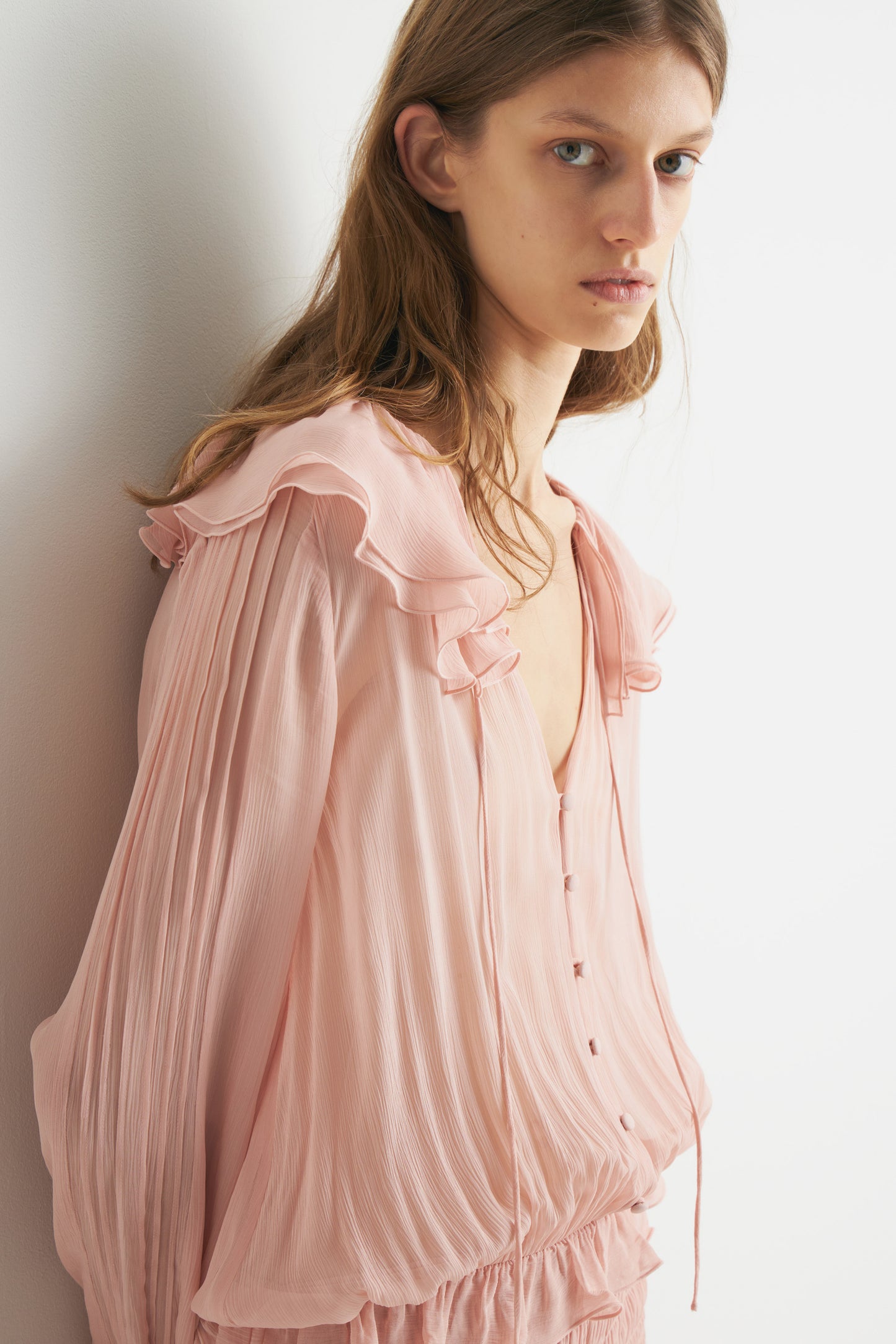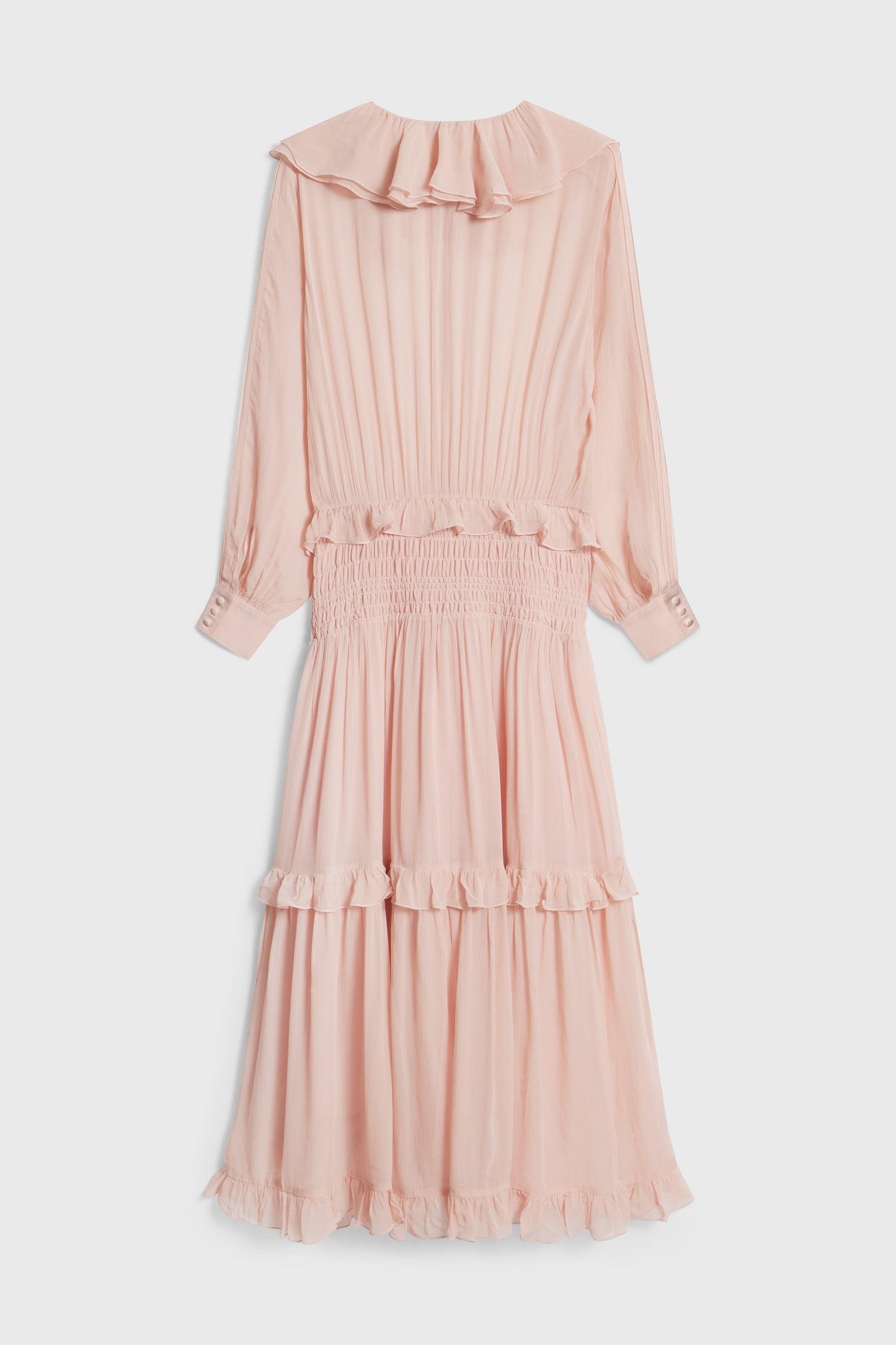 Ankle-length, fitted dress in soft viscose with a frill-trimmed round neck and long sleeves. All-over pleats for a gently draped effect. Covered buttons down the front and buttoned cuffs. Lined.