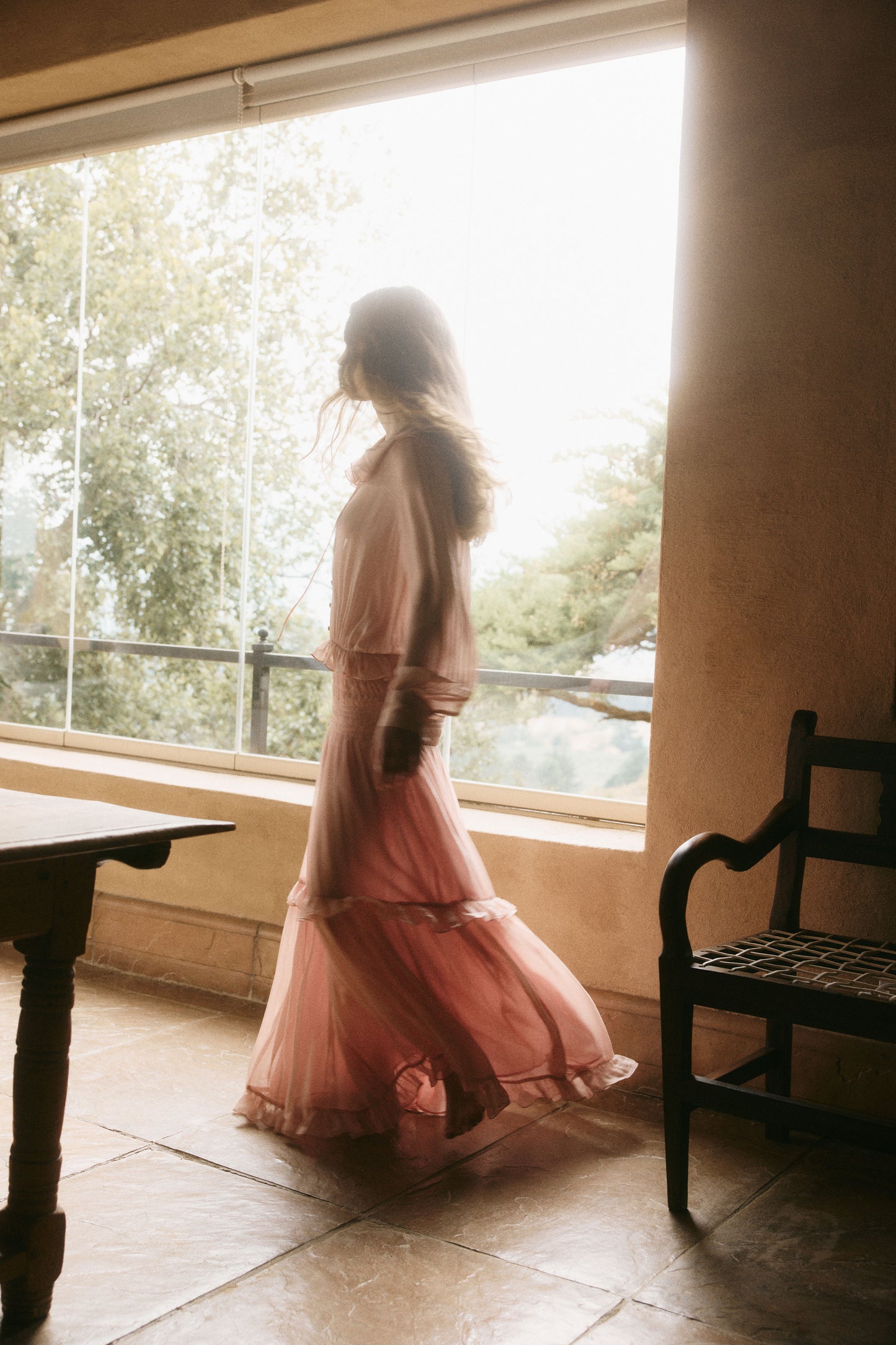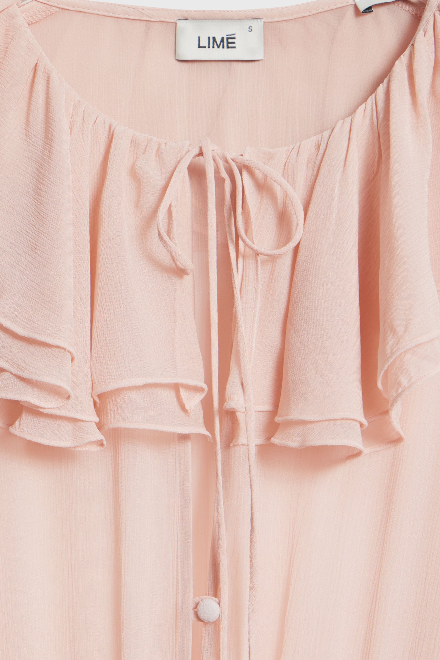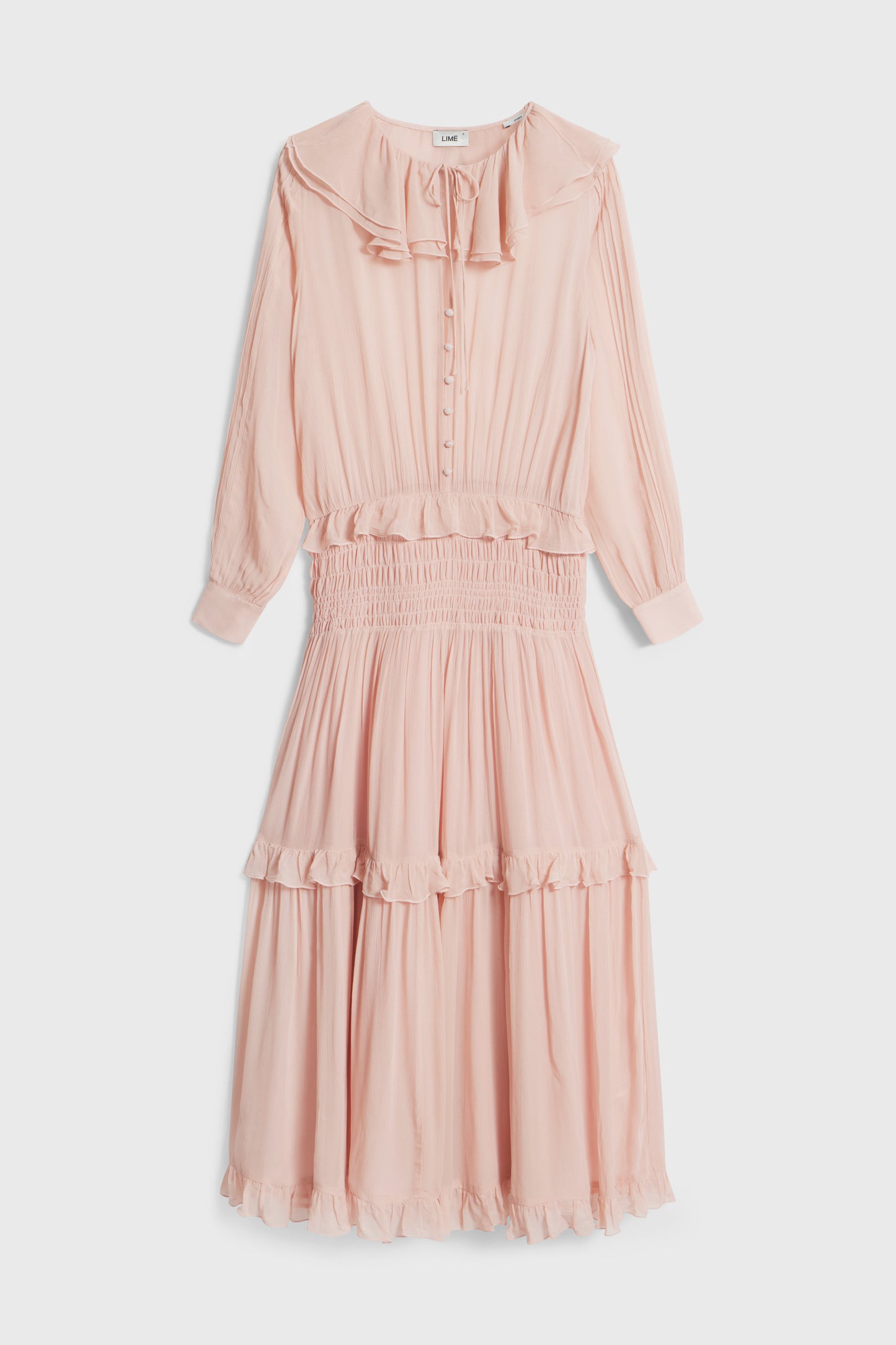 Ankle-length, fitted dress in soft viscose with a frill-trimmed round neck and long sleeves. All-over pleats for a gently draped effect. Covered buttons down the front and buttoned cuffs. Lined.