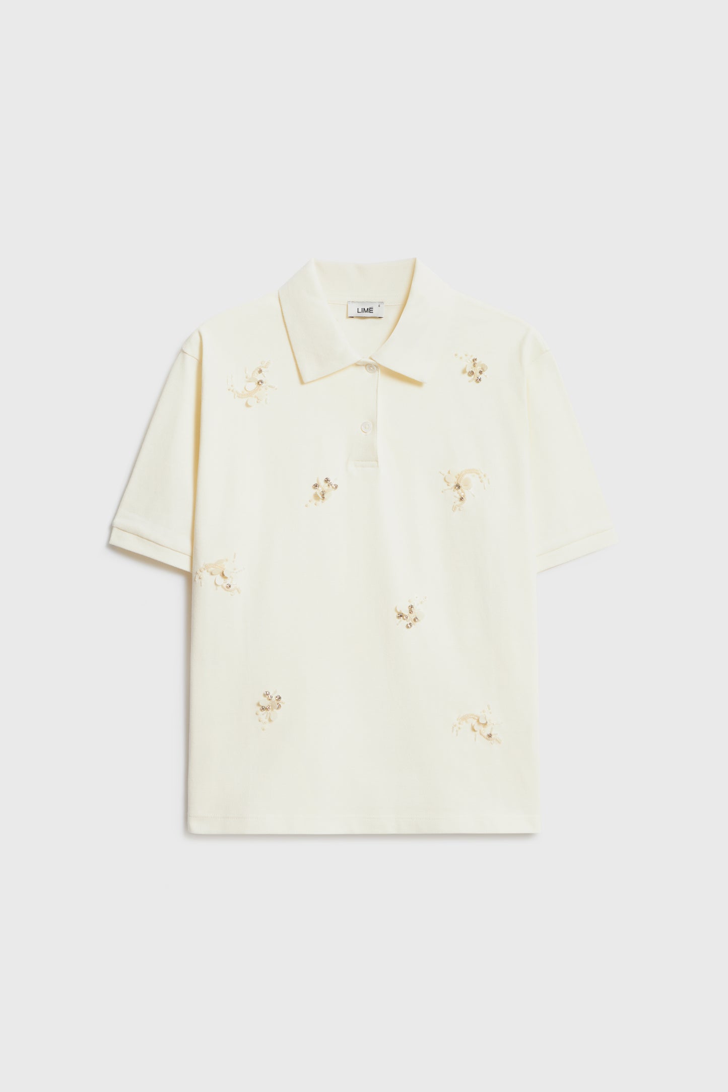 Regular-fit polo shirt in a soft cotton piqué with bead embroidery and rhinestone appliqués on the front. Collar, button placket, and short sleeves.