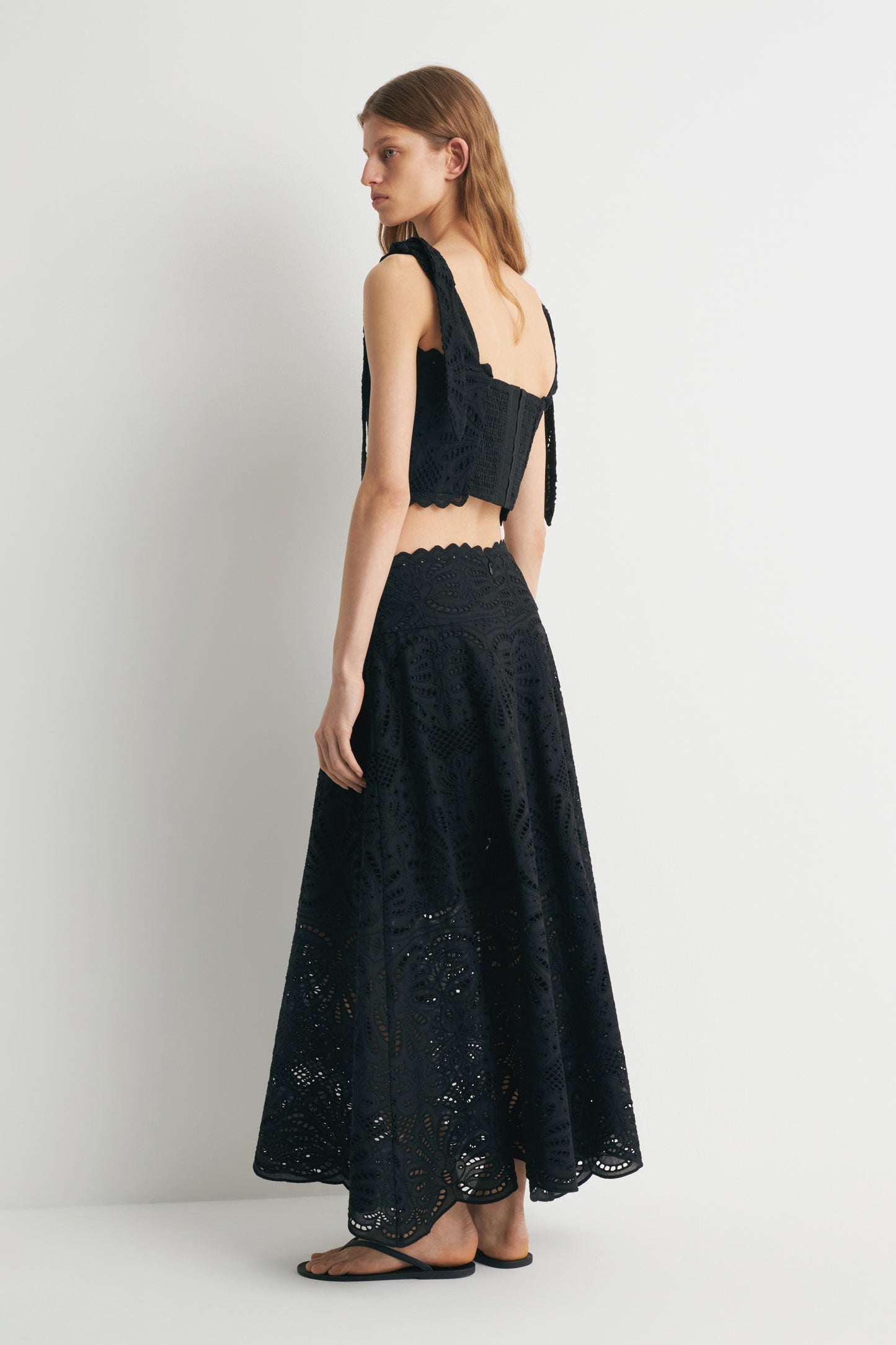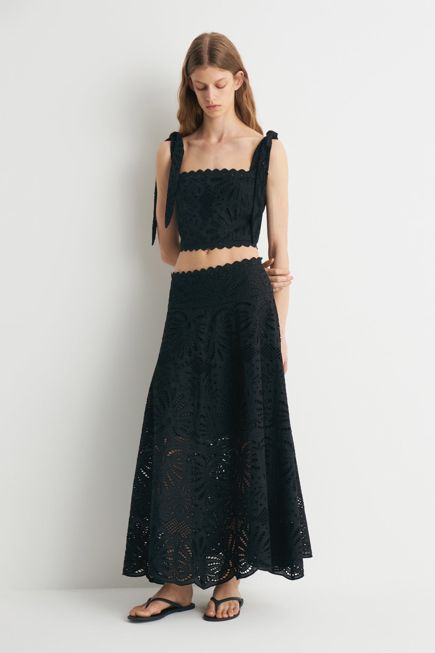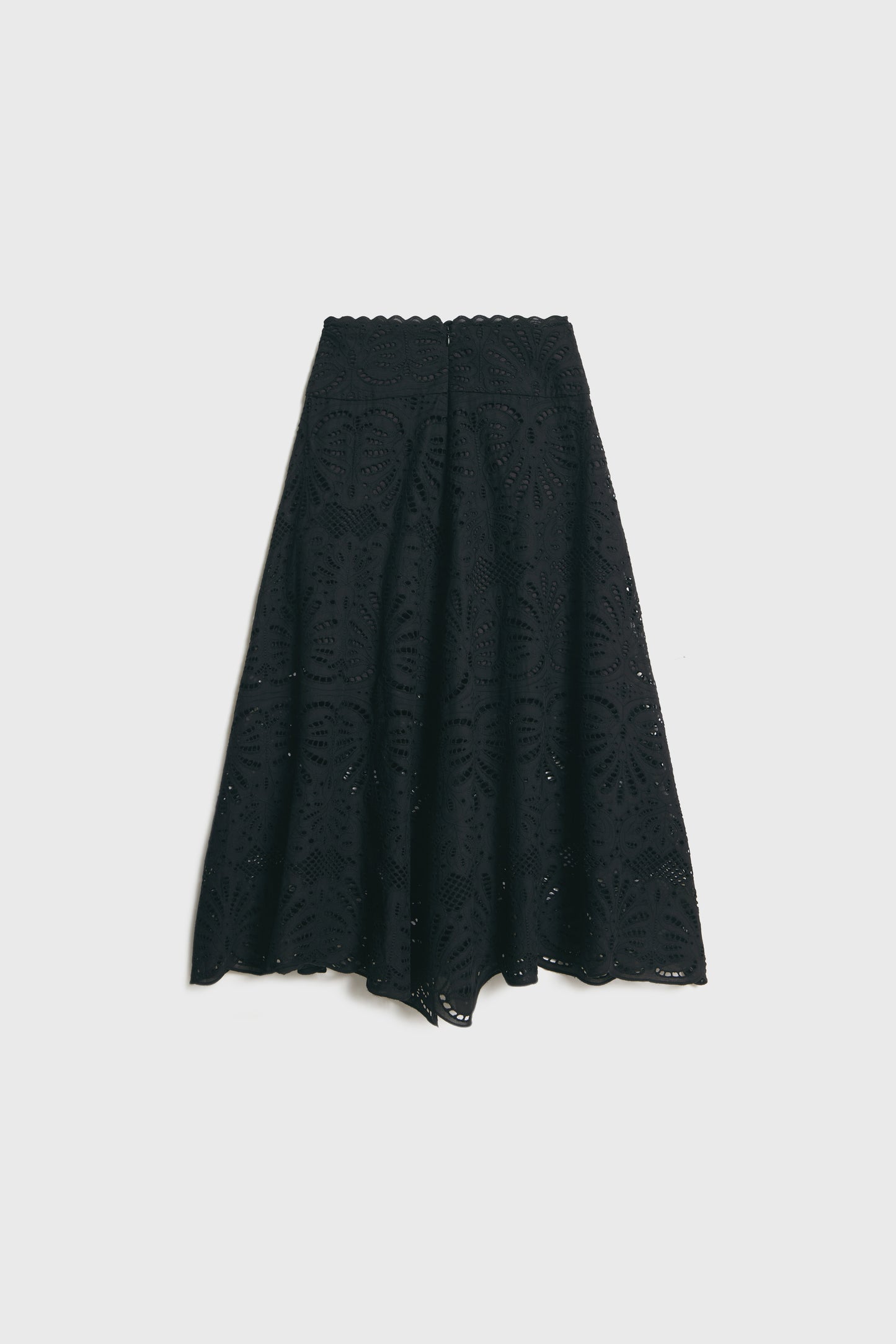 Flared skirt in a cotton weave with all-over embroidery. Scalloped waistband and a concealed zip at the back. Soft lining.