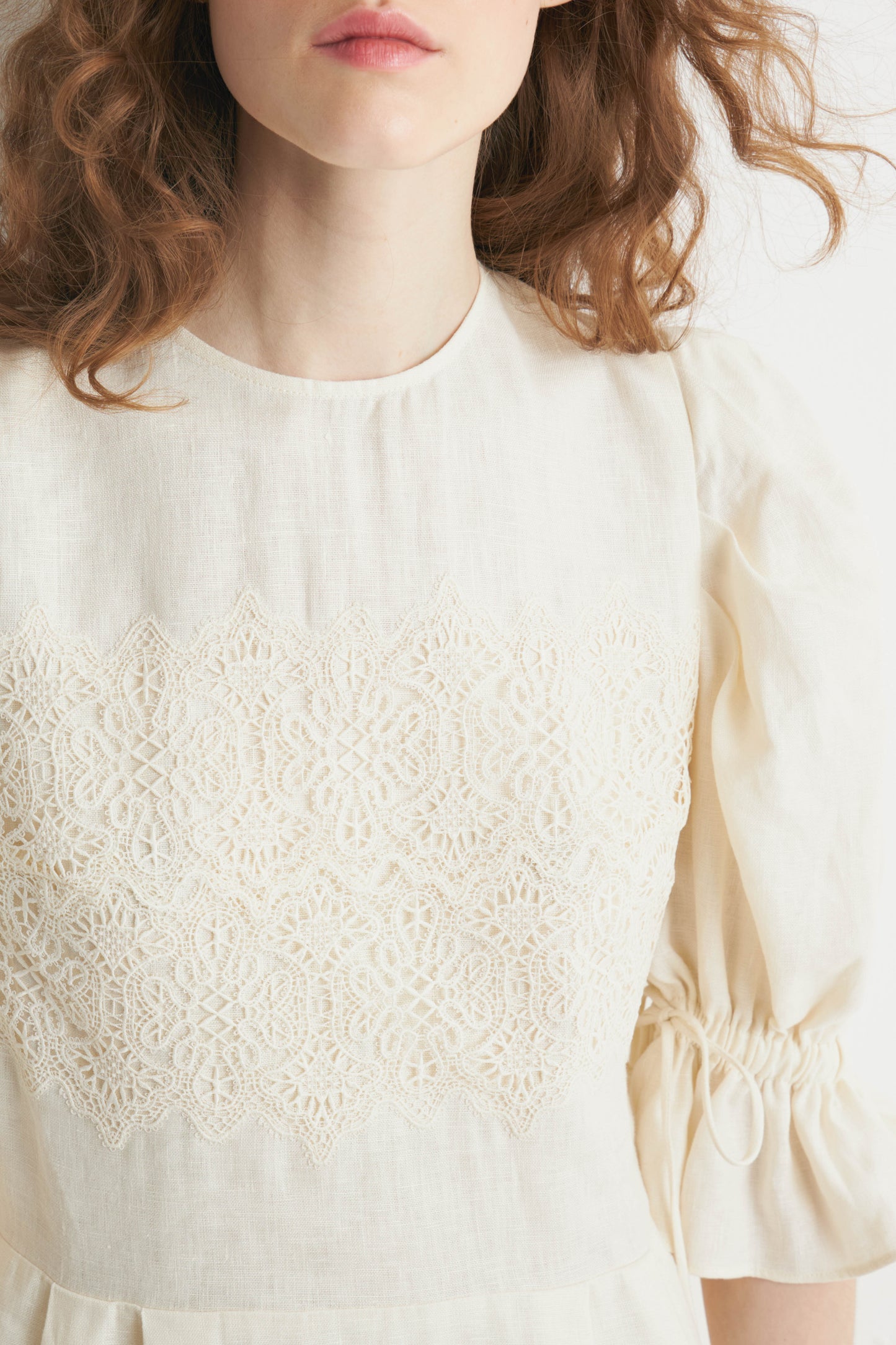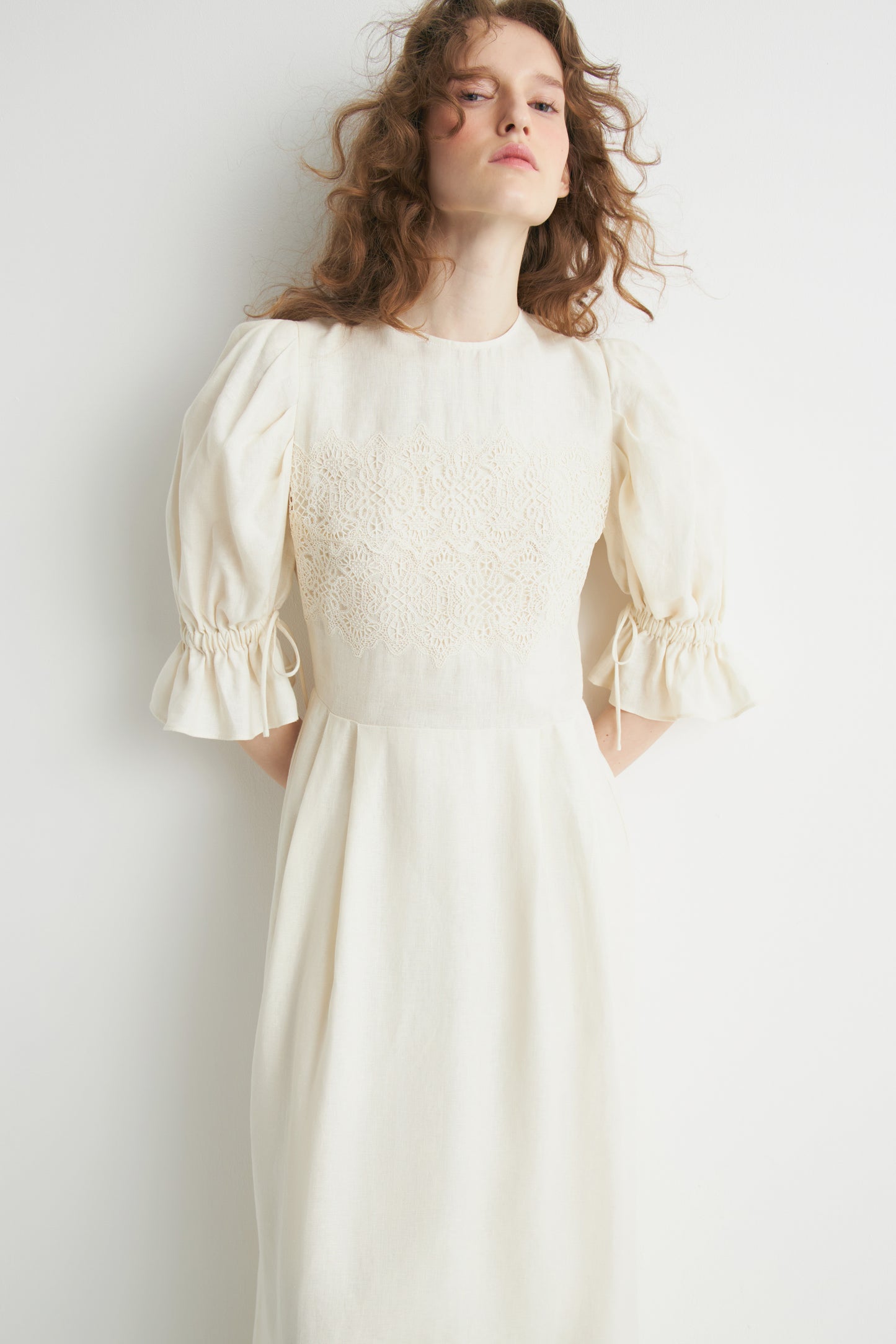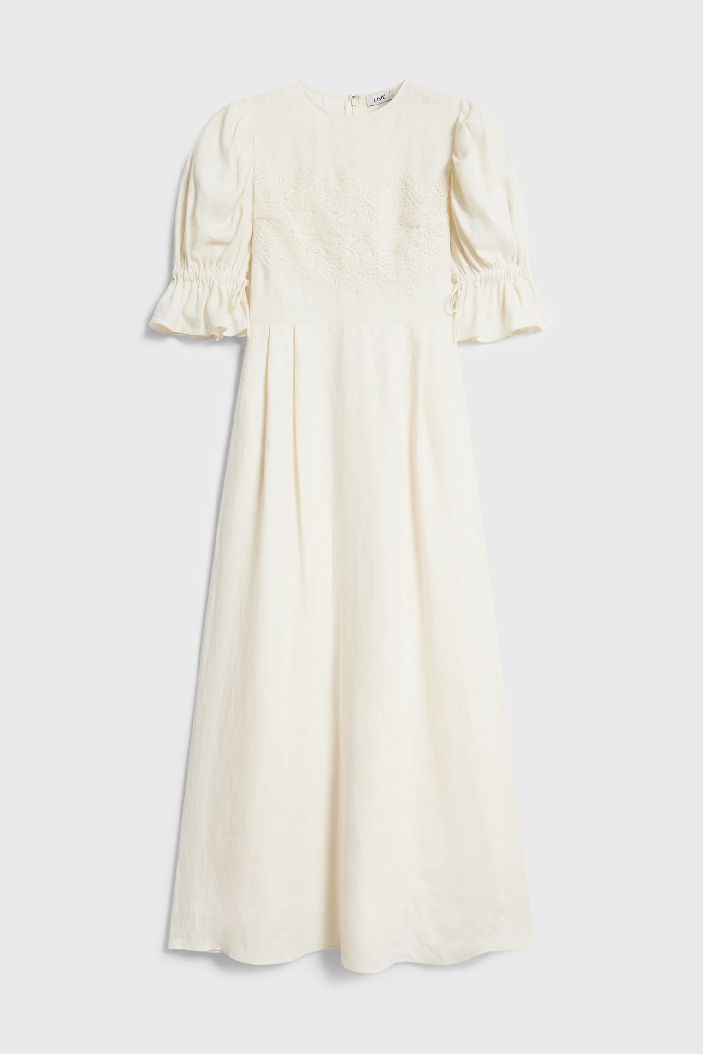 Calf-length, loose-fit dress in a linen weave with accent crochet-look trim. Short balloon sleeves with wide cuffs. Gathered seams at the waist and above the hem for added volume. Lined. A concealed zip and metal hook at the back.