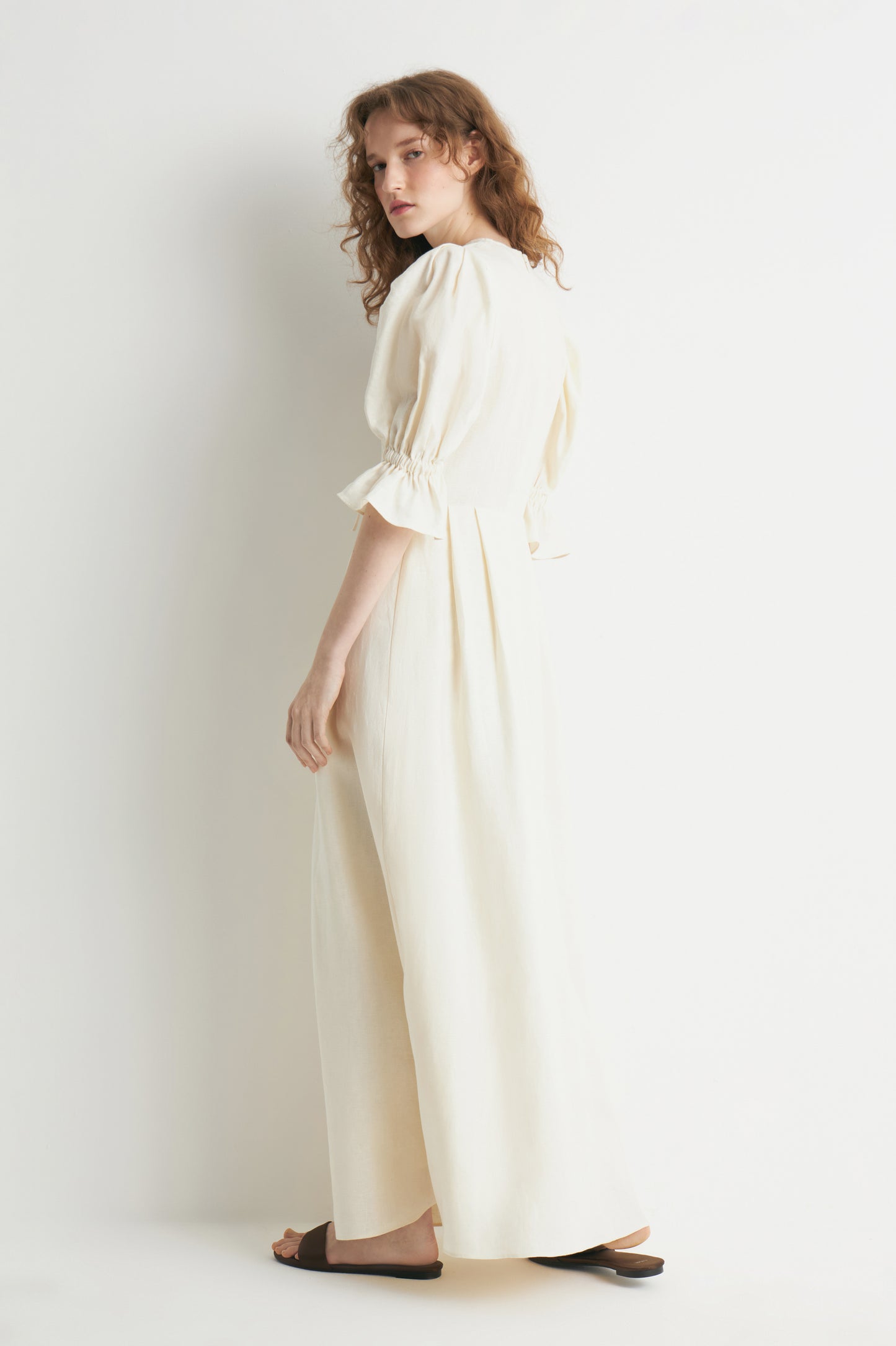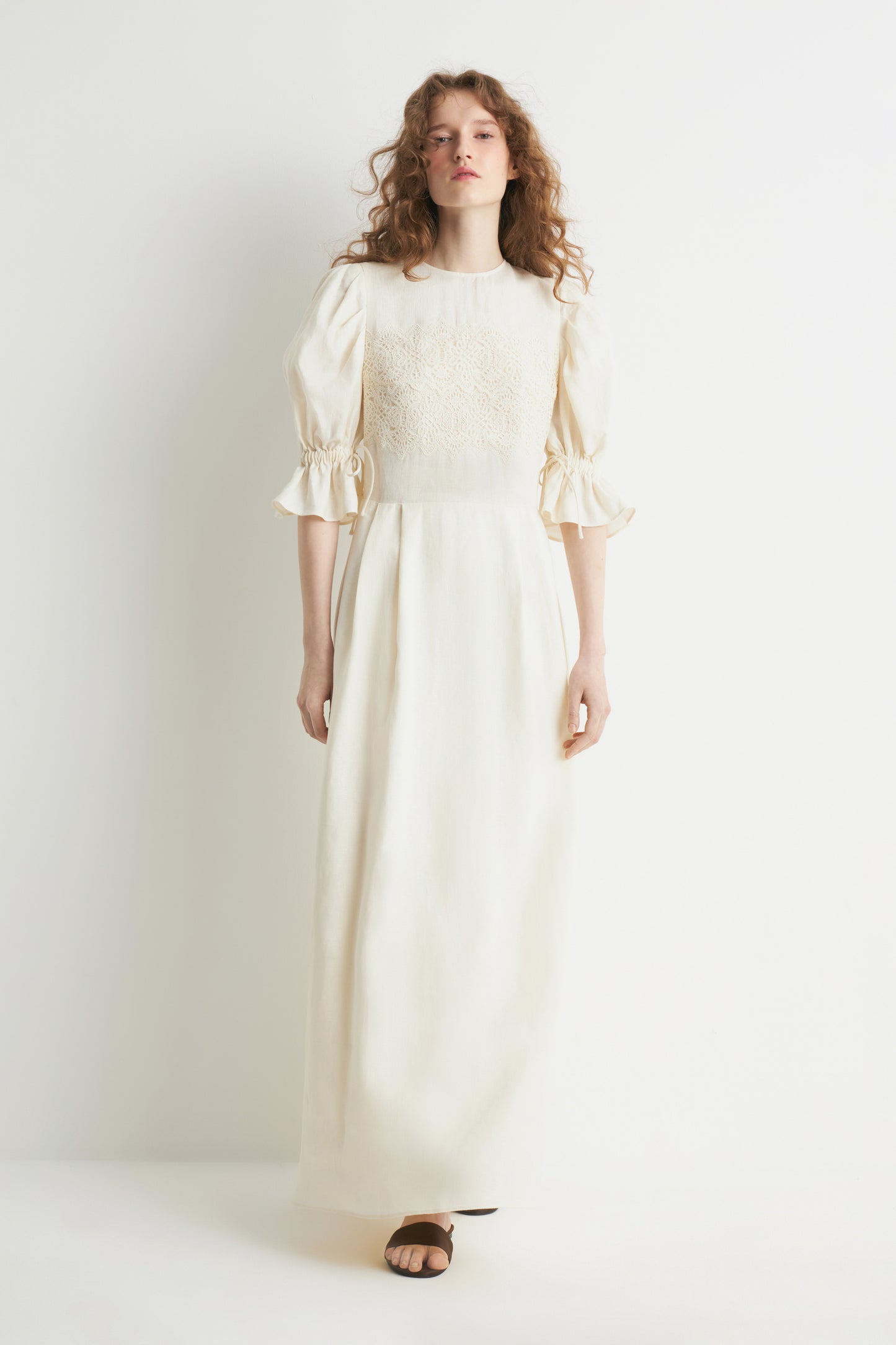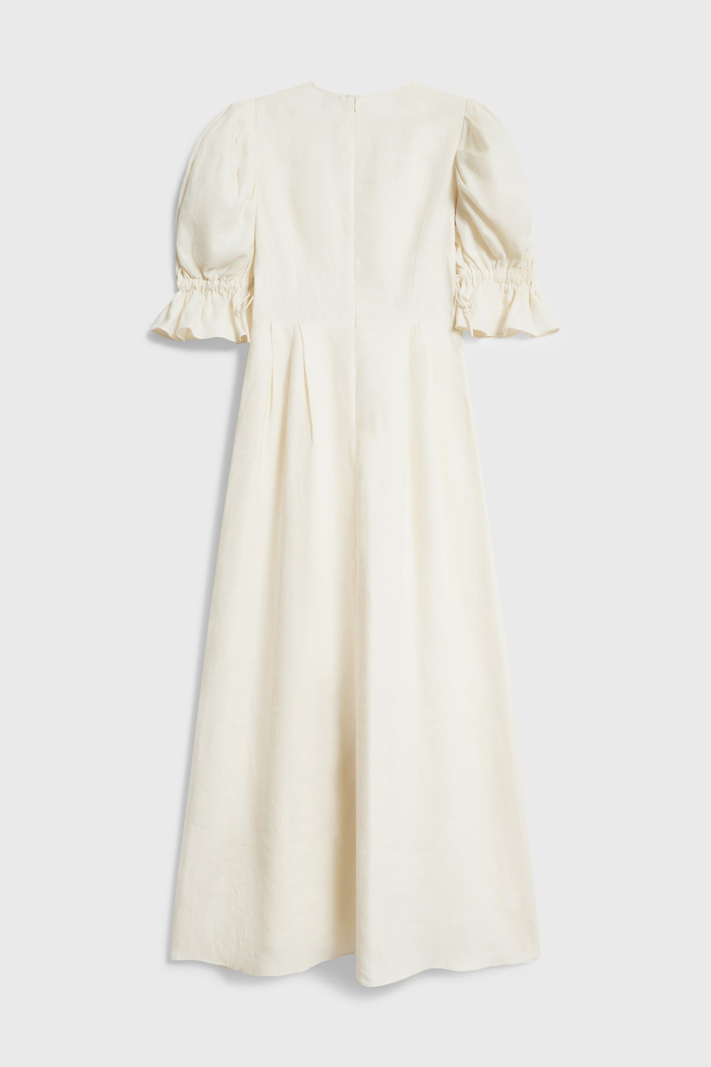 Calf-length, loose-fit dress in a linen weave with accent crochet-look trim. Short balloon sleeves with wide cuffs. Gathered seams at the waist and above the hem for added volume. Lined. A concealed zip and metal hook at the back.