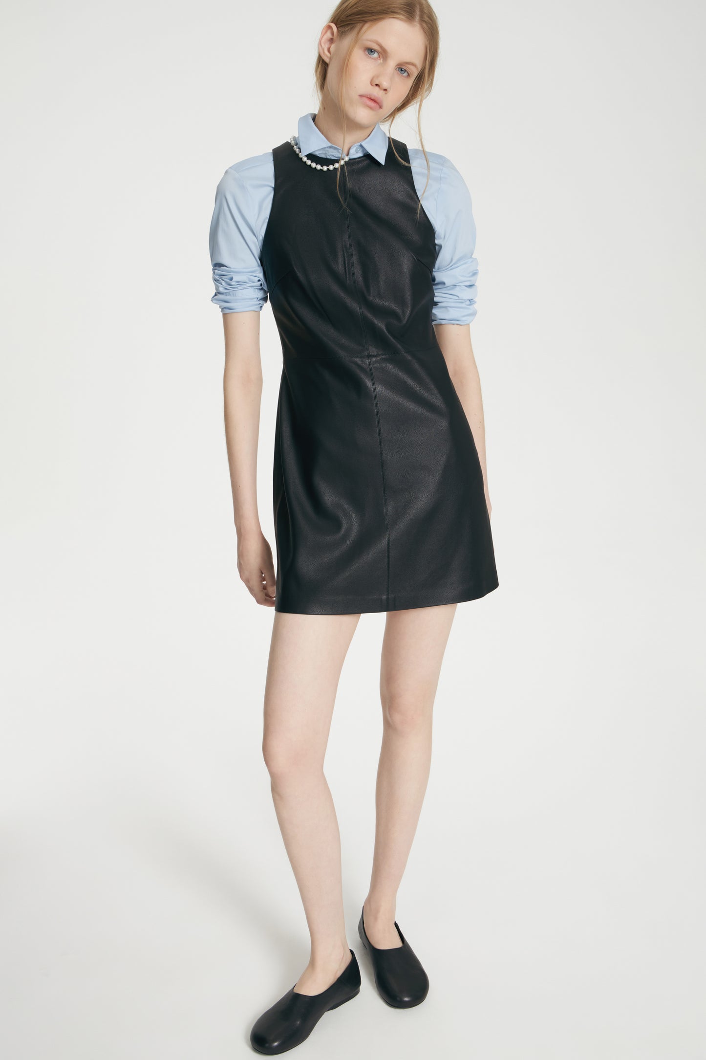 Short dress in faux leather fabric with visible seam details on the front and back. Featuring a round neck and exposed shoulders. Invisible back zip fastening.