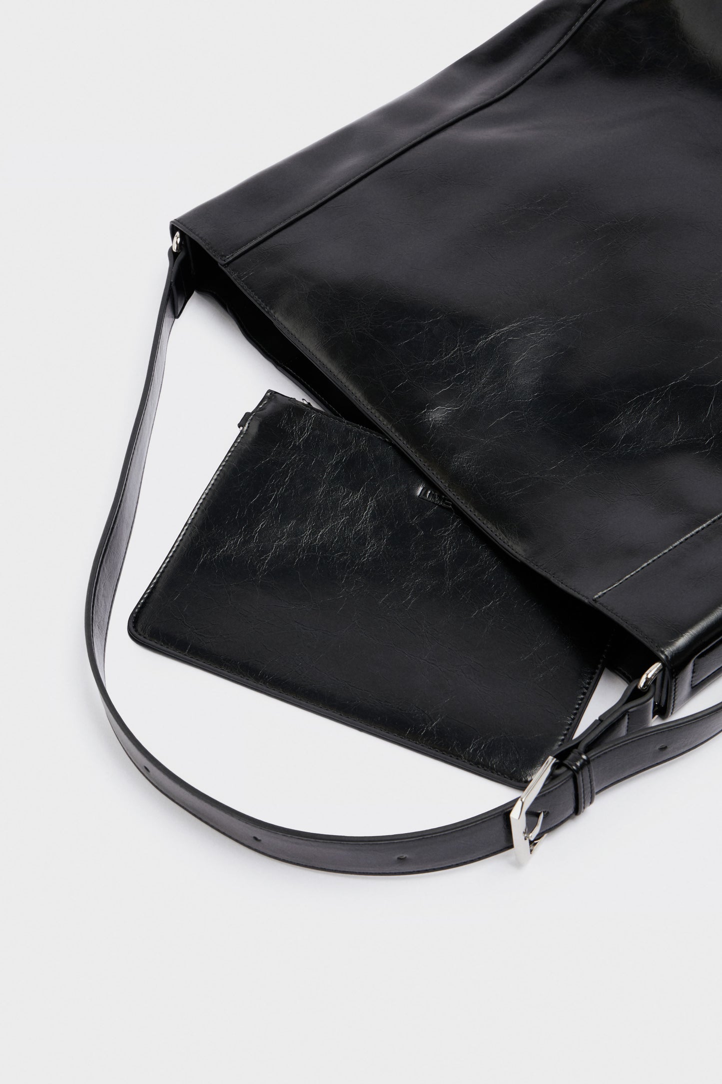 Faux patent leather bucket bag. Minimalist style. Shoulder strap. Interior zip pocket. Magnetic button closure. Size: 33 х 12 х 37 cm (length х width х height).
