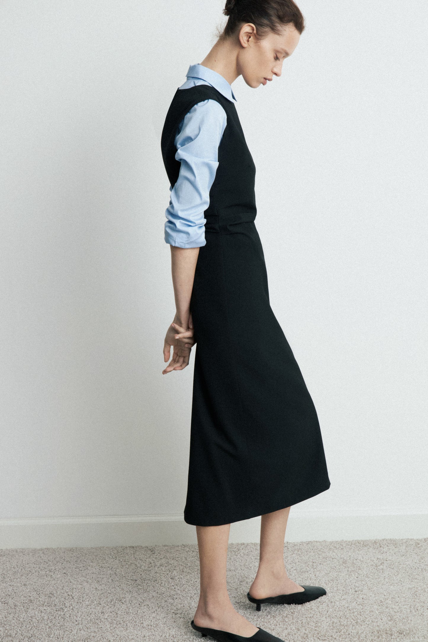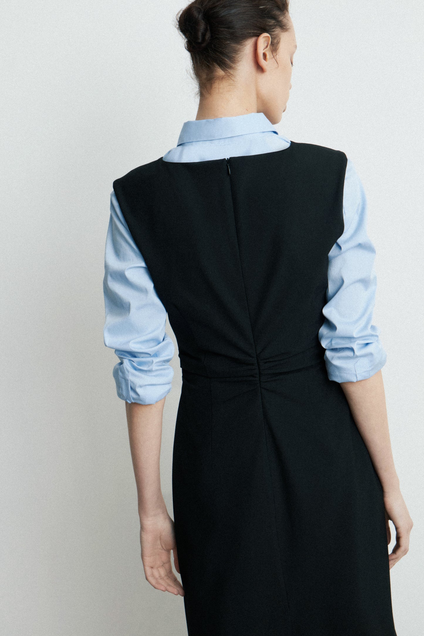 Fitted midi dress in thick suit weave. Concealed zipper at back. Gathers at waist for a flattering silhouette. Partly lining.