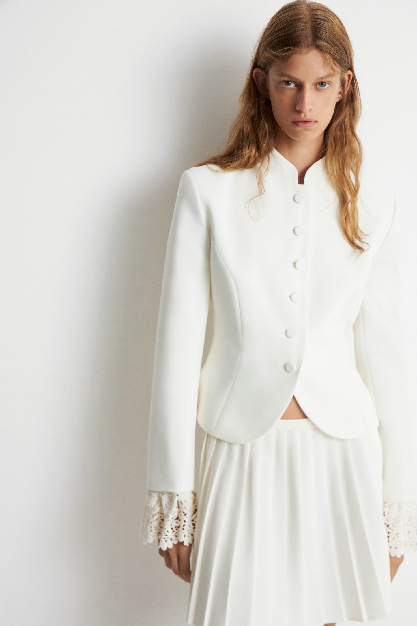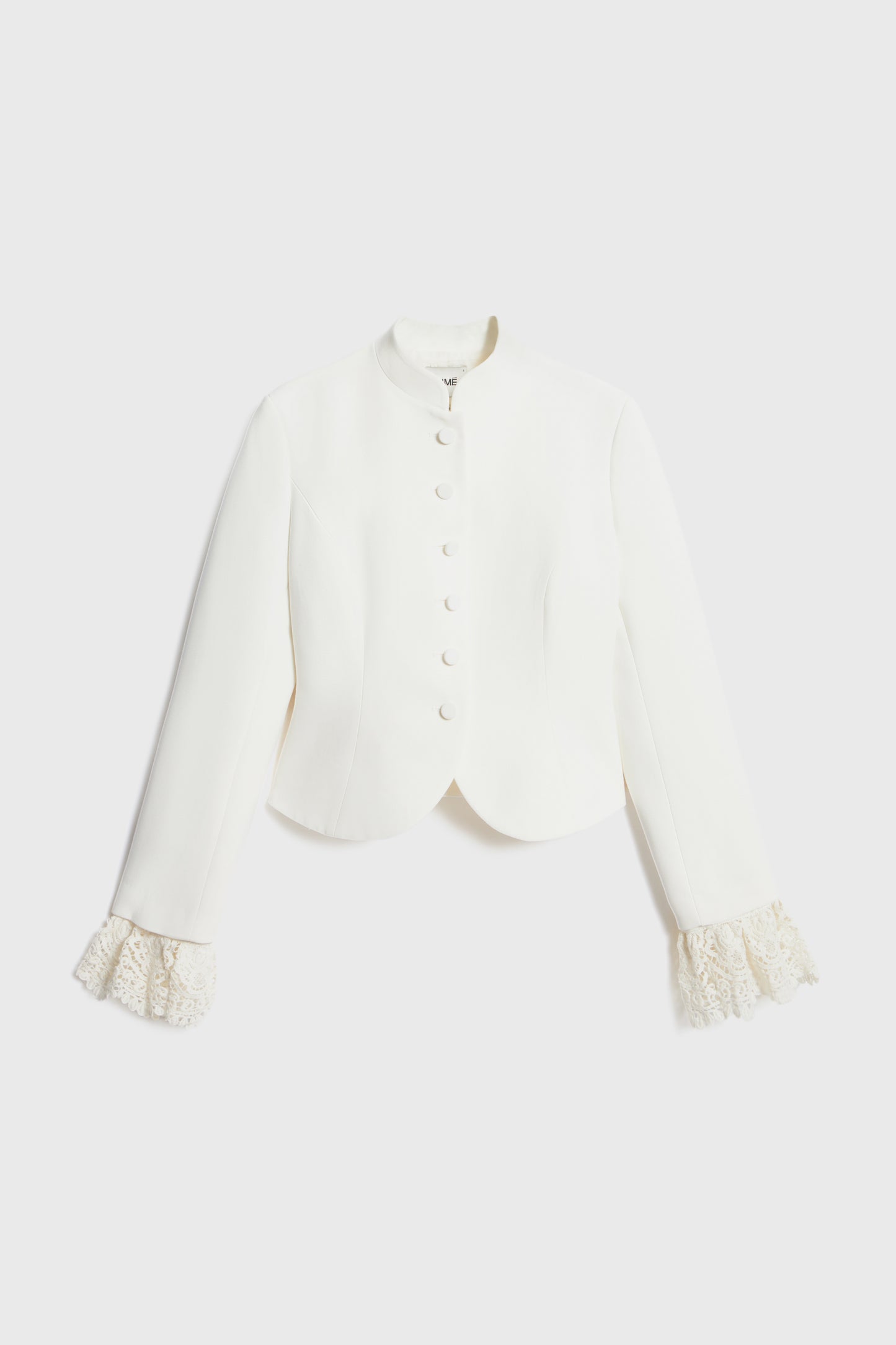 Retro-inspired, fitted blazer in woven fabric. Stand-up collar, covered buttons at front, and shoulder straps. Long sleeves with ruffe-trimmed cuffs in lace. Lined.