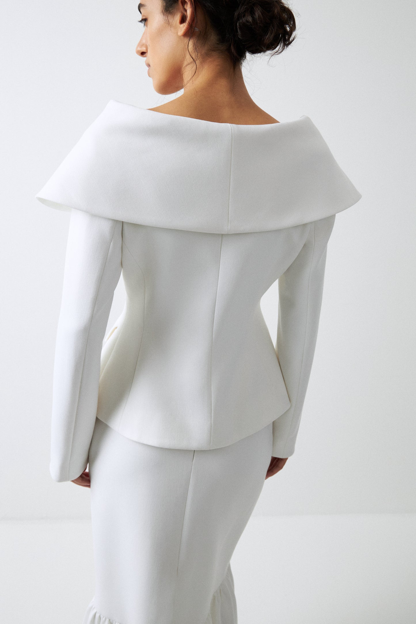 Fitted blazer with foldover top edge and a single-breasted front with covered buttons. Shaping darts on the front and back. Long sleeves, shoulder pads. Front flap pockets. Made of woven fabric containing some lyocell and wool. Lined.