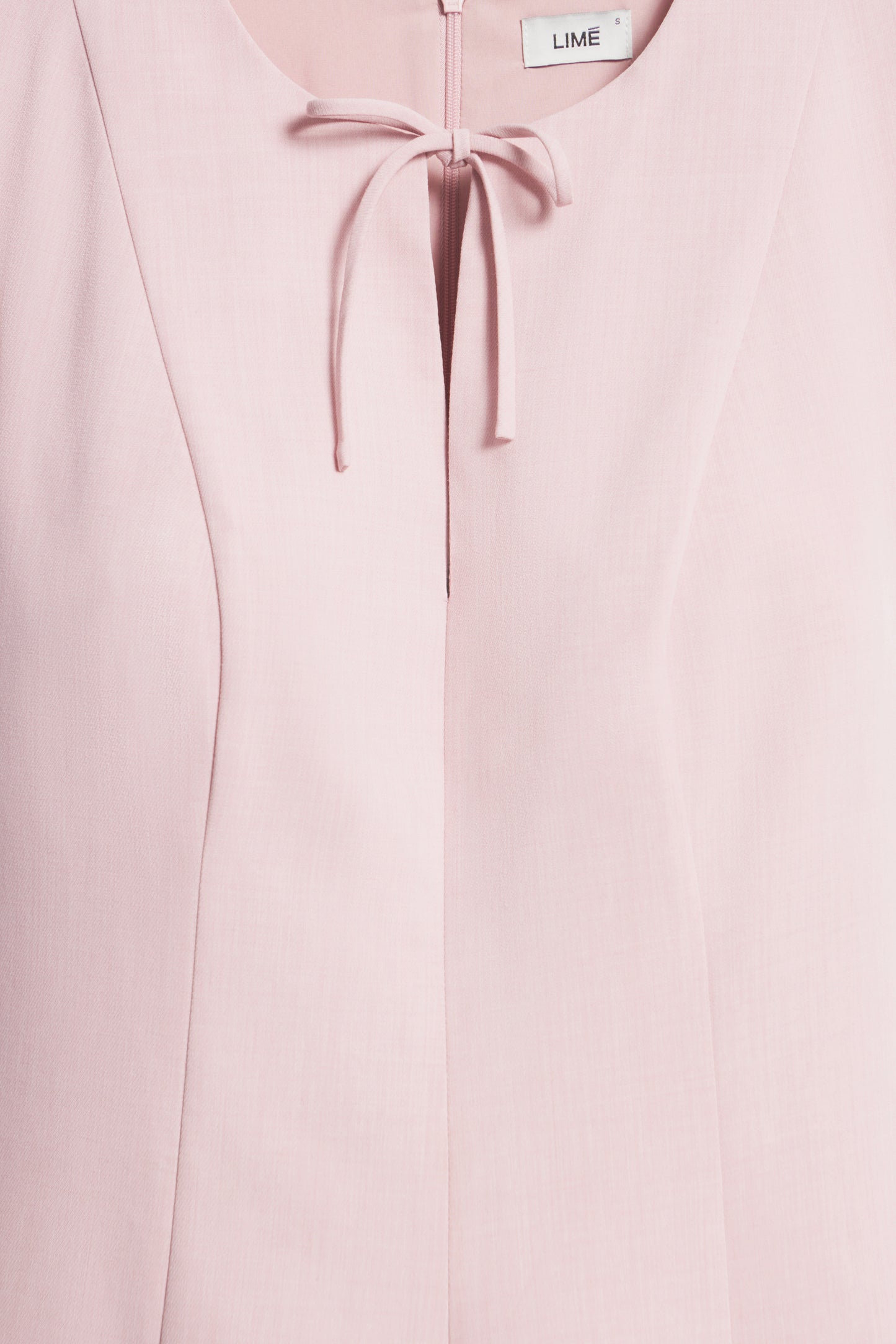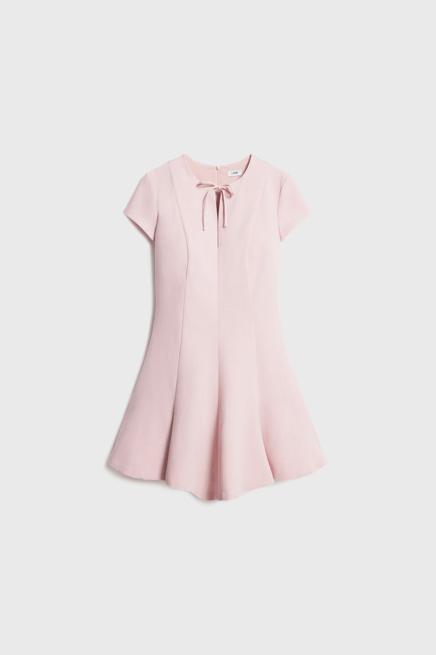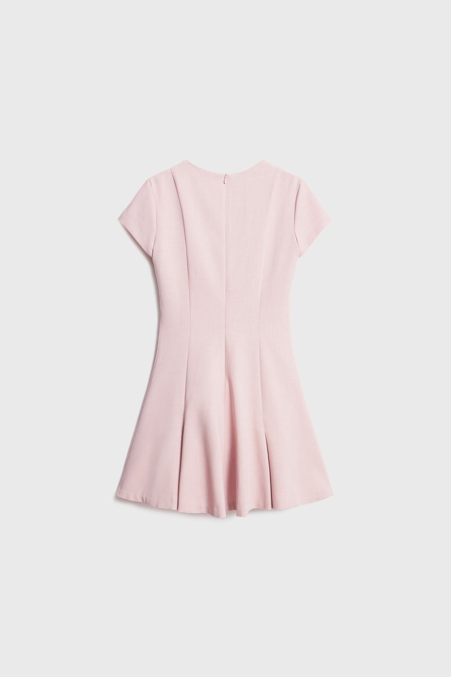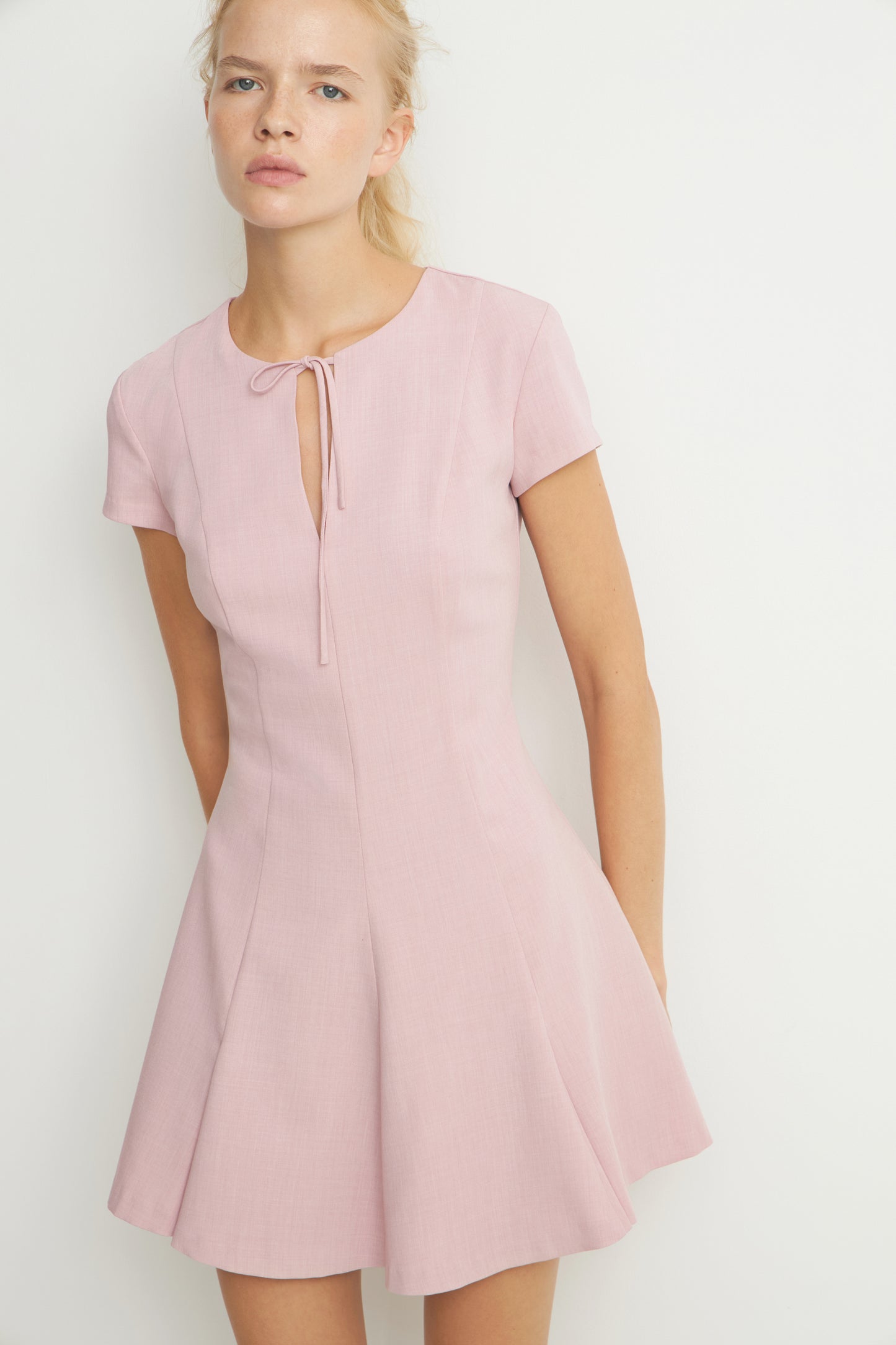 Short dress with flared hem. Fitted bodice with visible princess seams throughout the design. Round neckline with narrow ties, short cap sleeves and zip at the back. Lined.