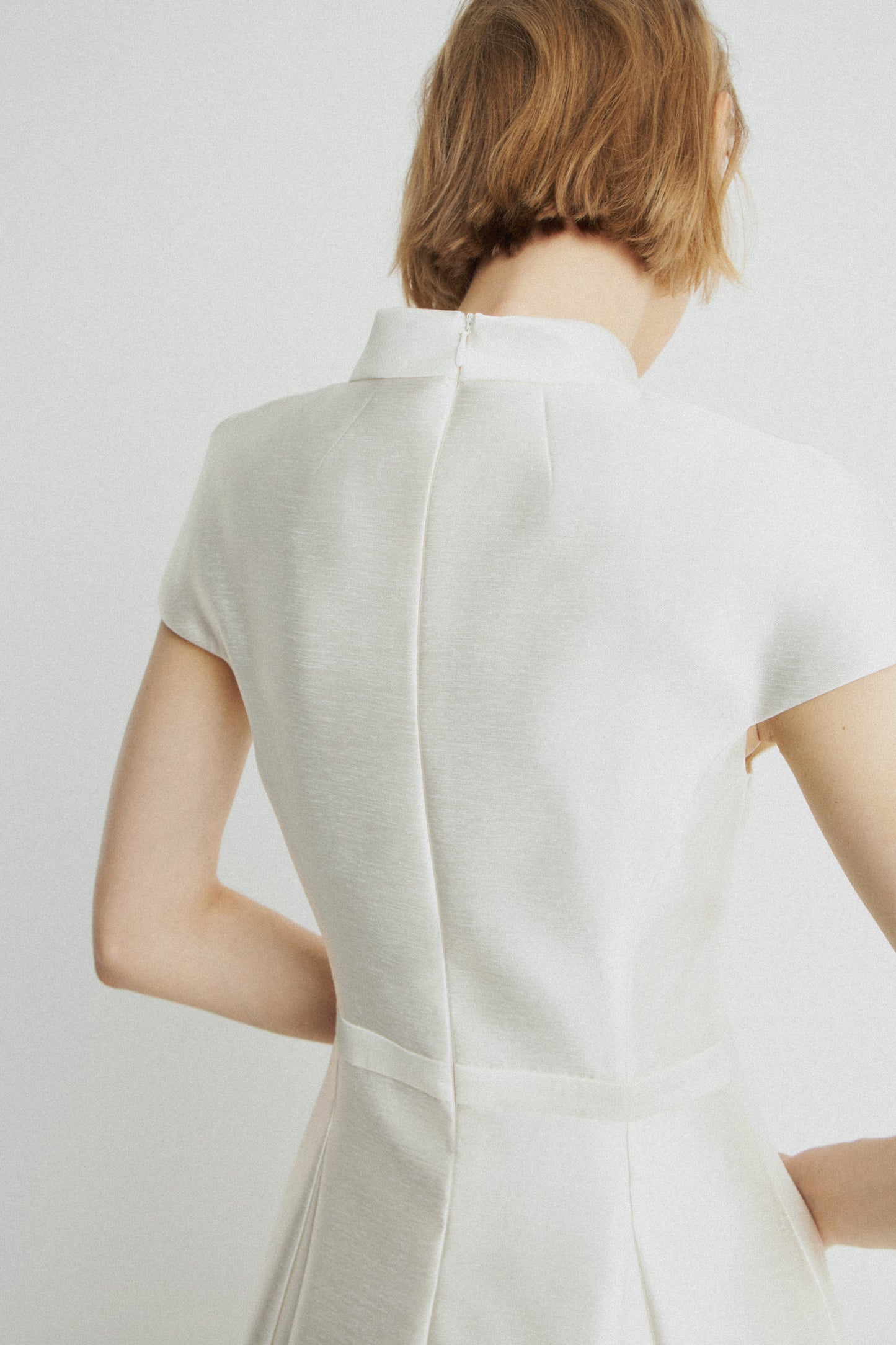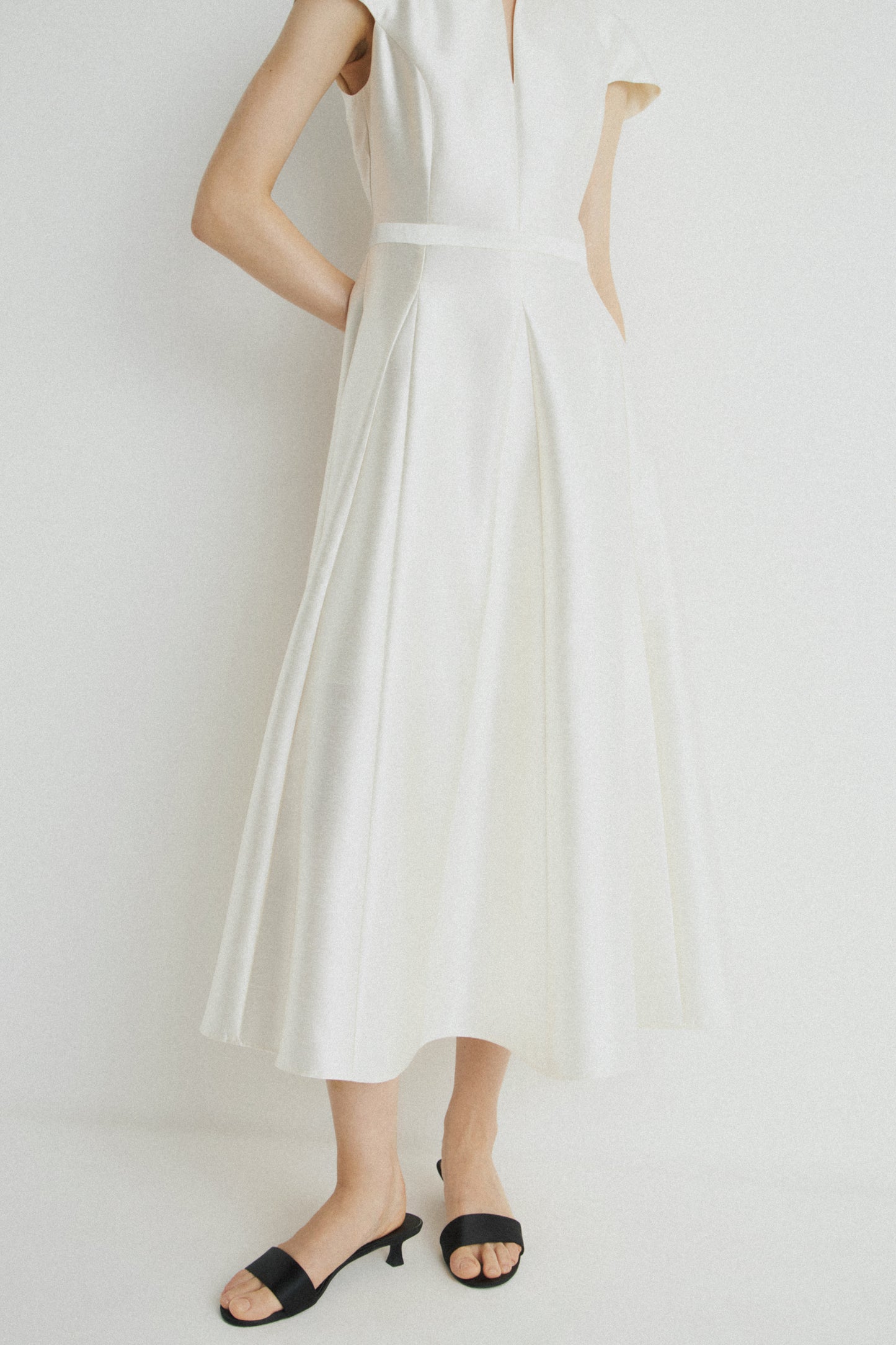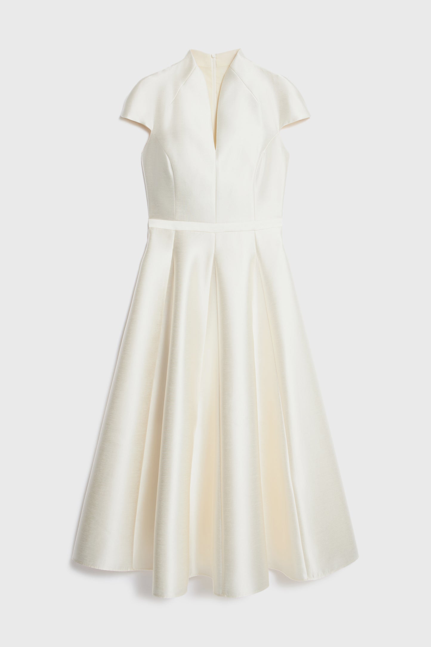 Calf-length dress in satin viscose blend. A fitted bodice with flared skirt and mixed neckline, high at the back and V-cut on the front. Lined. A concealed zip at the back.