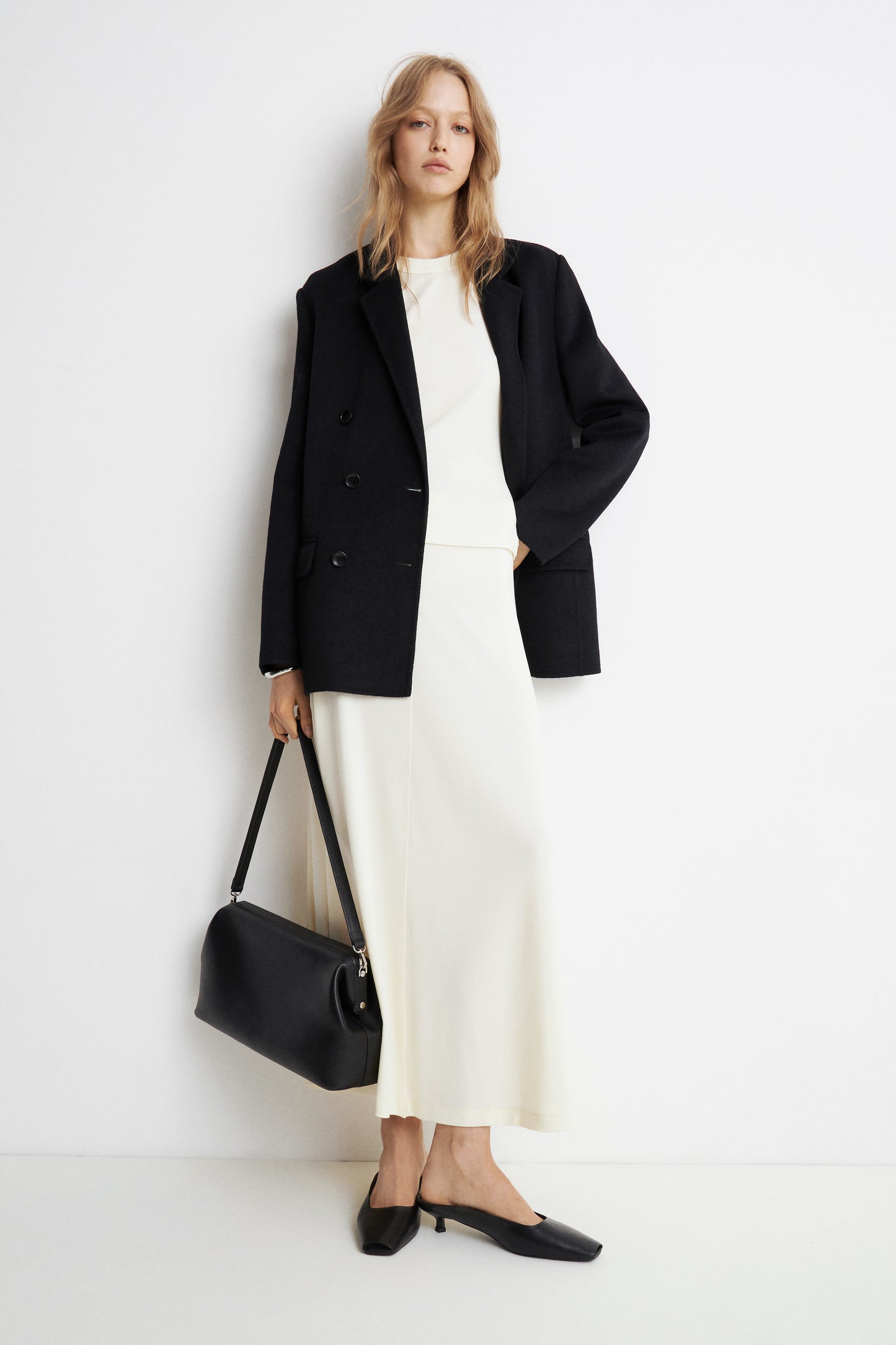 Long, A-line skirt in soft viscose with stretch. A concealed zip and two inner buttons at the back.