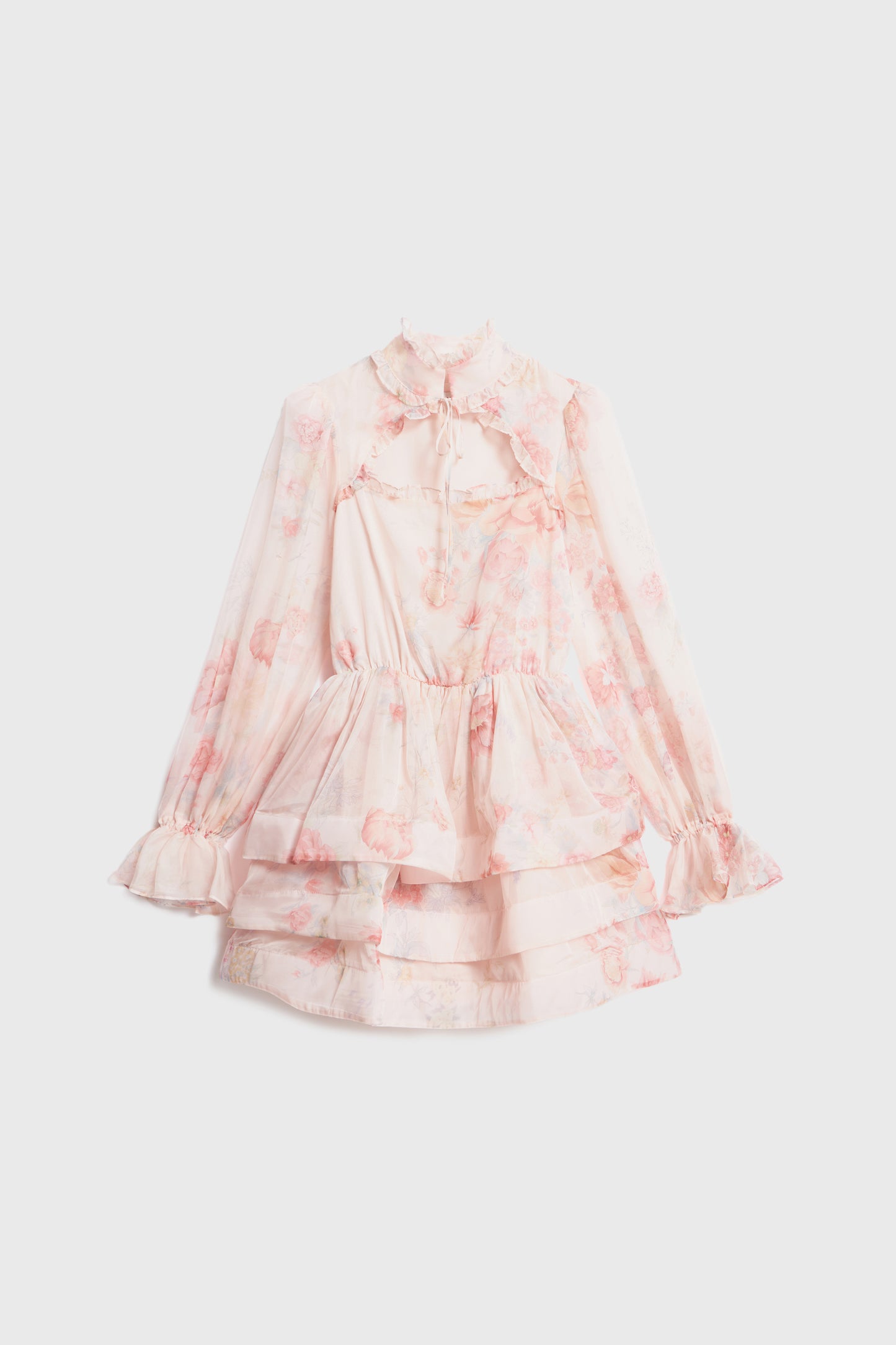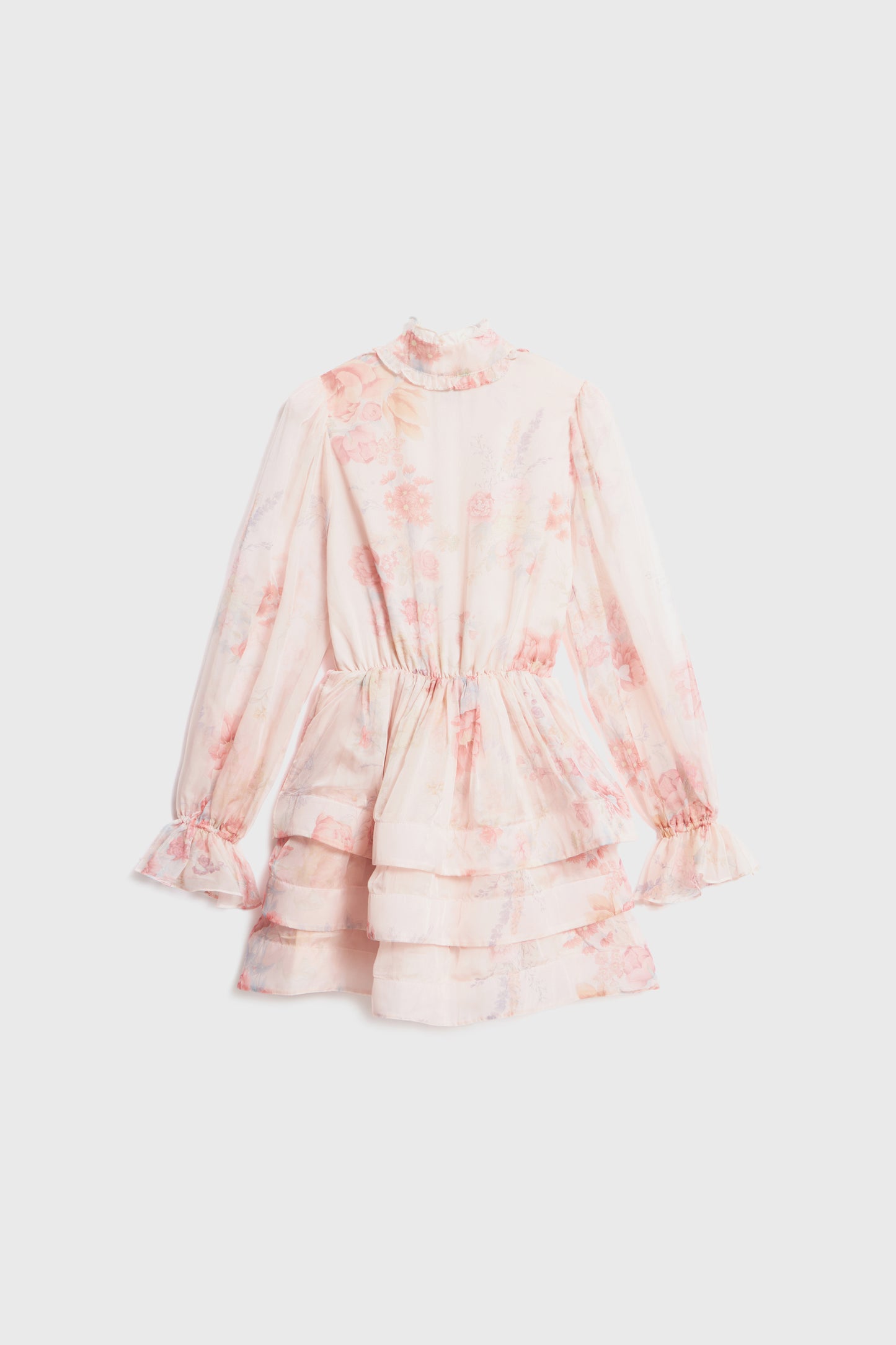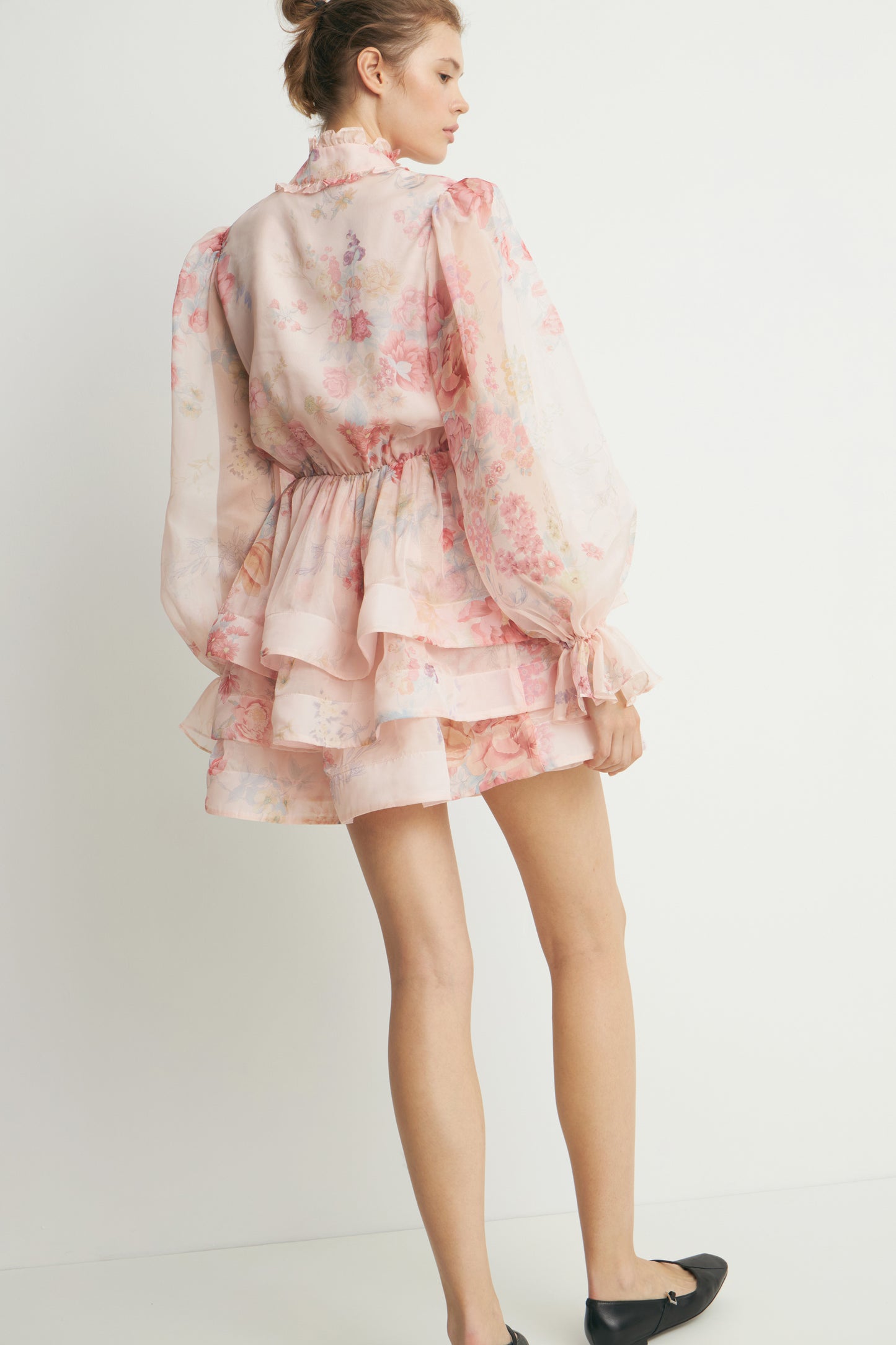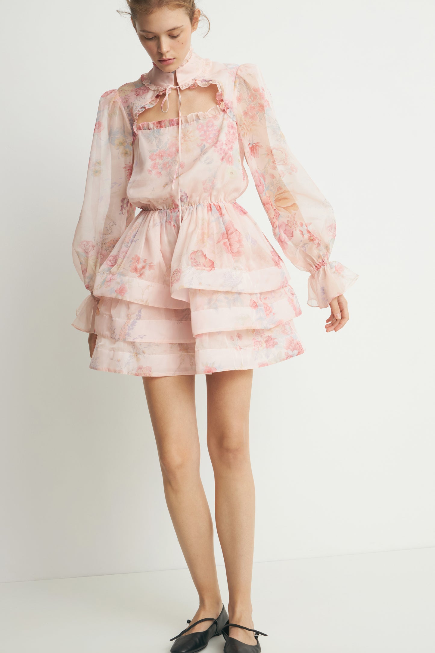 Short dress with a fitted bodice and a tiered skirt. Gathered seam at the waist. Features a band collar, opening at front, balloon sleeves with elasticized cuffs, and small ruffle trim. Matching lining.