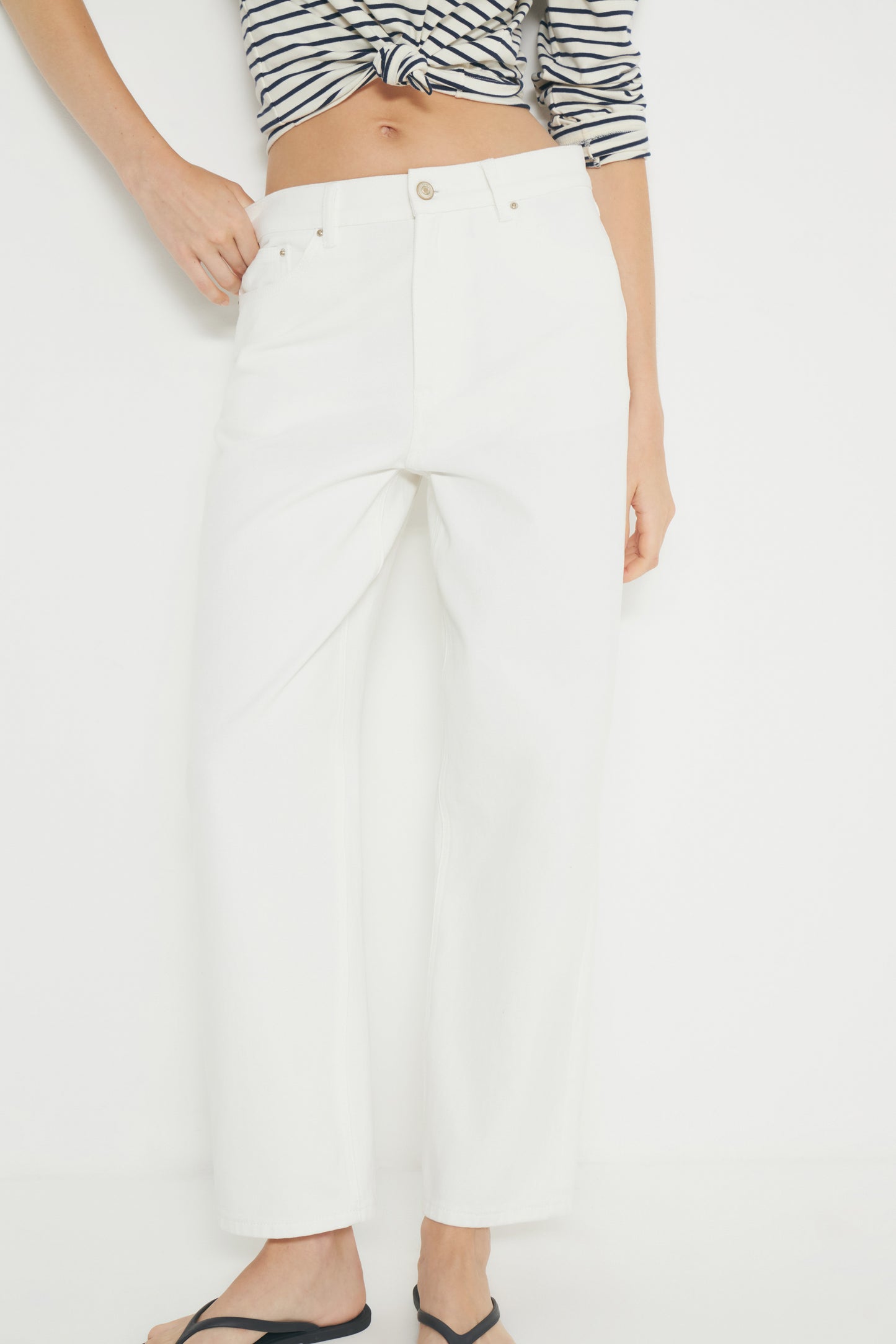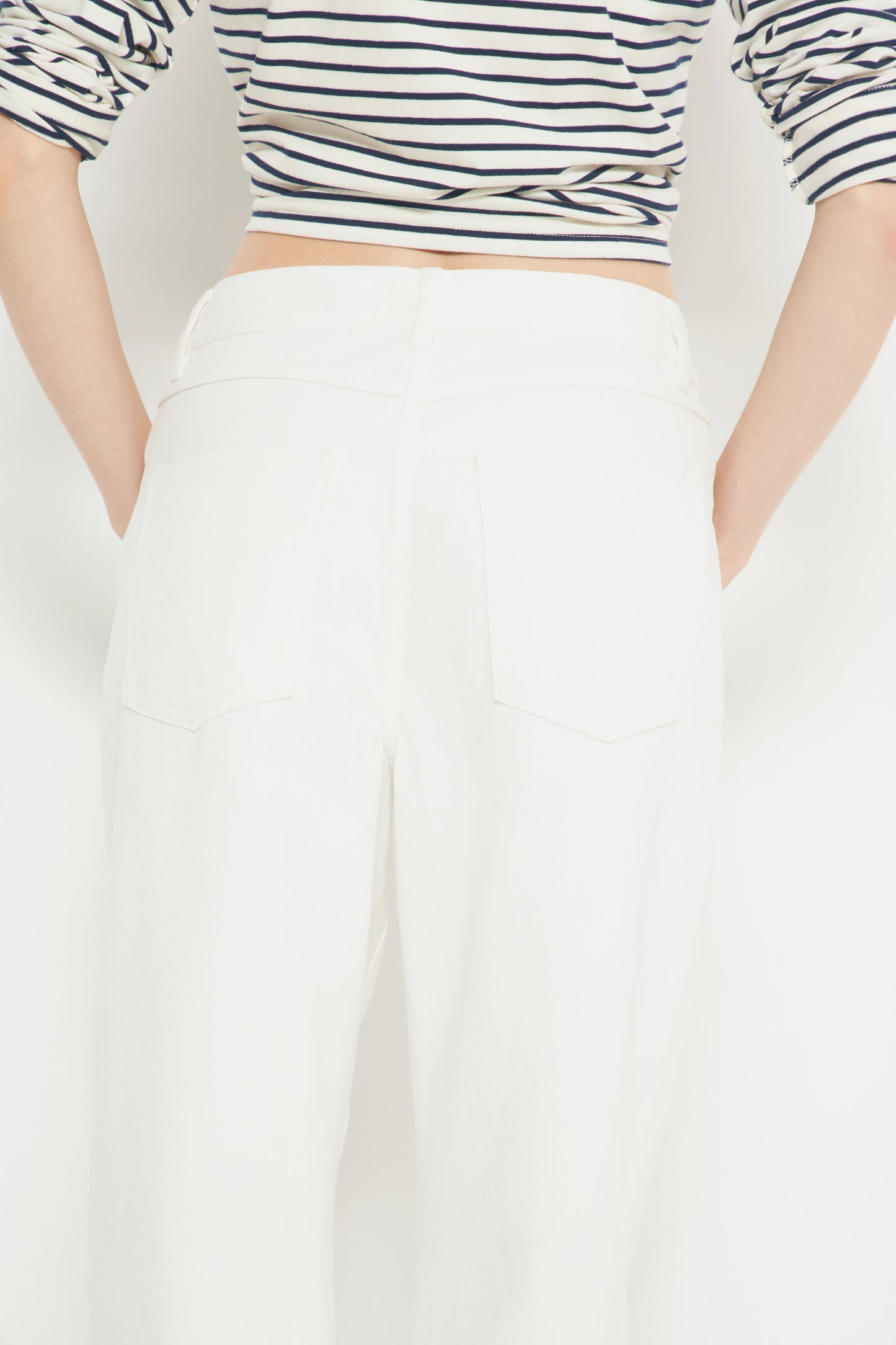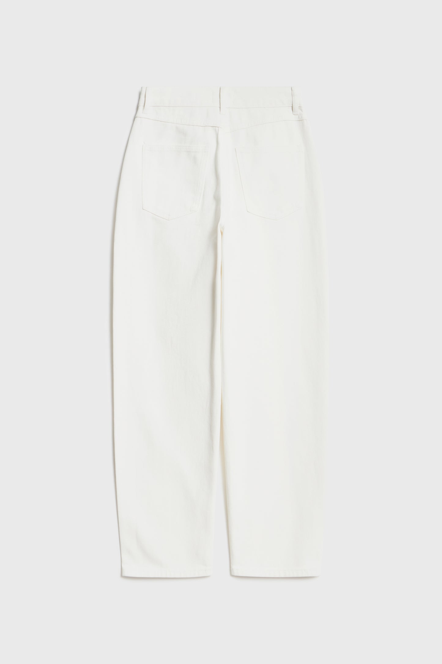 New style of classic mom-fit jeans cut. Staple with high-rise, slightly tapered hems, and five-pocket design. Crafted from cotton denim. Zip fly and metal top button fastening.