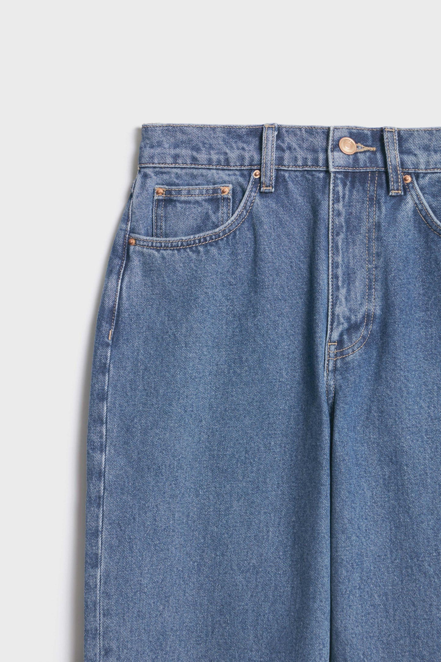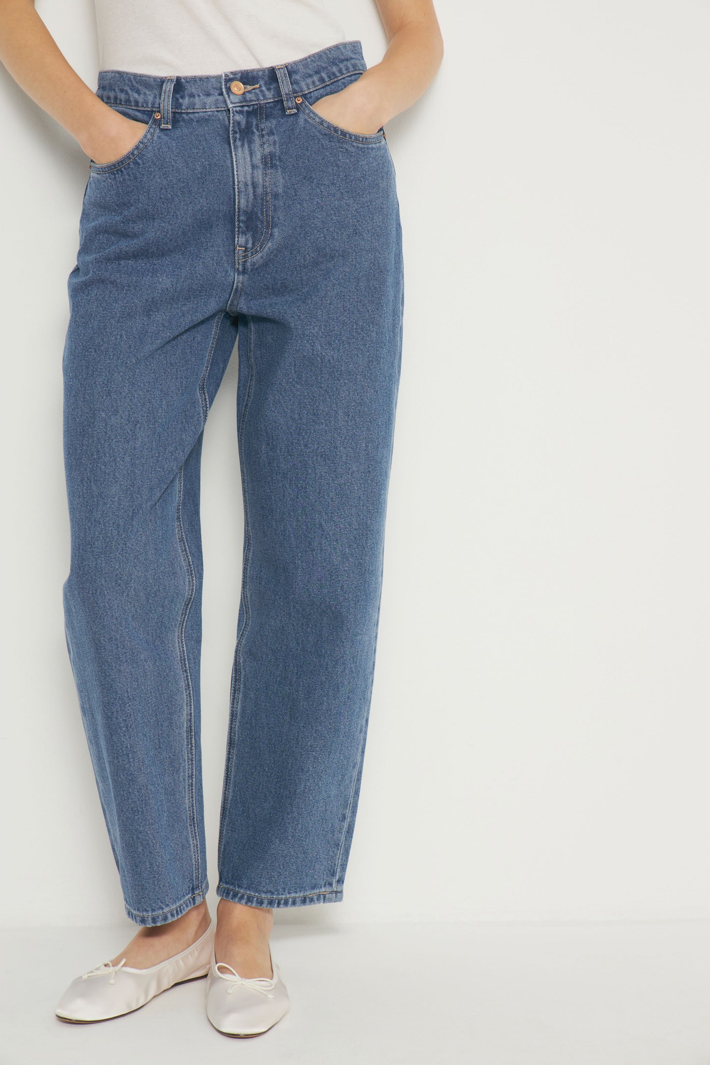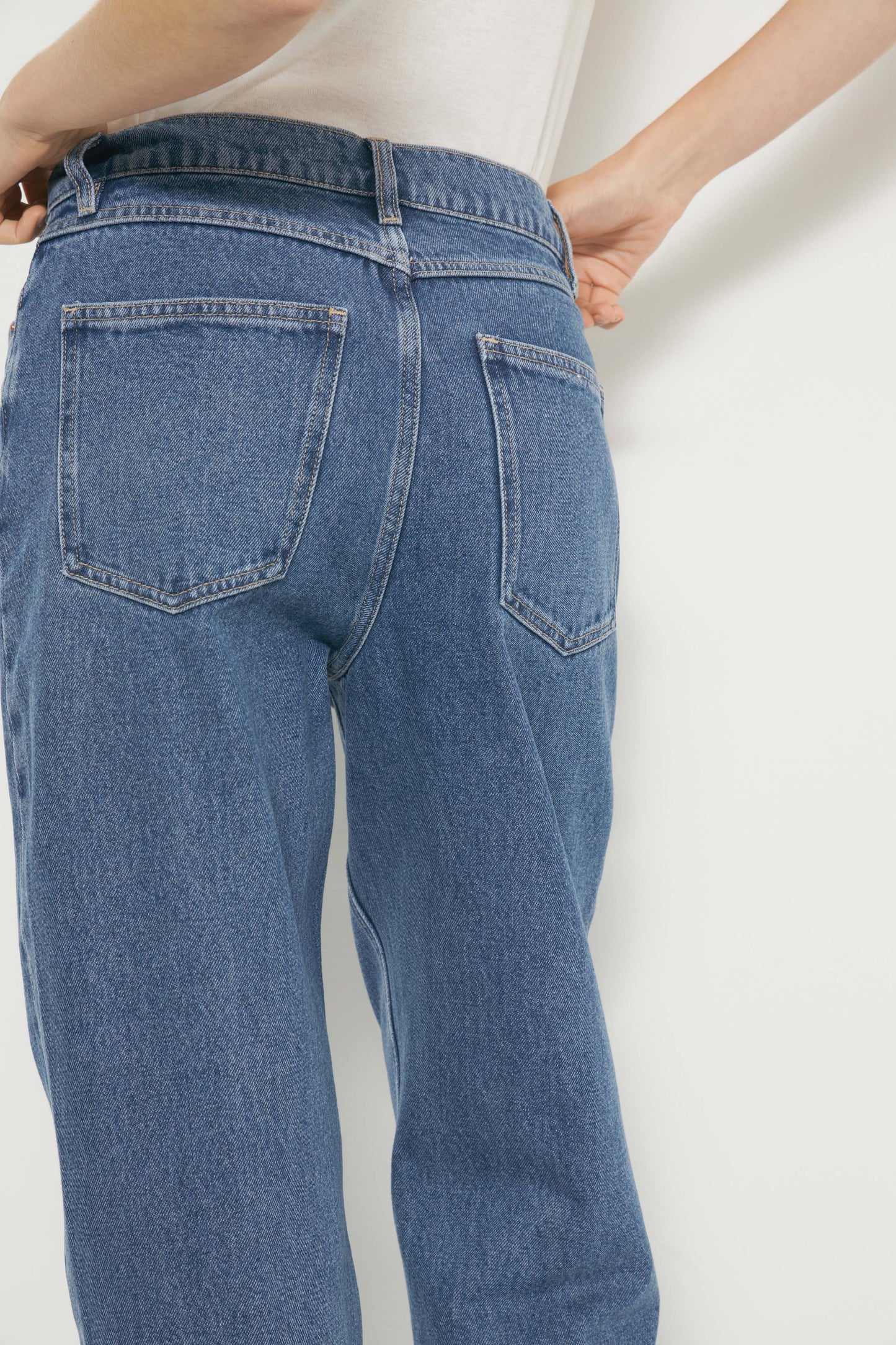 New style of classic mom-fit jeans cut. Staple with high-rise, slightly tapered hems, and five-pocket design. Crafted from cotton denim with faded effect. Zip fly and metal top button fastening.