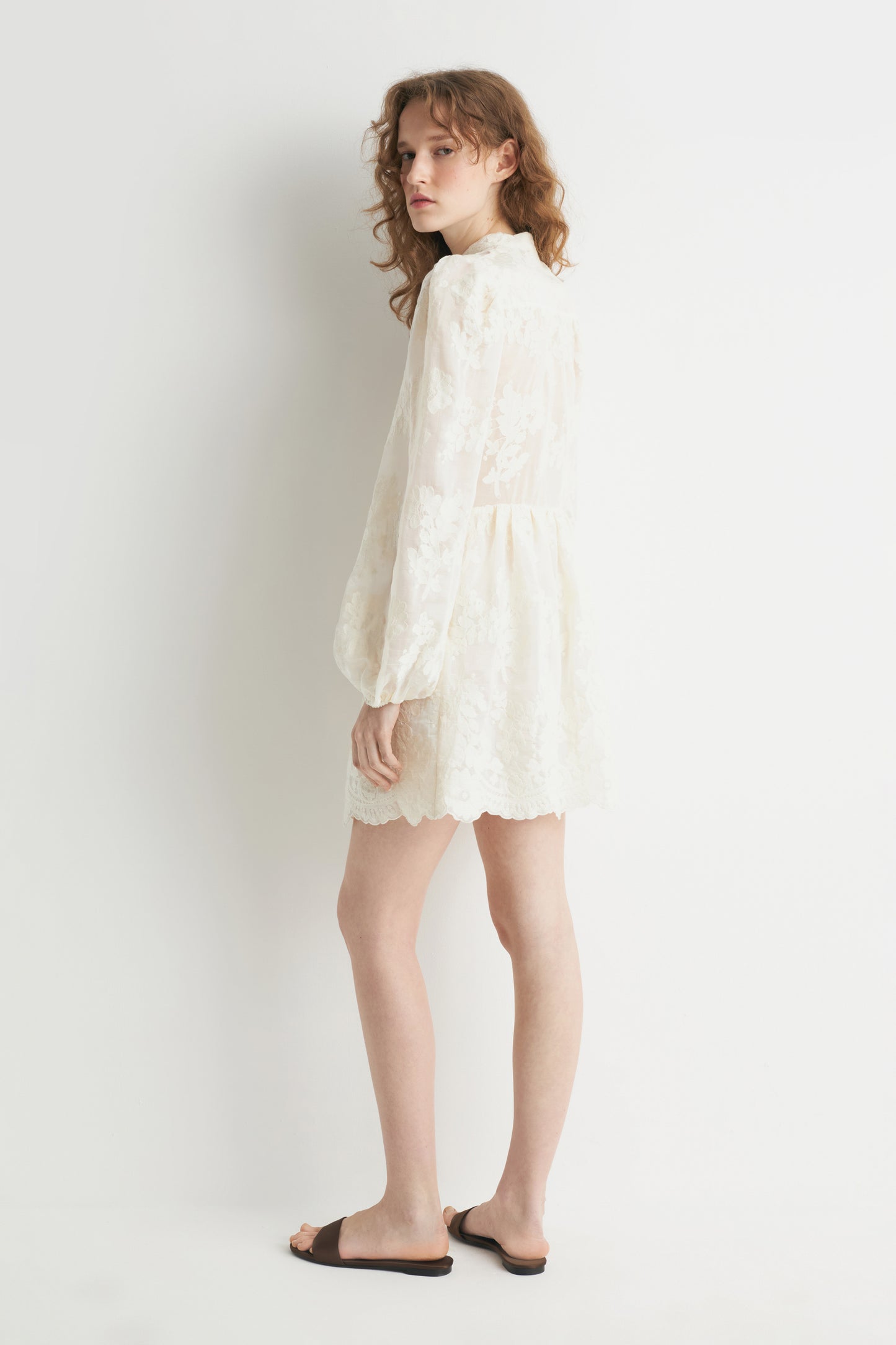 Easy-to-wear dress in a jacquard lyocell weave with a band collar, covered buttons and long balloon sleeves. Flared skirt with scalloped hem. Lined. Hidden zip closure at side.