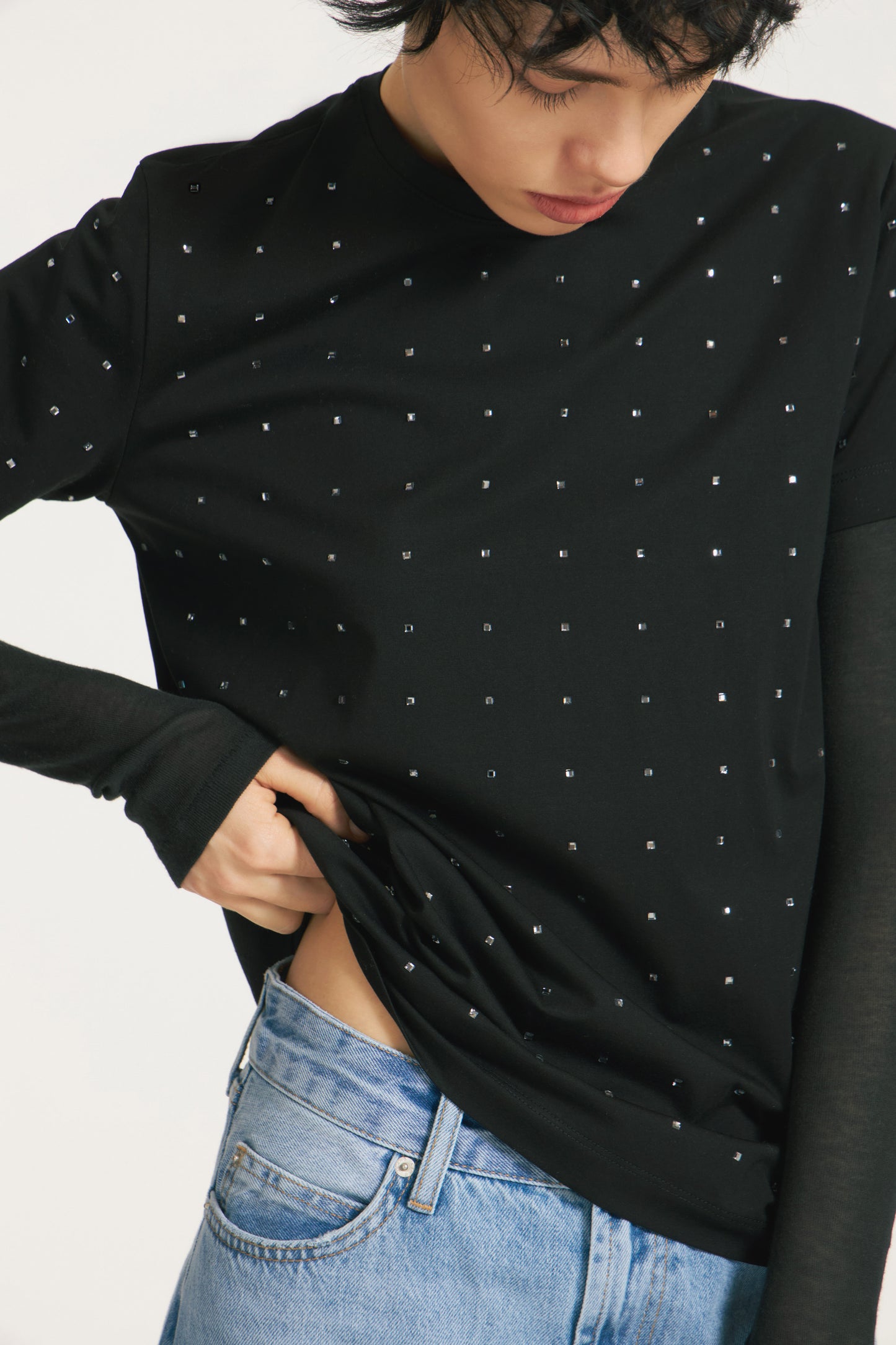 Round neck T-shirt in cotton blend fabric with short sleeves. Rhinestone appliqué details.