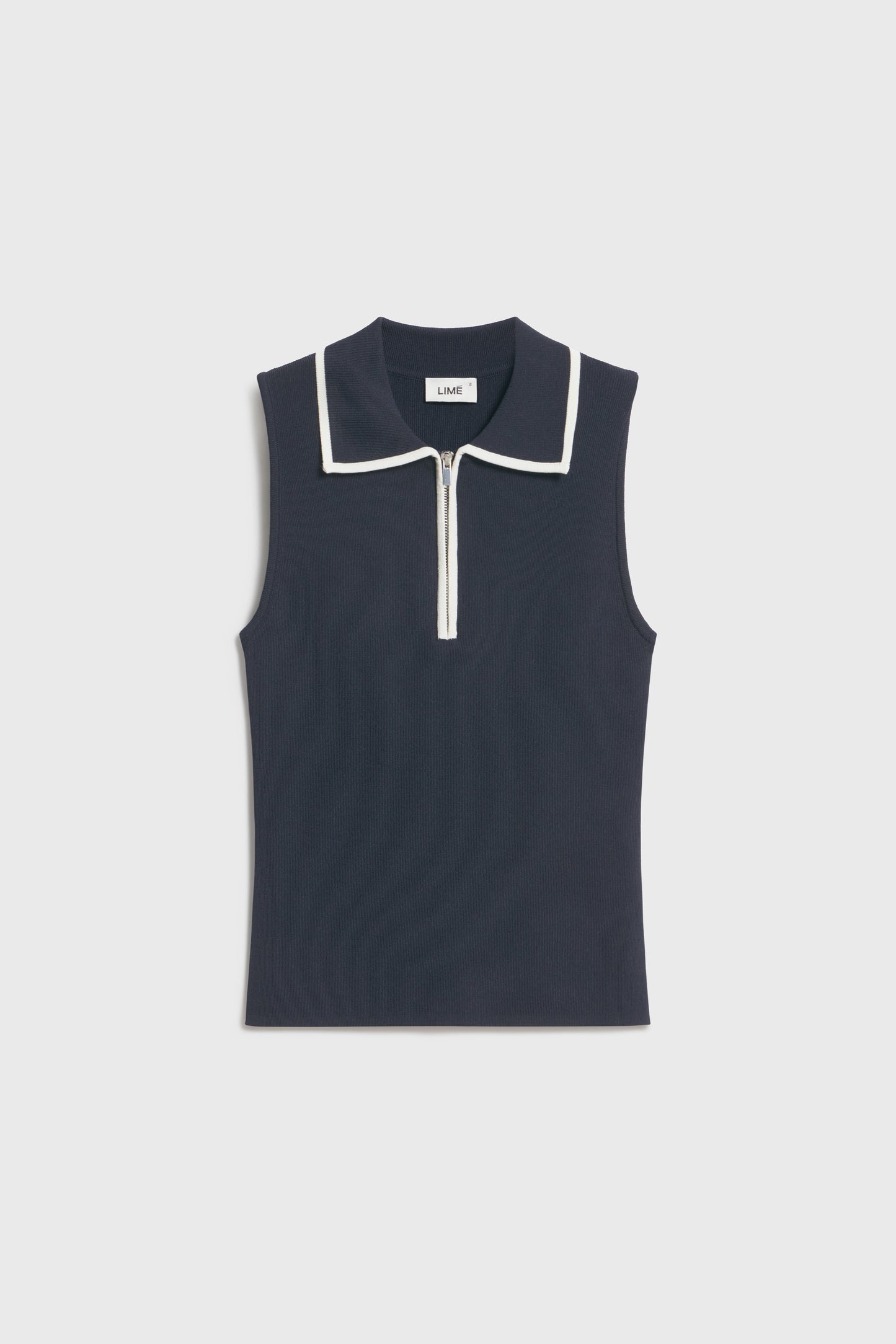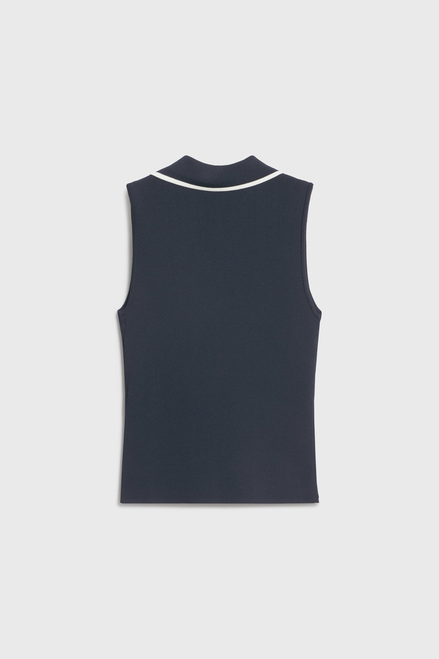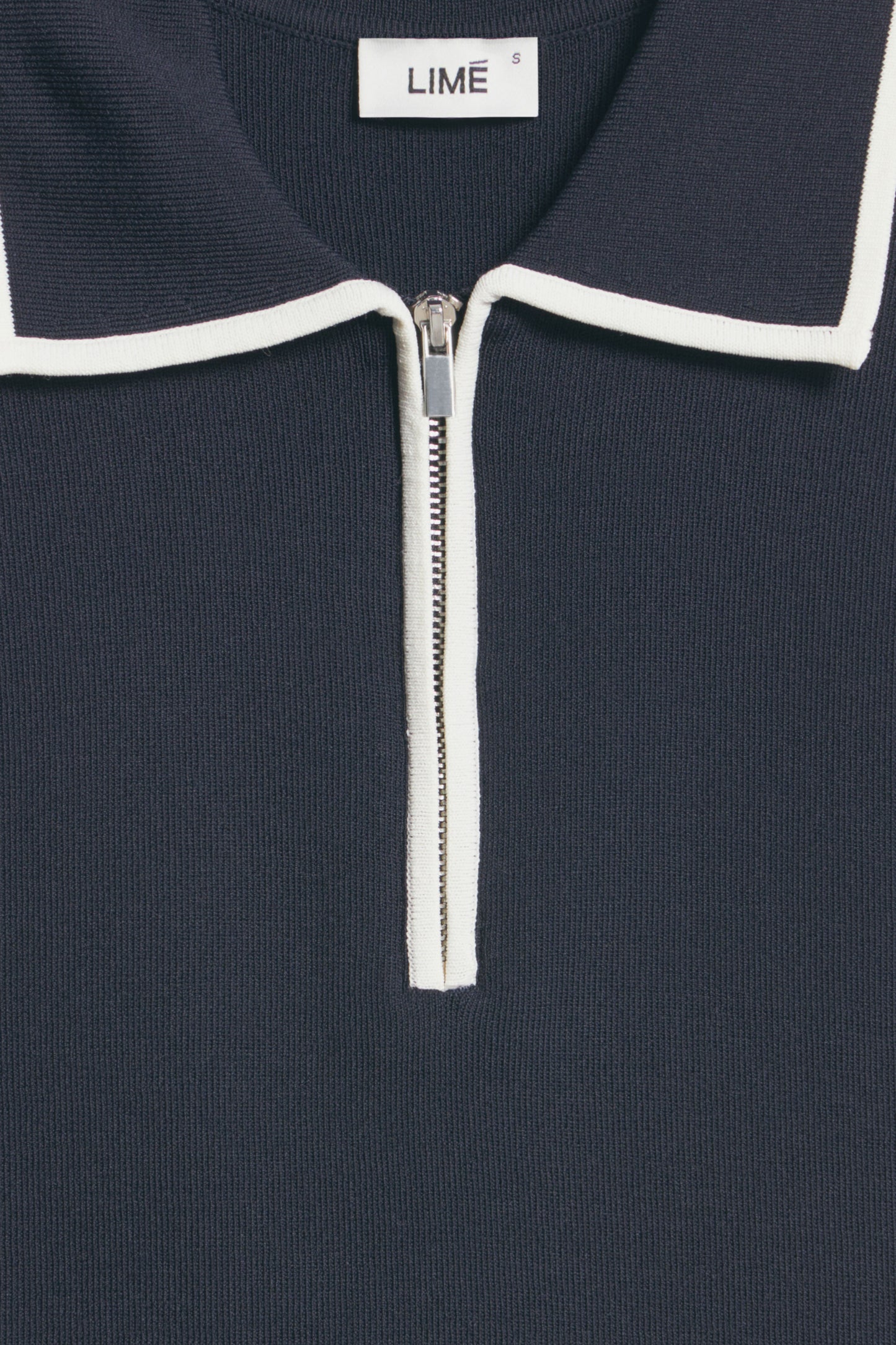 Slim-fit polo top in fine-knit viscose blend that hugs contours of the body for a fitted silhouette. Collar, half-zip, and contrasting trim.