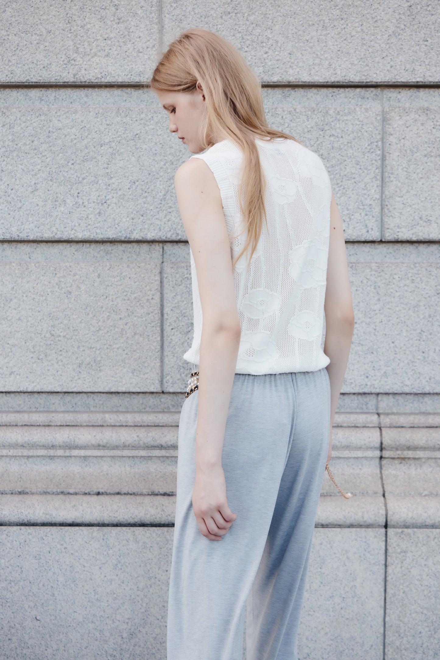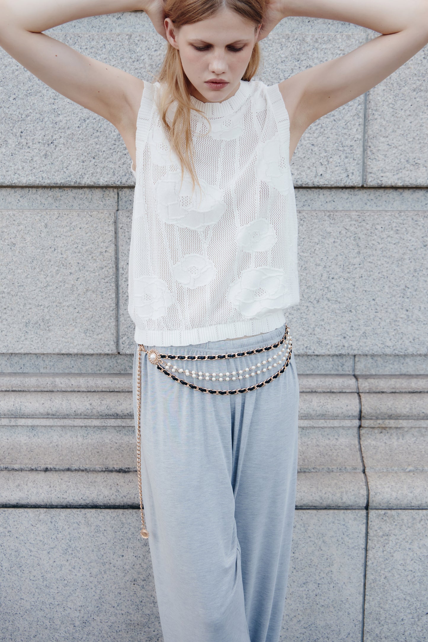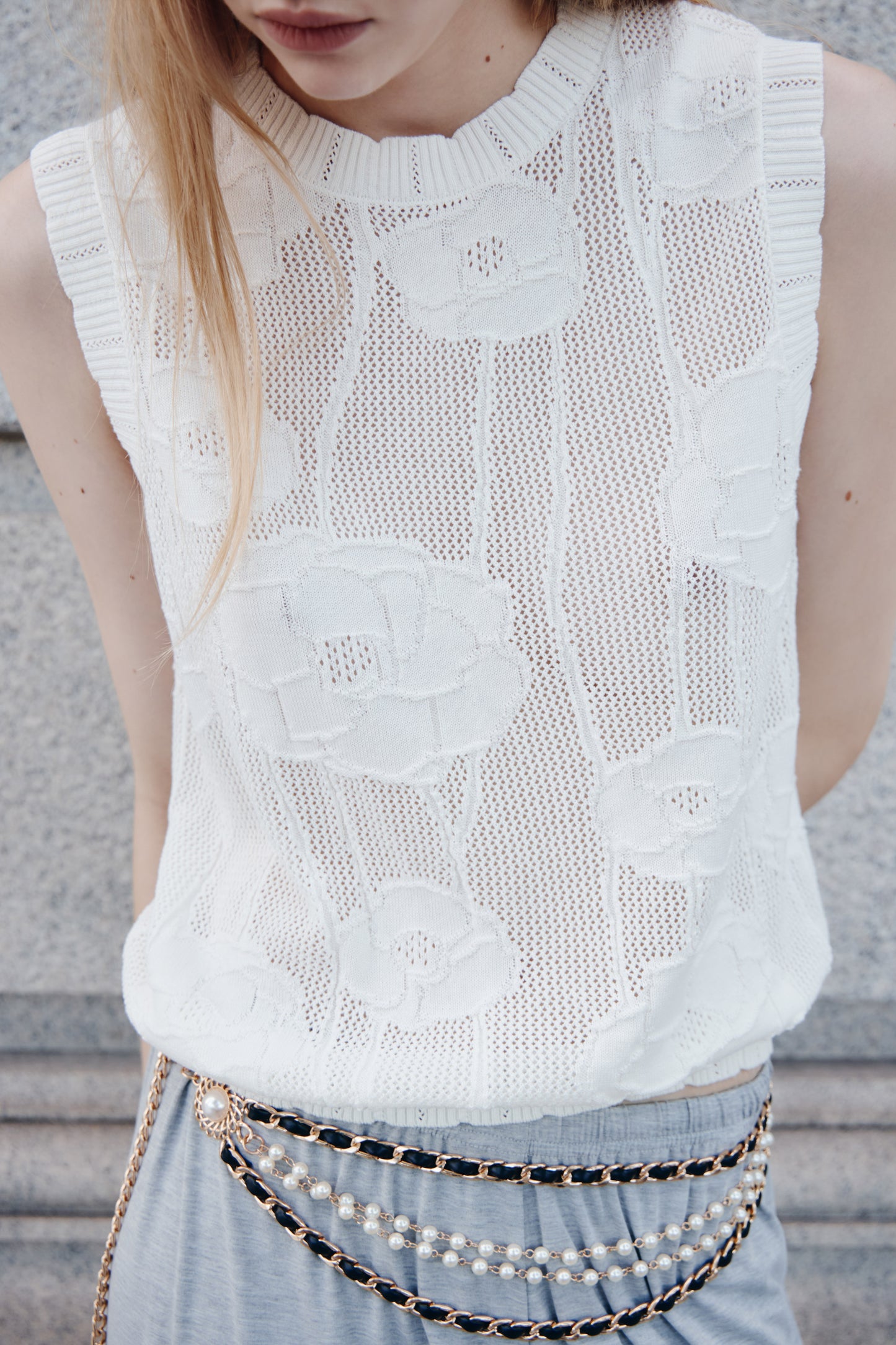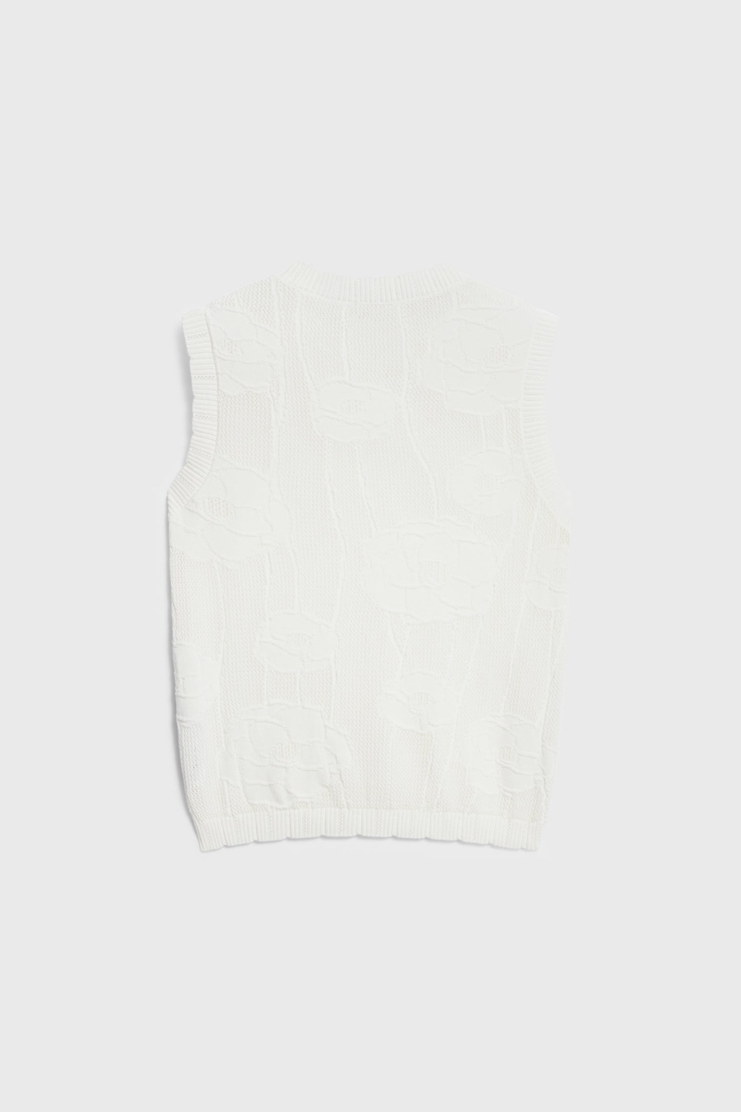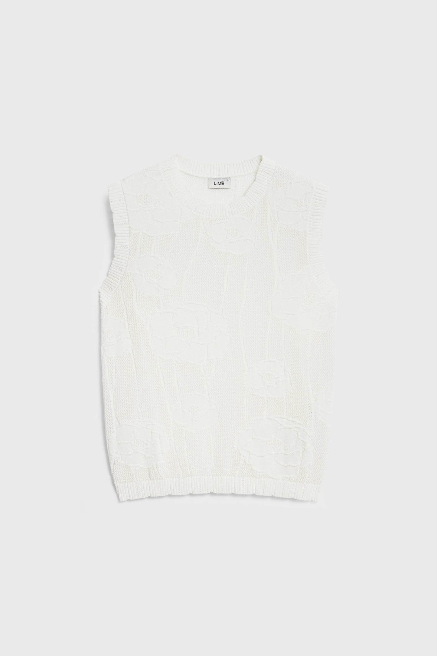 Fitted top in a soft, hole knit made from a lyocell and cotton blend. Jacquard floral pattern. Round neckline and scalloped edges.