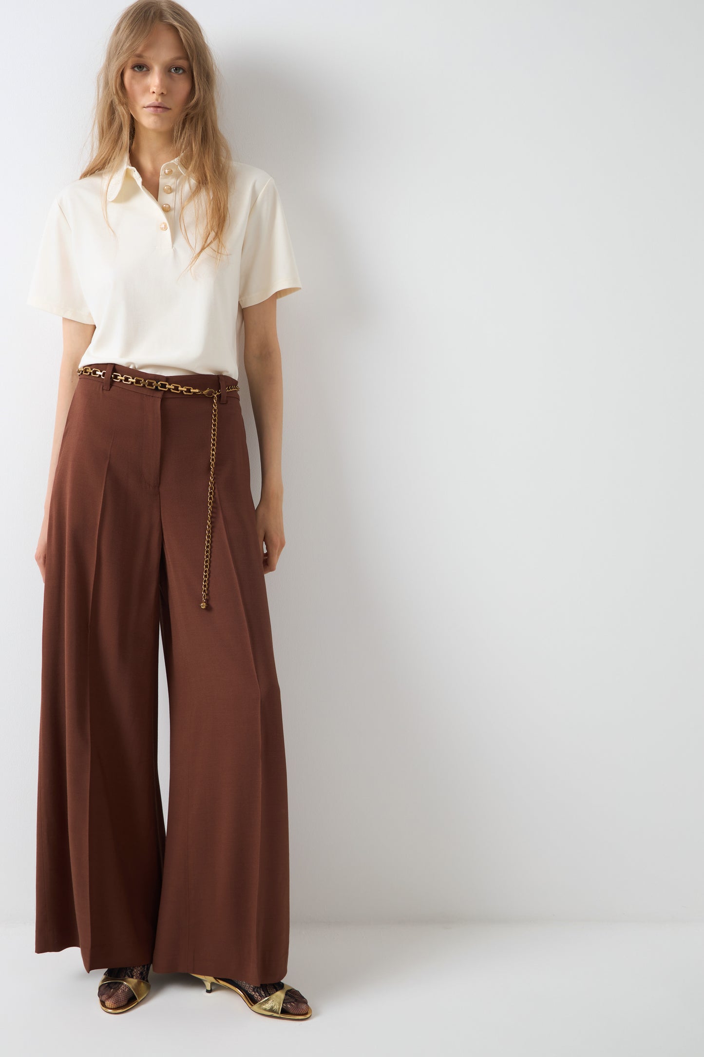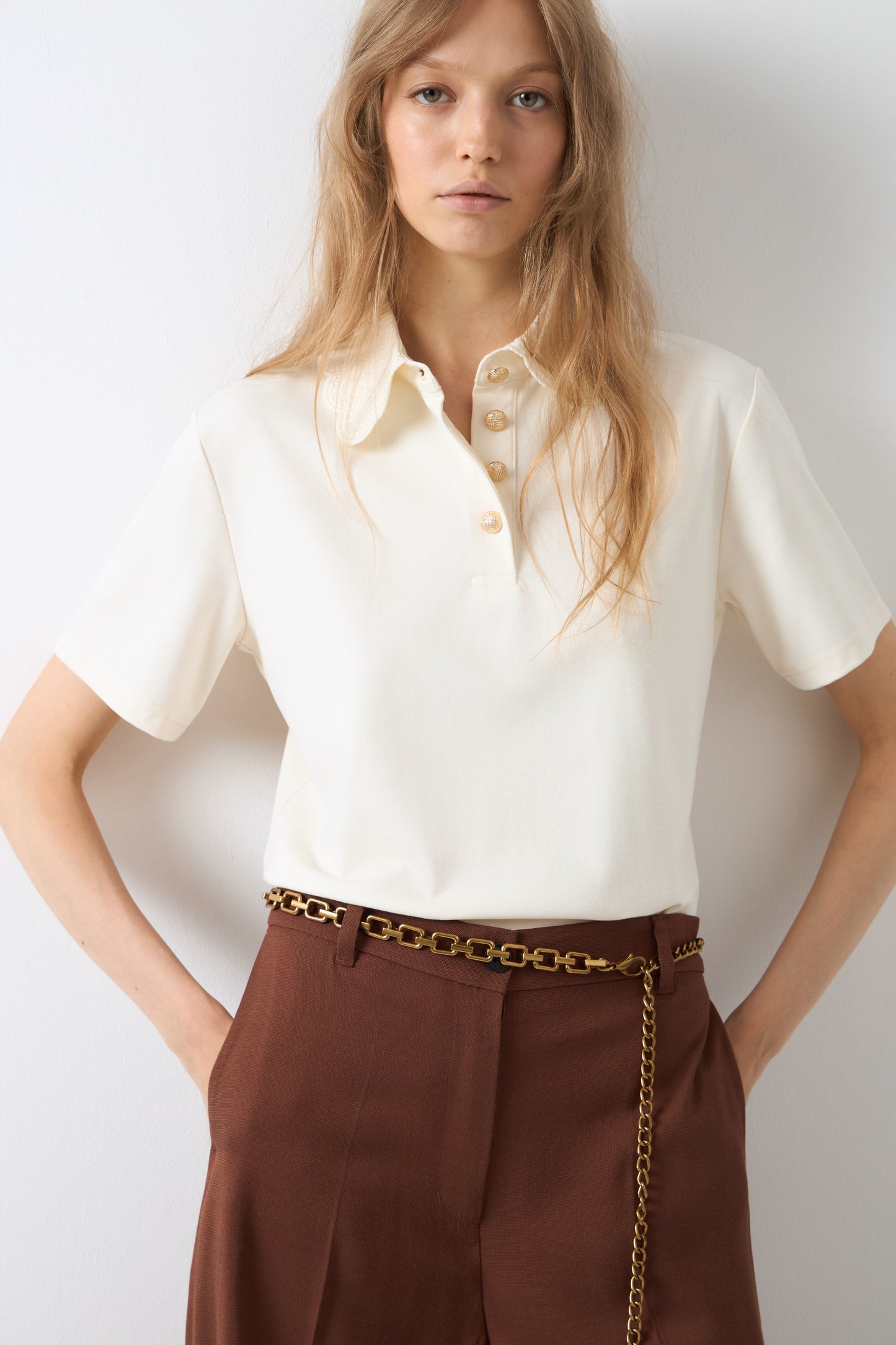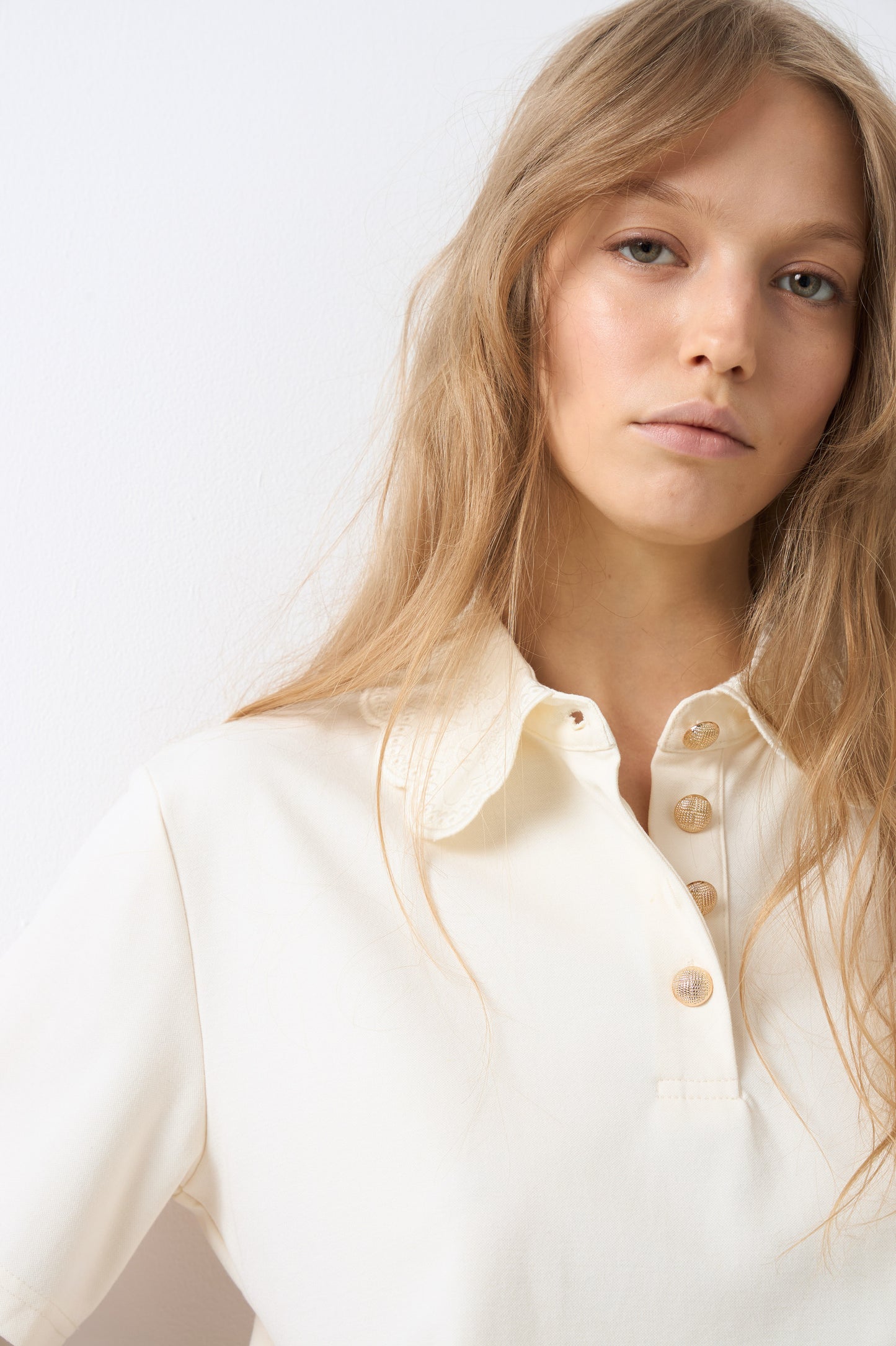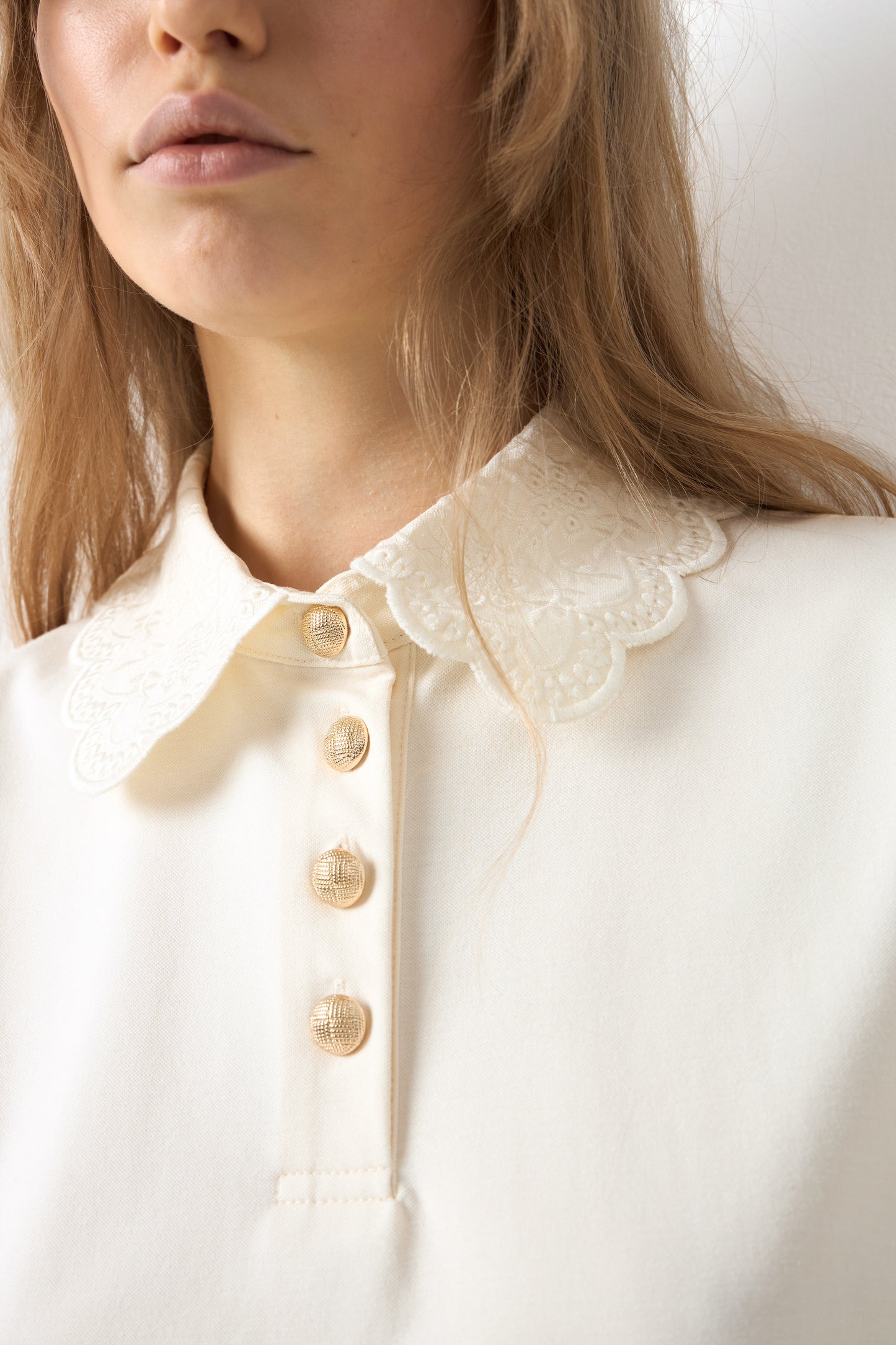 Regular-fit T-shirt in lightweight viscose blend jersey with a classic silhouette. Lace collar, placket with metal buttons, and short sleeves