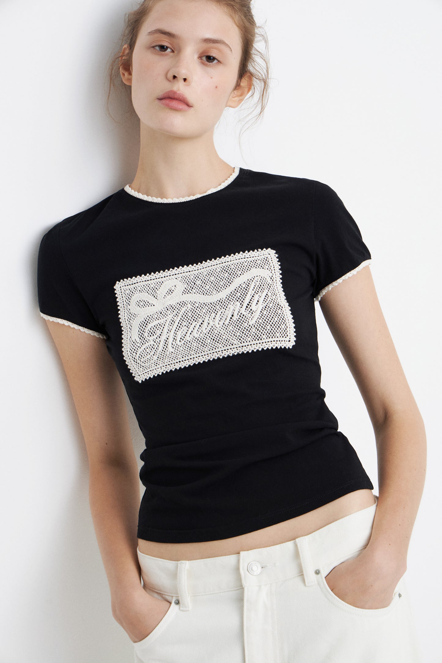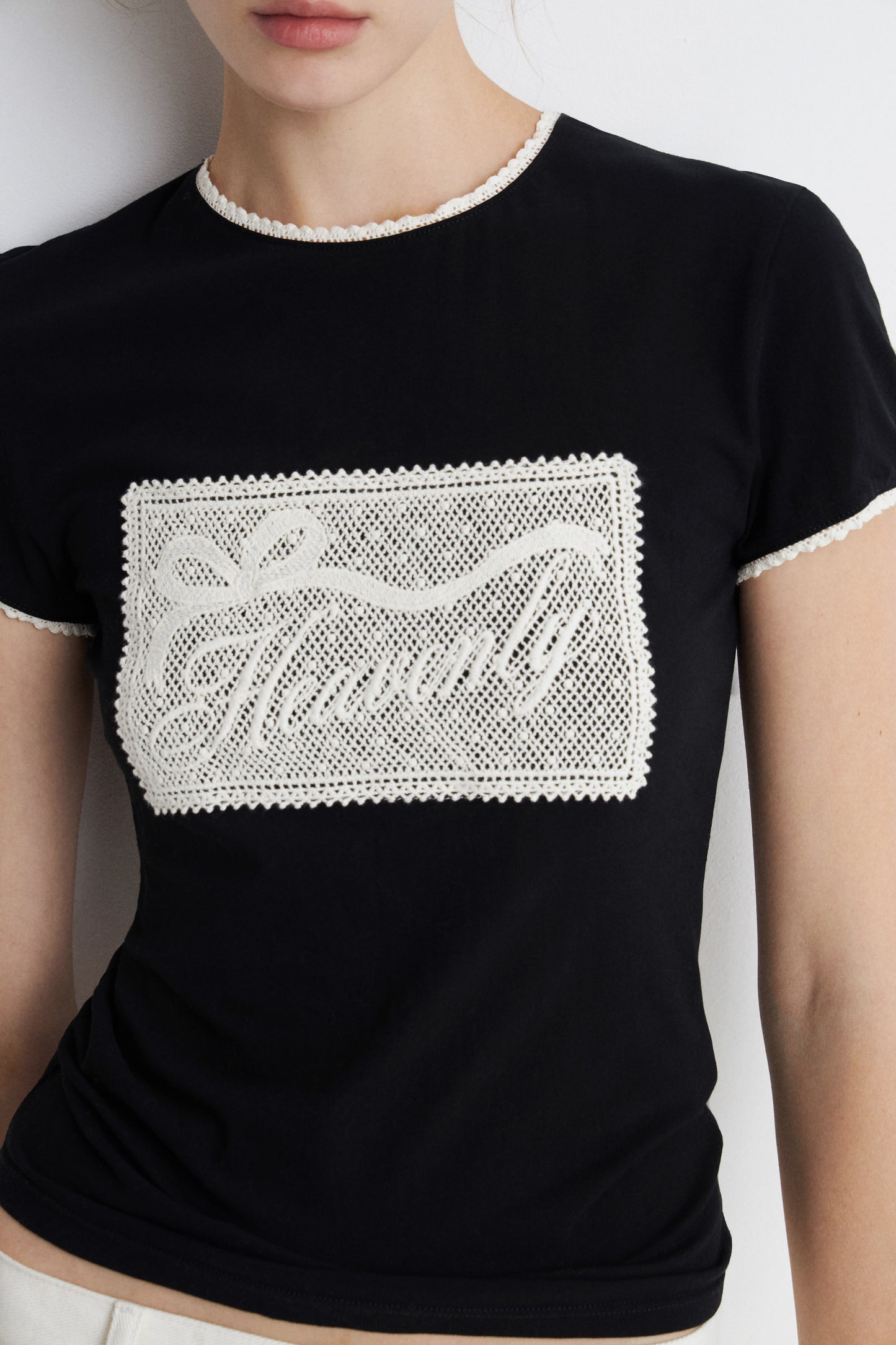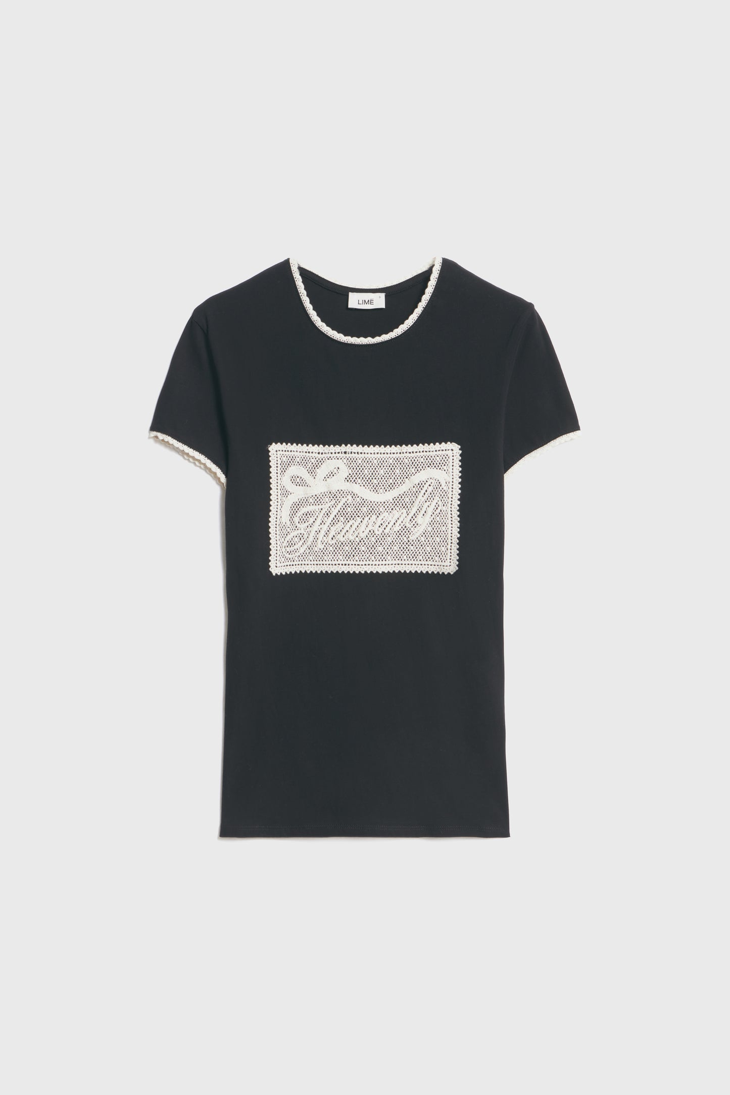 Fitted T-shirt in soft cotton jersey with a round neck and short sleeves. Featuring a contrast lace detail on the front.