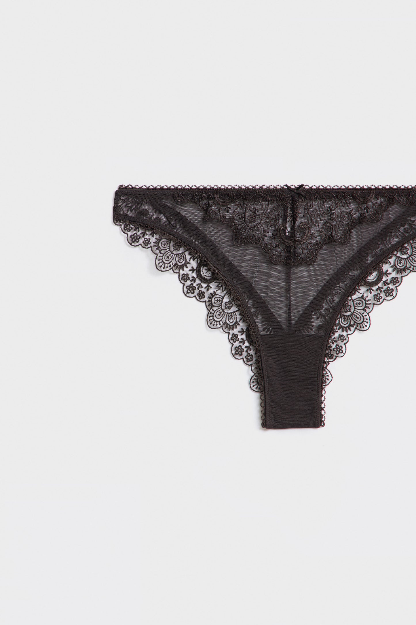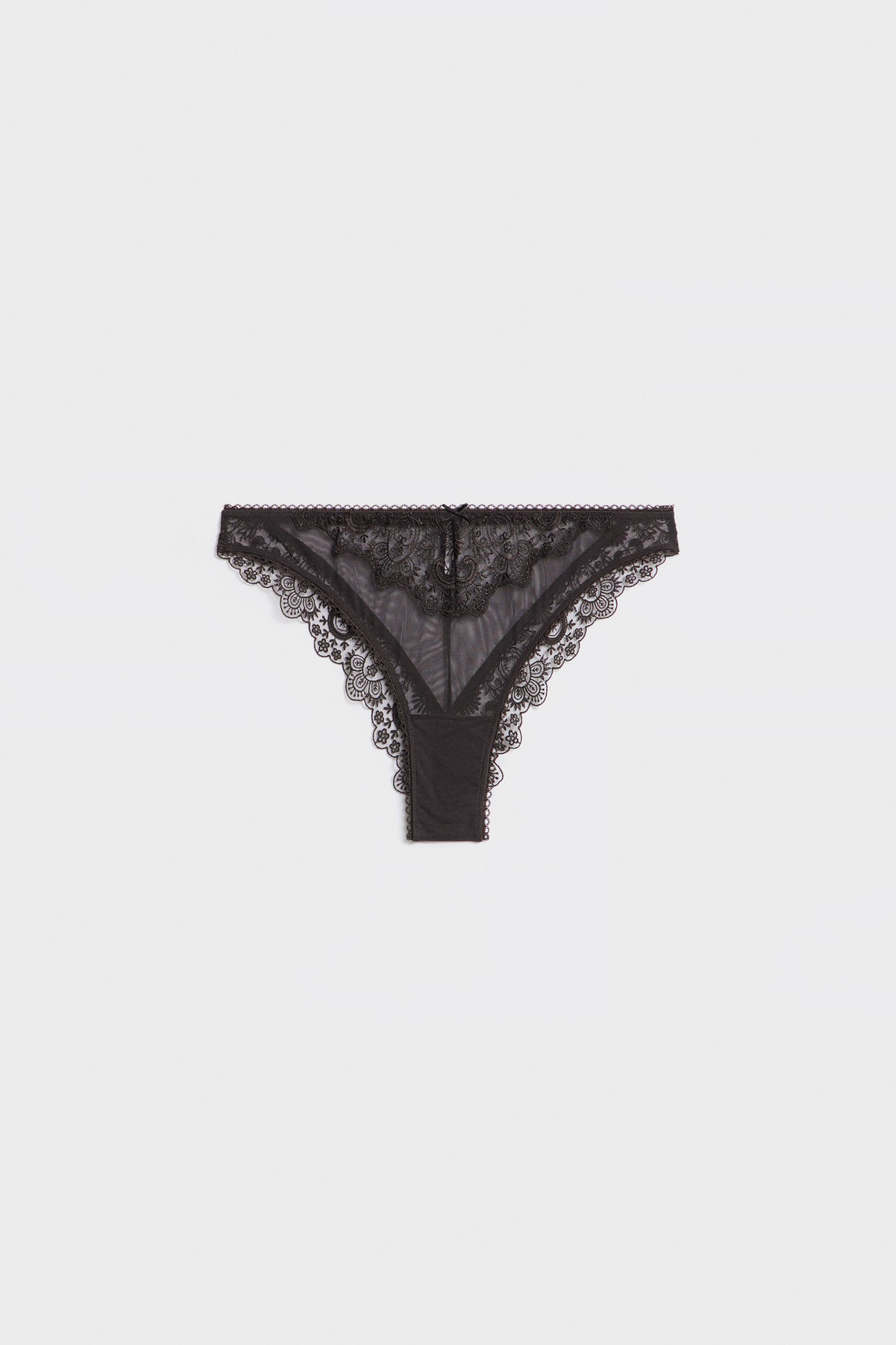 Mesh briefs with elastic waistband. Matching lace detail and contrasting bow appliqué. 100% cotton gusset.