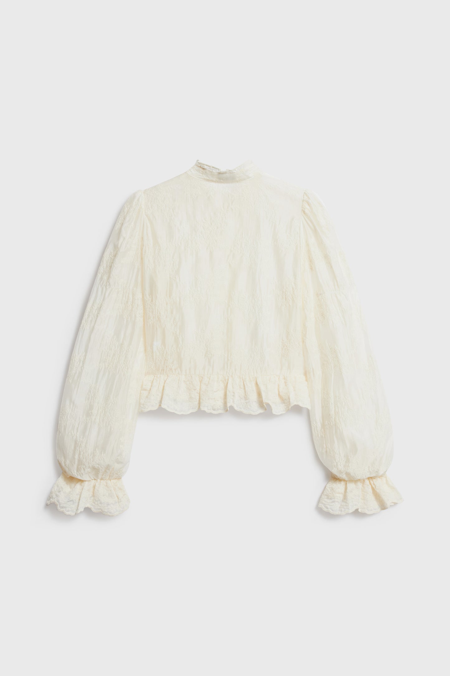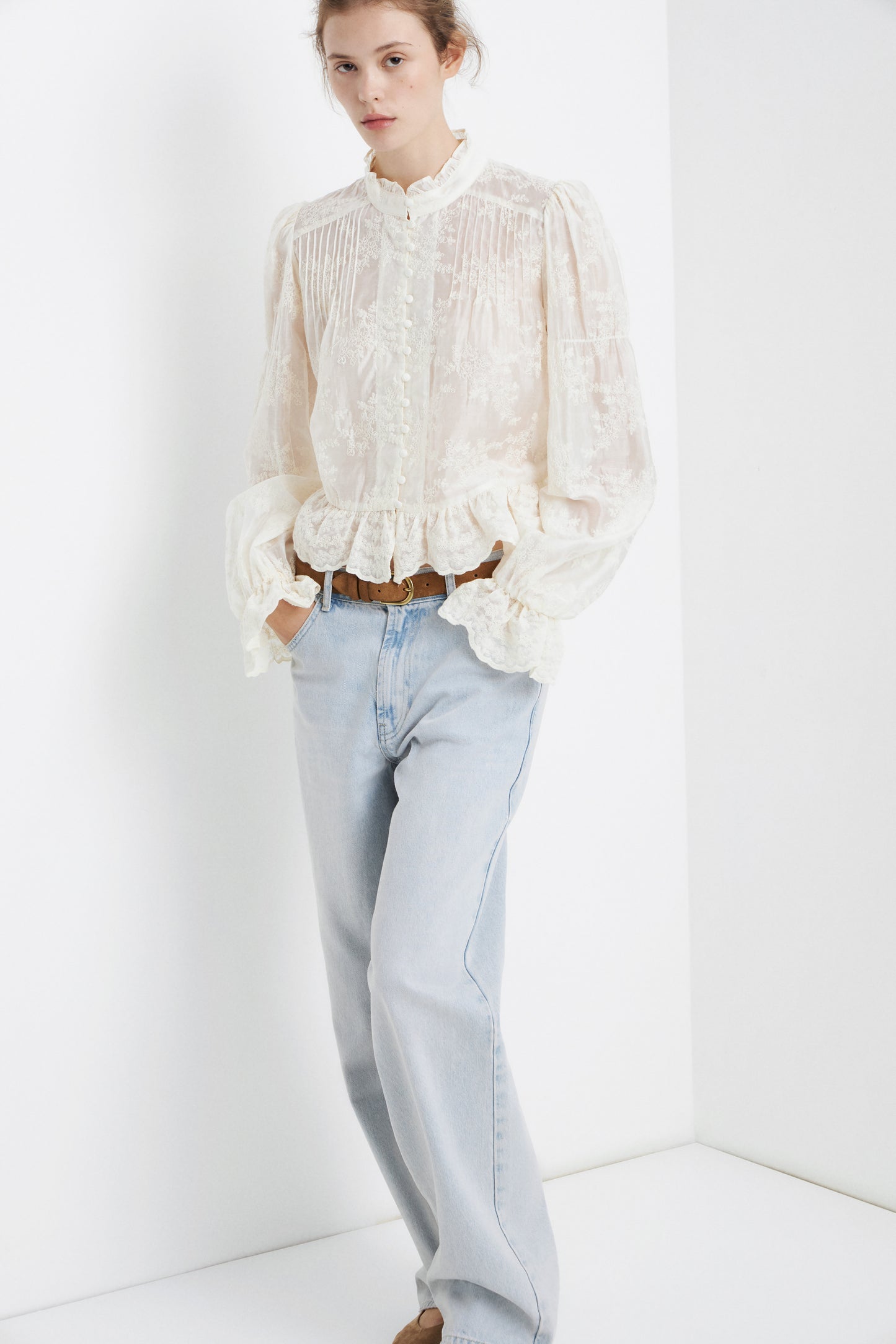 Retro-style blouse in a lyocell-blend with embroidery. Band collar, long puff sleeves and covered buttons. Pleated front details Ruffles at cuffs and hem.
